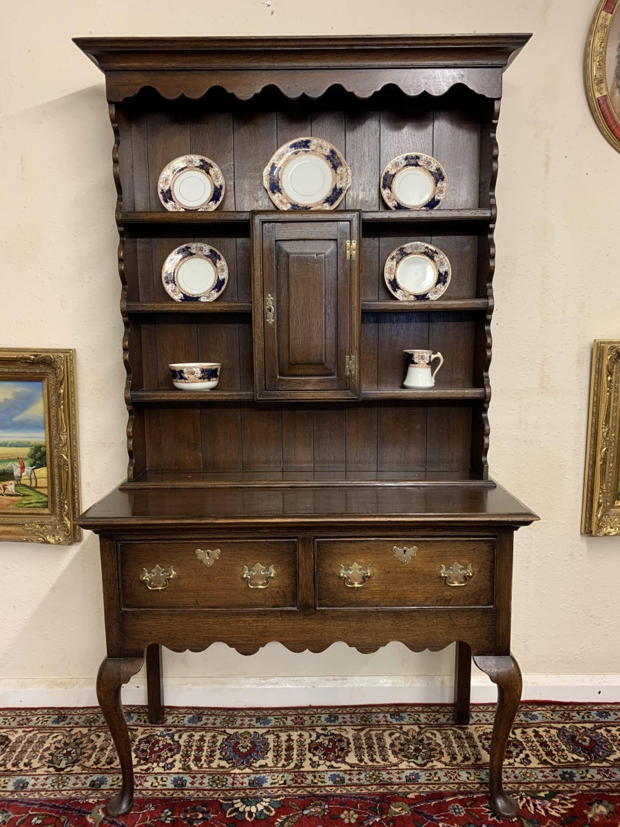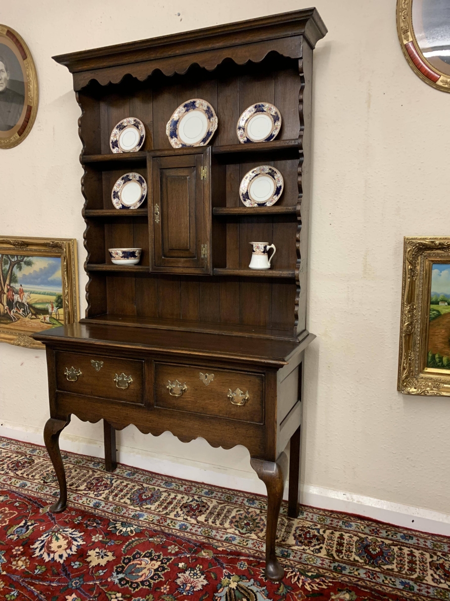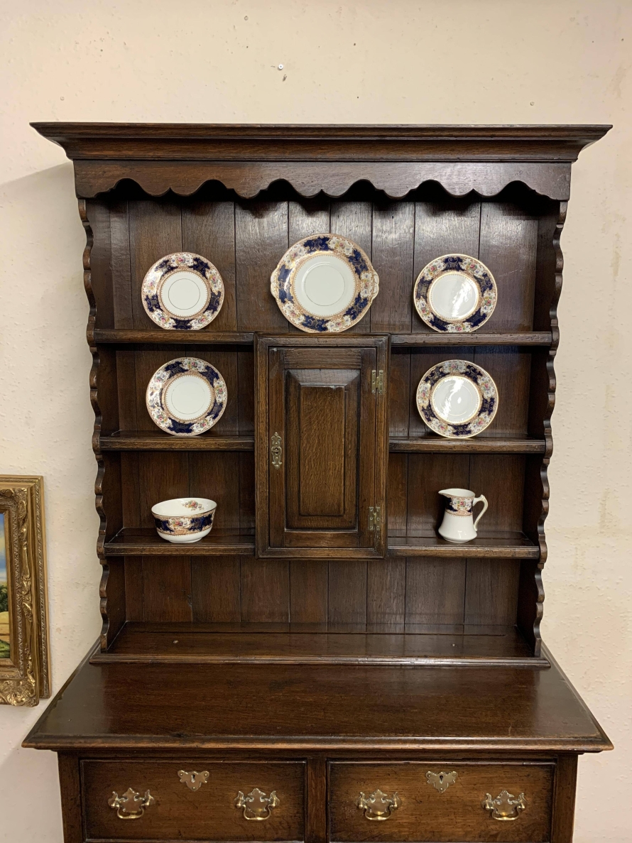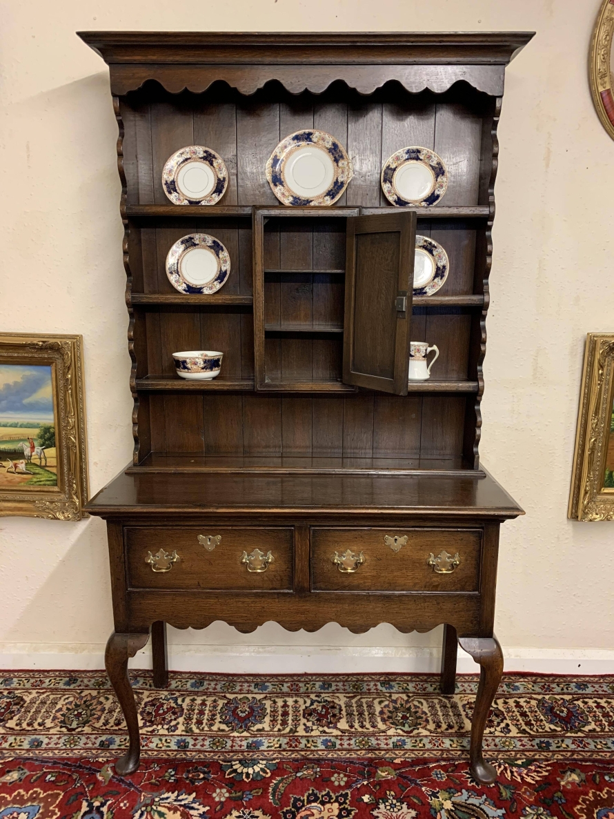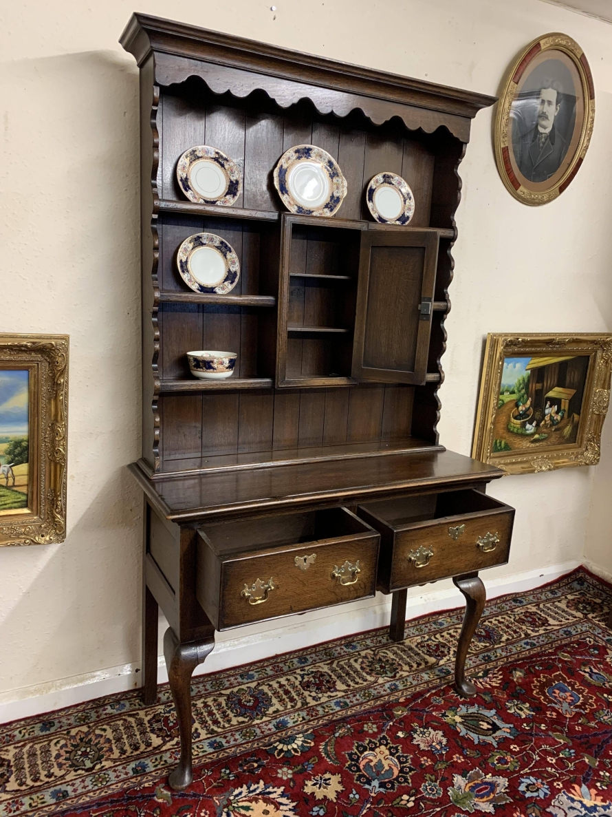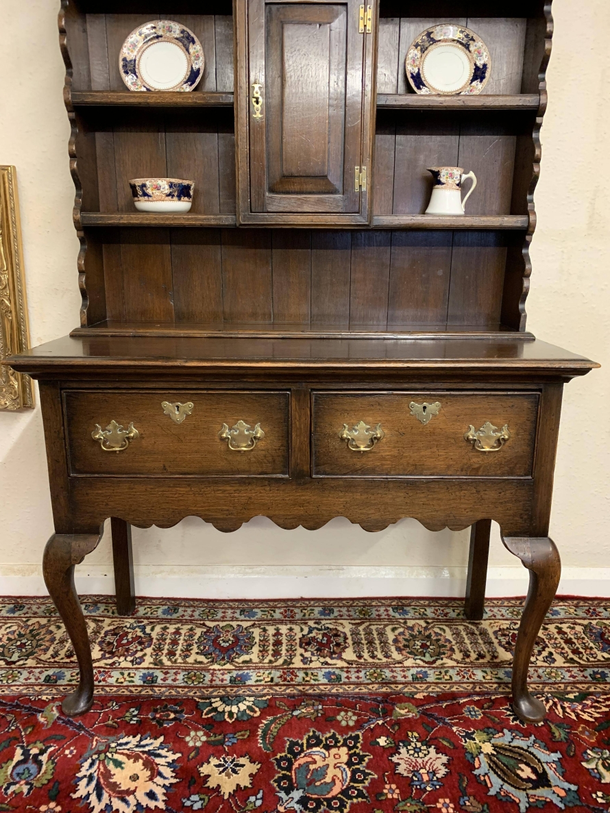 The dresser dates circa 1900 and is in excellent condition. The oversailing top has a wavy apron below. The shaped rack has four shelves with a lockable recessed panelled central door, the door having traditional brass H hinges, brass escutcheon and key. The door opens to reveal two shelves. The rack has a boarded back. The base has two drawers, each drawer having a pair of brass handles and brass escutcheon. This lovely dresser stands on two shaped cabriole legs to the front