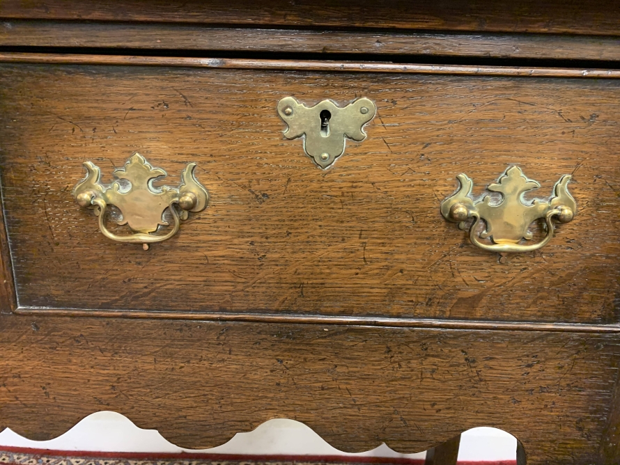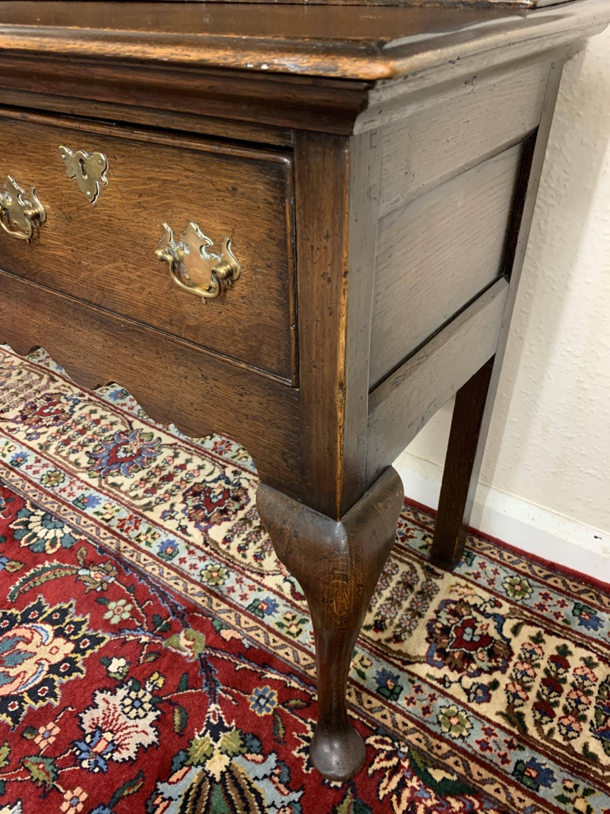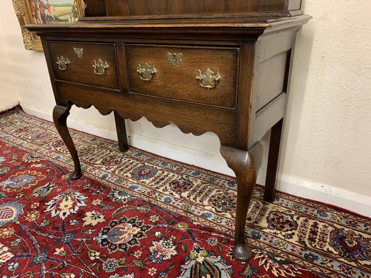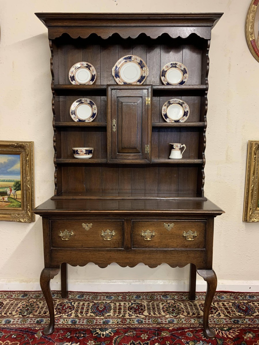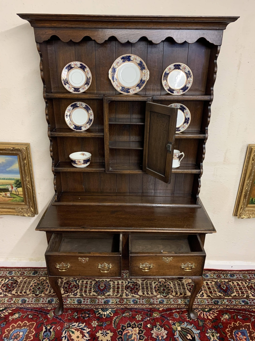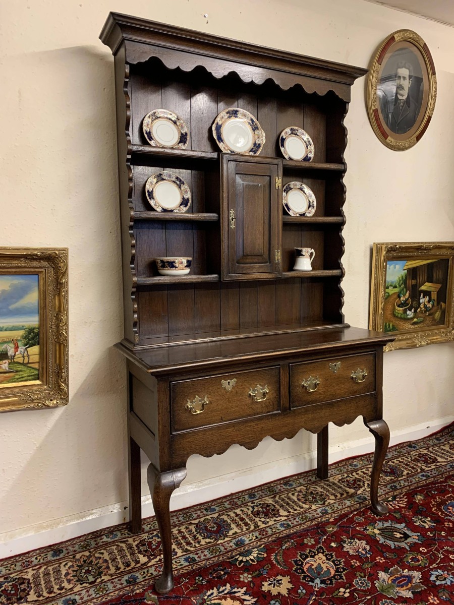 The dresser dates circa 1900 and is in excellent condition. The oversailing top has a wavy apron below. The shaped rack has four shelves with a lockable recessed panelled central door, the door having traditional brass H hinges, brass escutcheon and key. The door opens to reveal two shelves. The rack has a boarded back. The base has two drawers, each drawer having a pair of brass handles and brass escutcheon. This lovely dresser stands on two shaped cabriole legs to the front