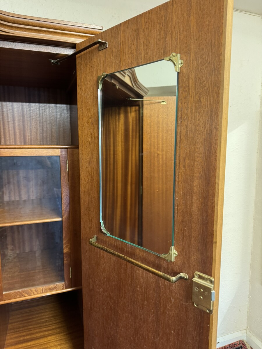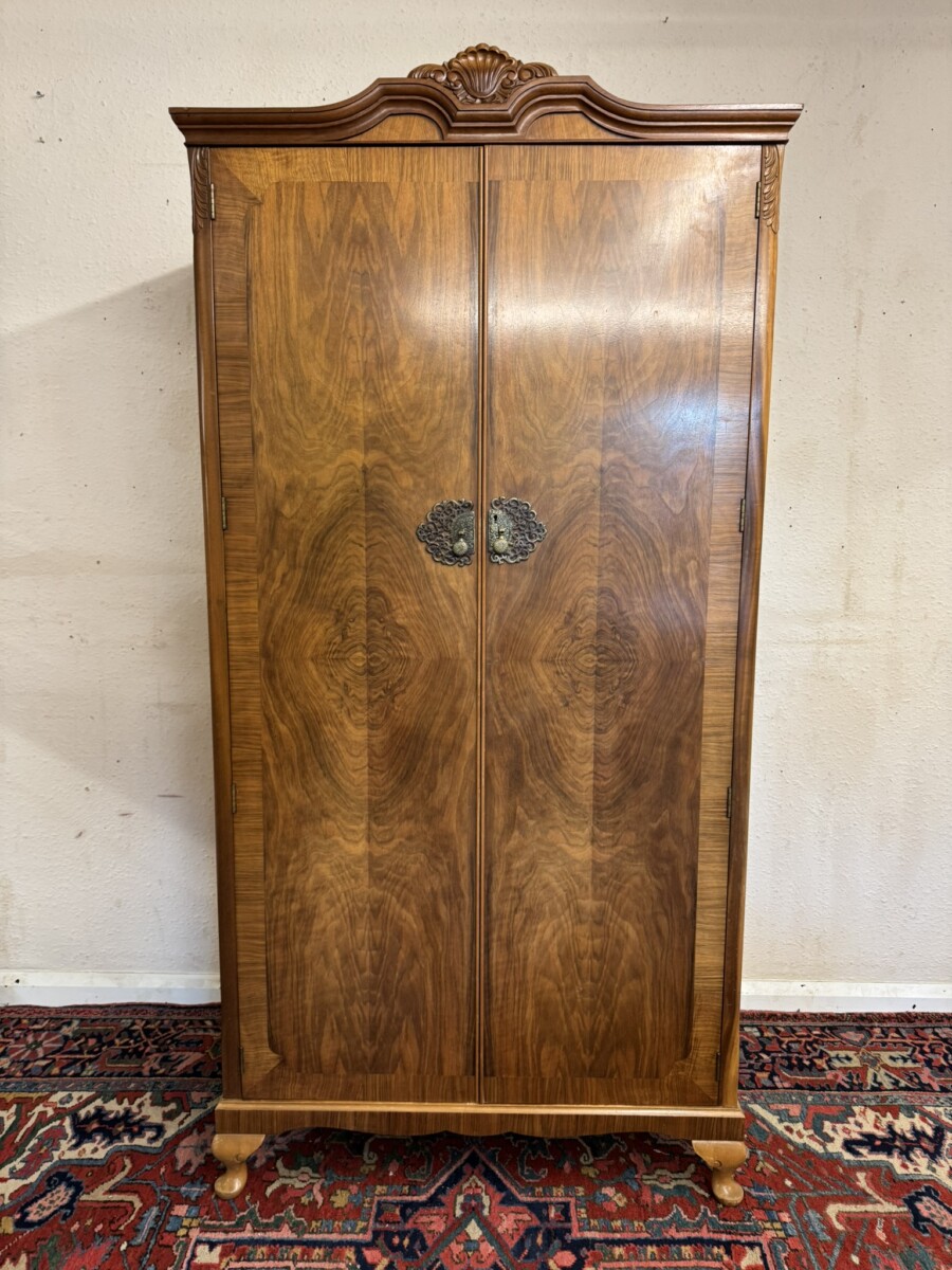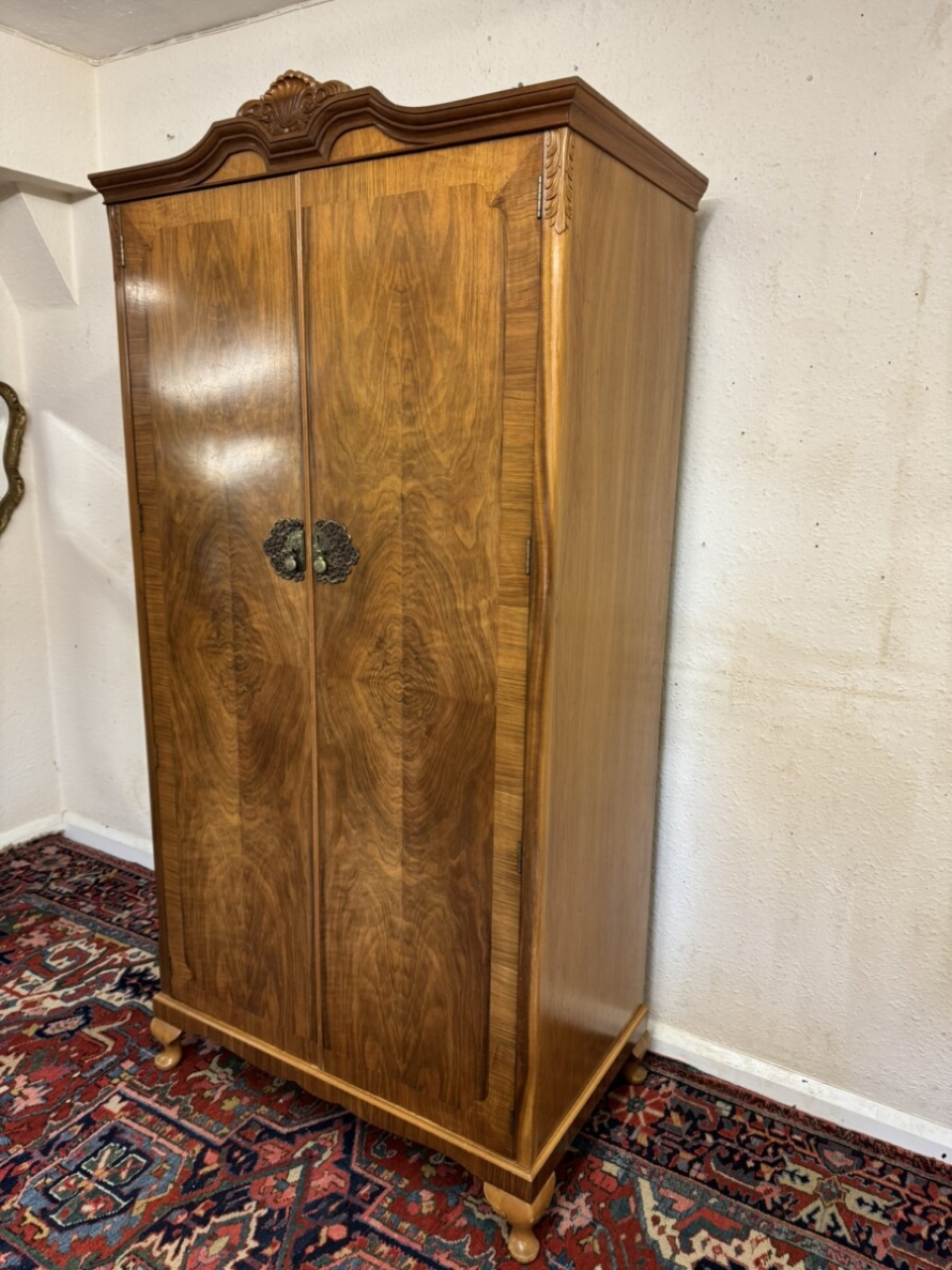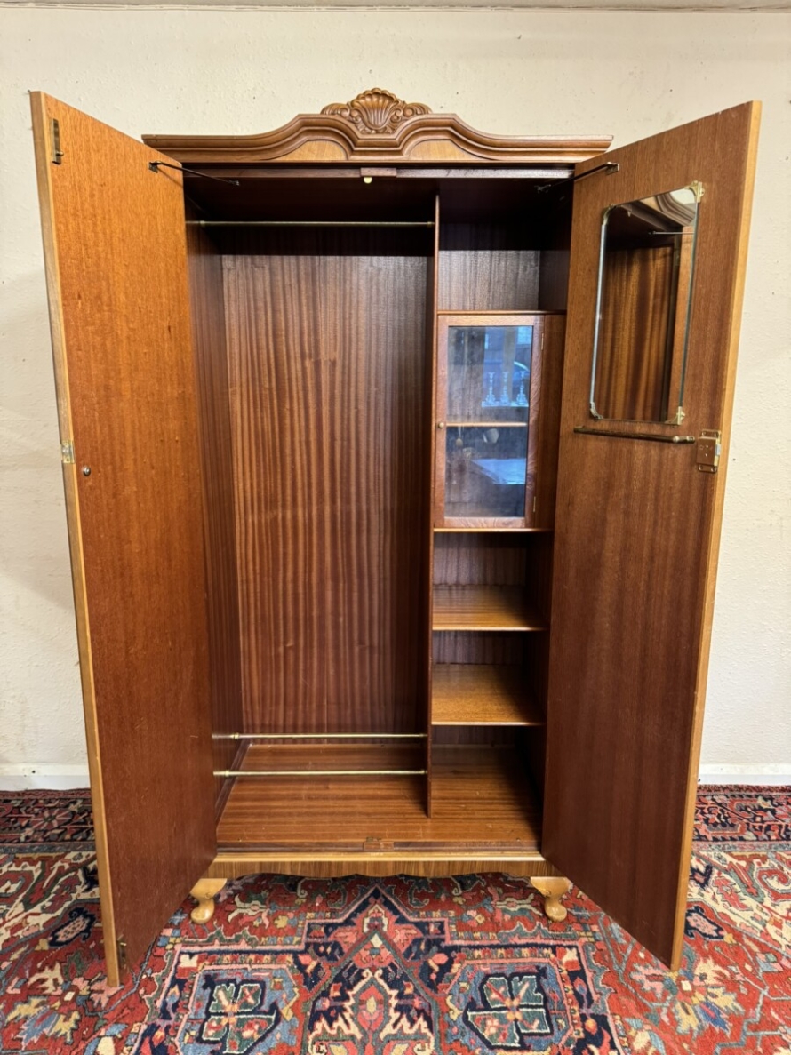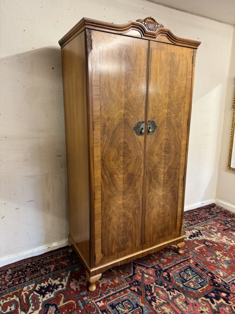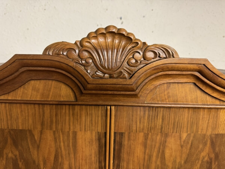 This fabulous wardrobe dates circa 1930. The shaped oversailing top rises to a decorative central carving. ,below are a pair of striking walnut doors, each door having an ornate brass escutcheon and drop handle. The doors open to reveal a brass hanging rail with brass shoe rails below. To the right is an open section which sits above a glazed door the door opens to reveal a shelf. There are three open storage sections below. Behind the right-hand door is a dressing mirror with brass tie rack below. This super gentleman’s fitted wardrobe sits on four cabriole shaped legs.