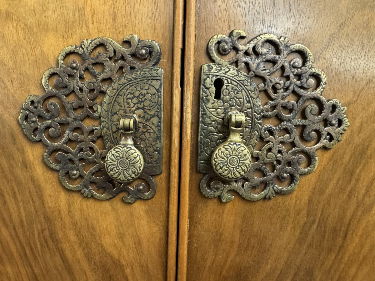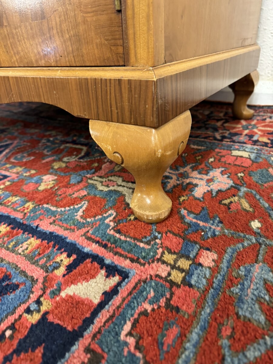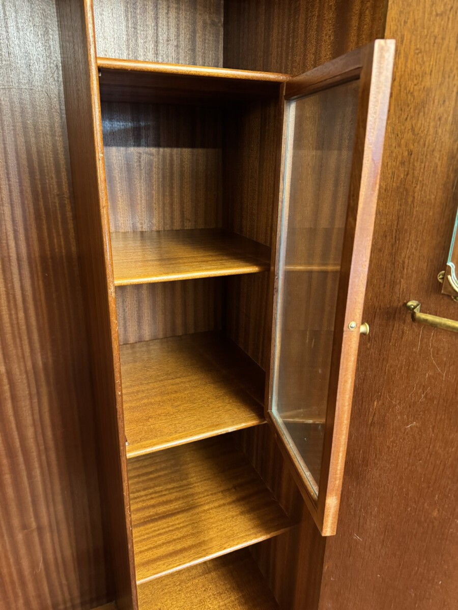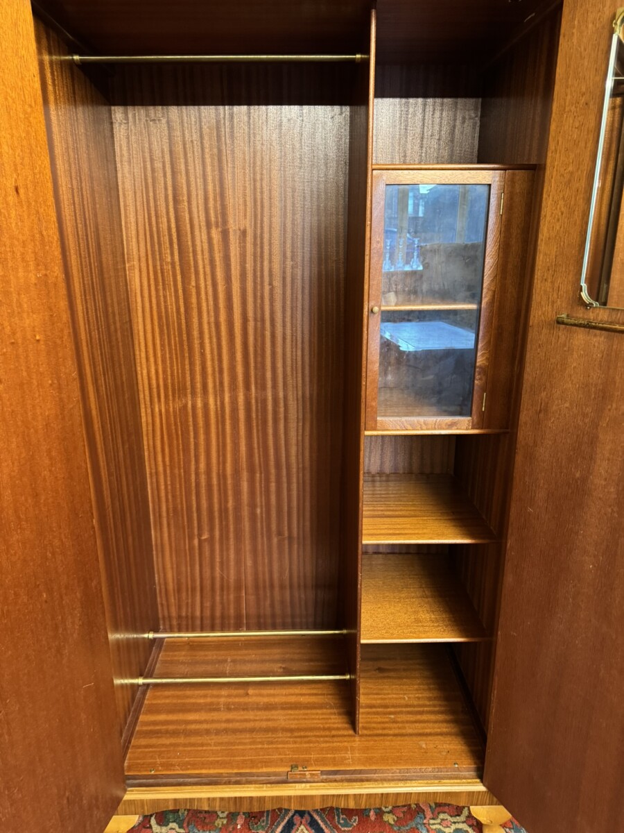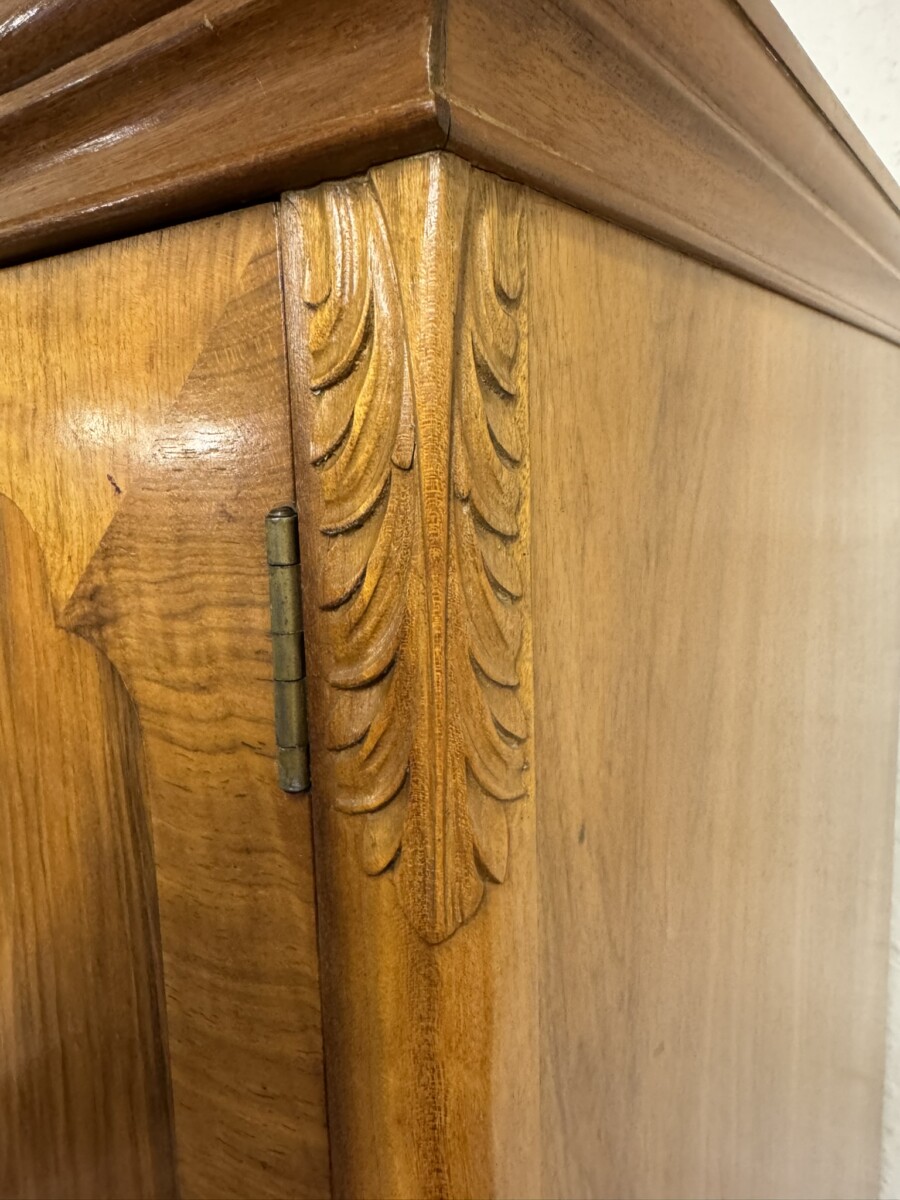 This fabulous wardrobe dates circa 1930. The shaped oversailing top rises to a decorative central carving. ,below are a pair of striking walnut doors, each door having an ornate brass escutcheon and drop handle. The doors open to reveal a brass hanging rail with brass shoe rails below. To the right is an open section which sits above a glazed door the door opens to reveal a shelf. There are three open storage sections below. Behind the right-hand door is a dressing mirror with brass tie rack below. This super gentleman’s fitted wardrobe sits on four cabriole shaped legs.