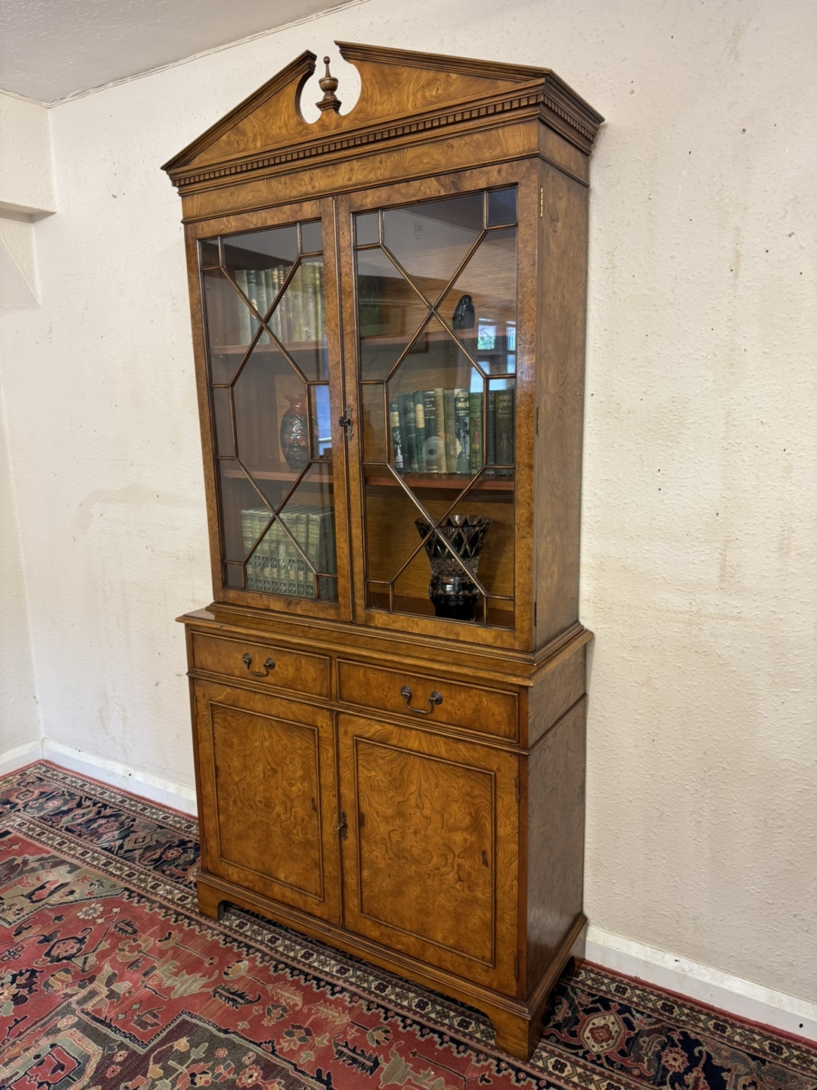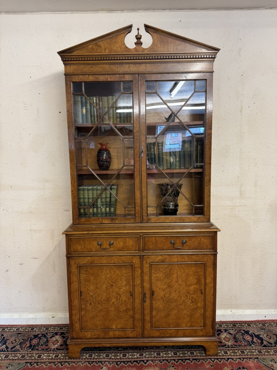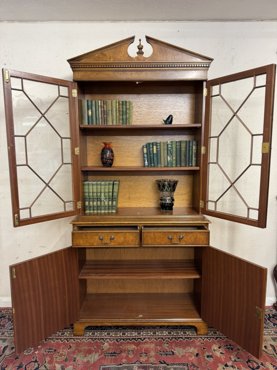 The crown top has a central finial, below are a pair of lockable glazed doors, the doors having wood barring decoration. The doors open to reveal two adjustable yet removable shelves. Two drawers below each with a brass handle sitting above a pair of lockable cupboard doors, the doors open to reveal a removable shelf. This fine cabinet stands on four bracket feet.