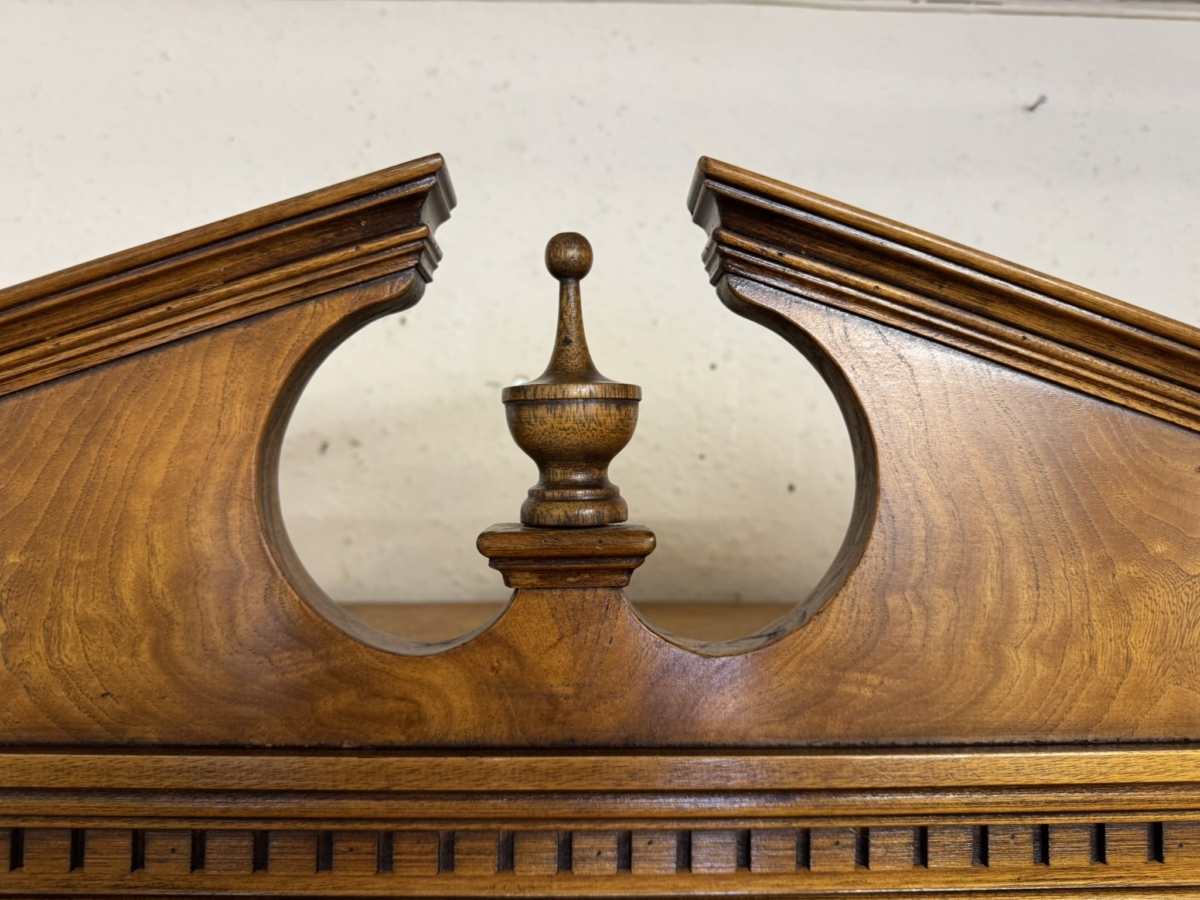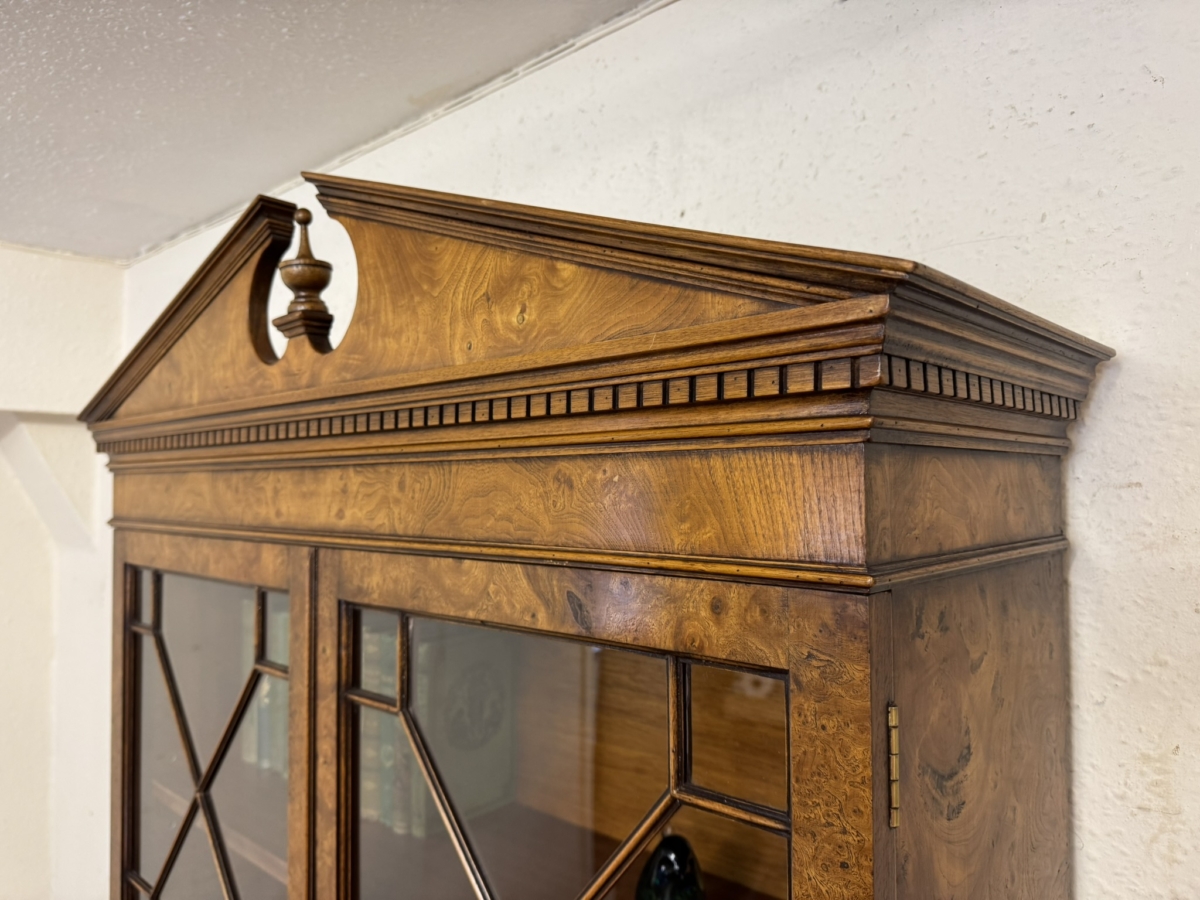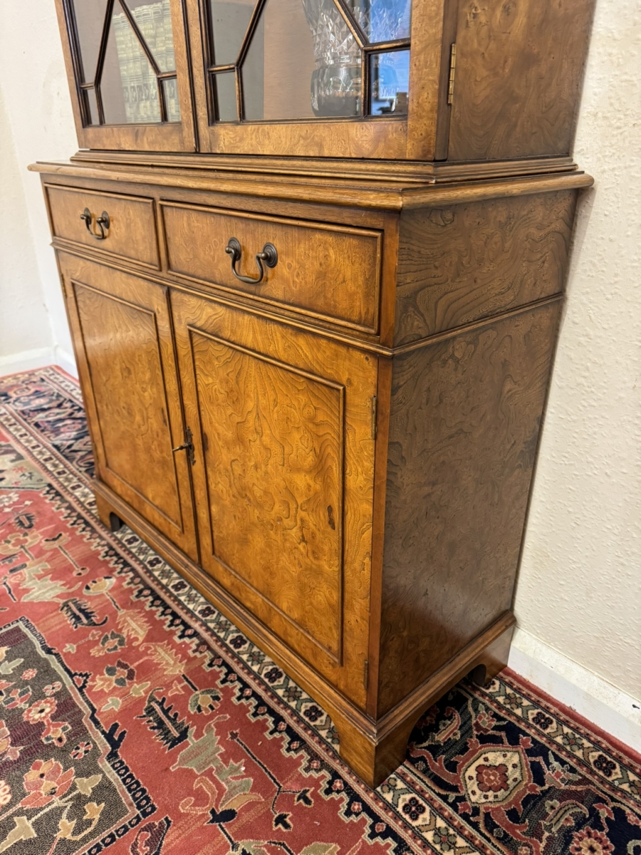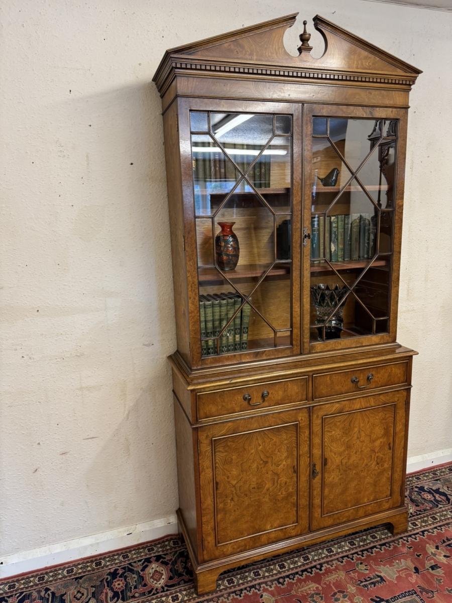 The crown top has a central finial, below are a pair of lockable glazed doors, the doors having wood barring decoration. The doors open to reveal two adjustable yet removable shelves. Two drawers below each with a brass handle sitting above a pair of lockable cupboard doors, the doors open to reveal a removable shelf. This fine cabinet stands on four bracket feet.