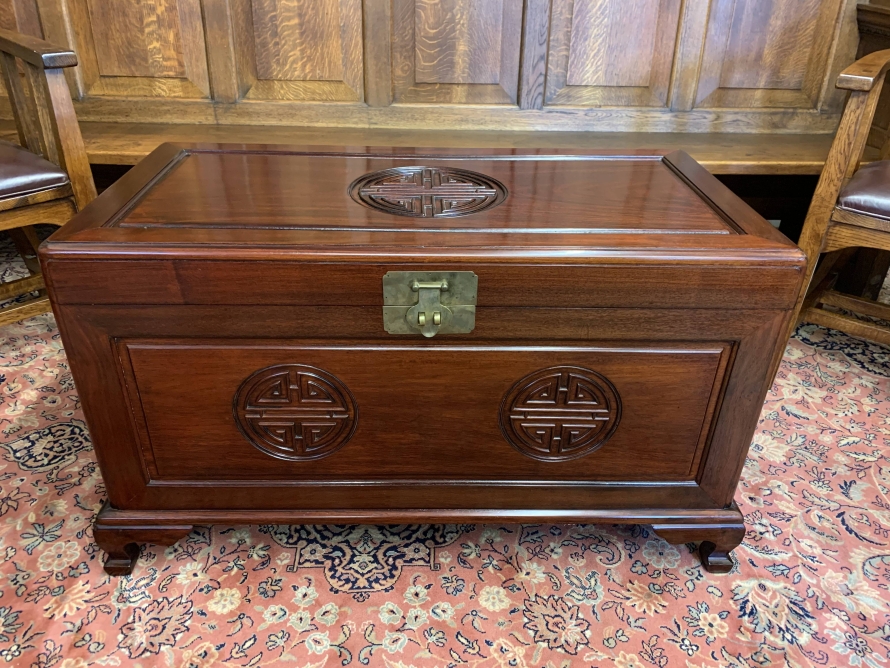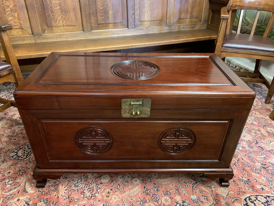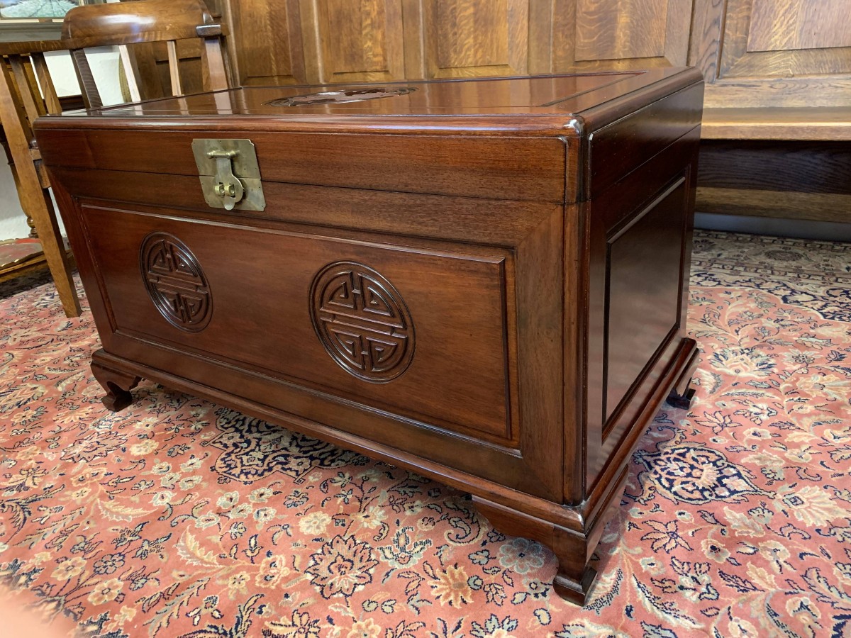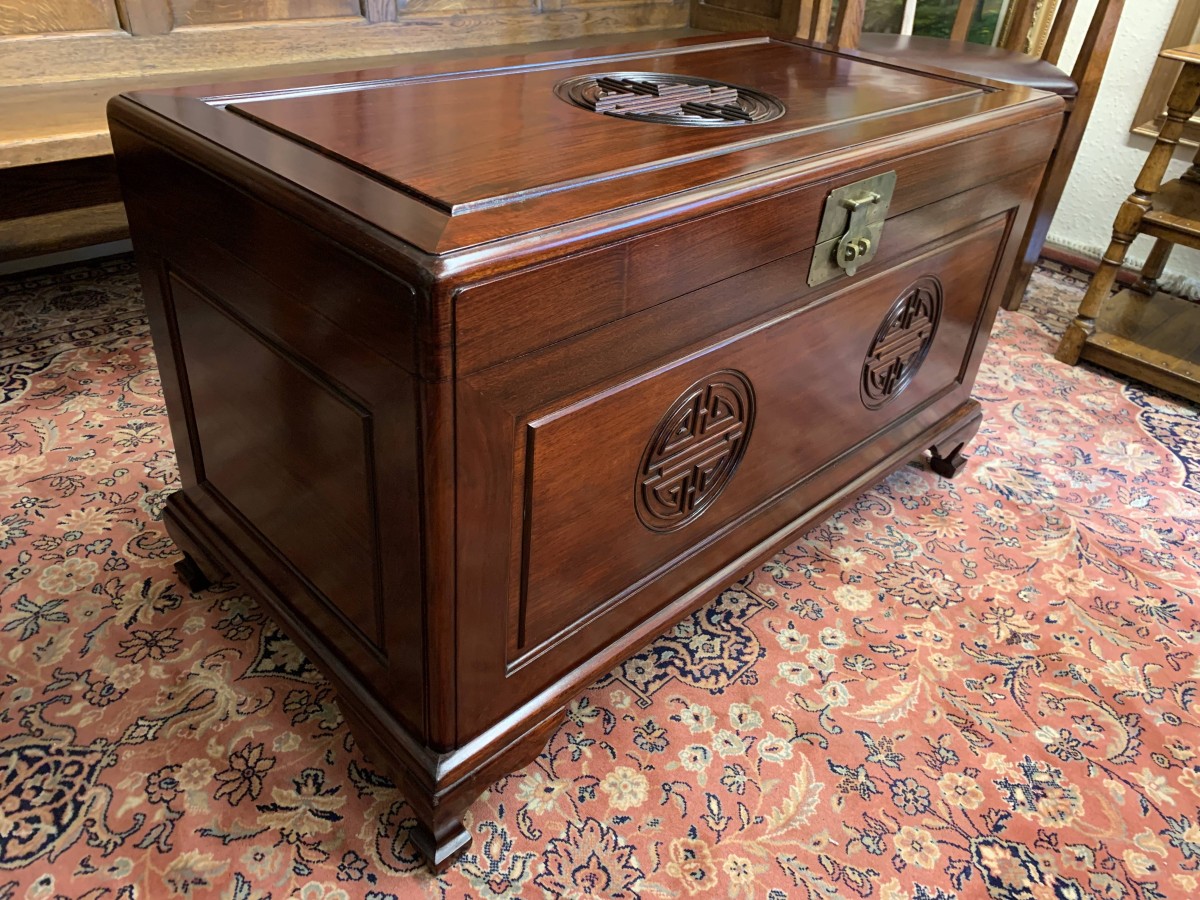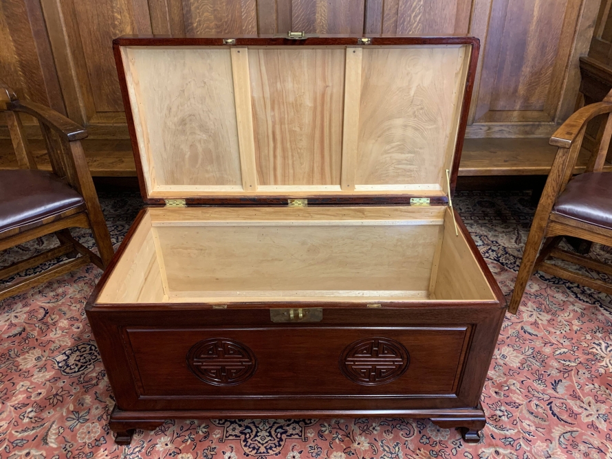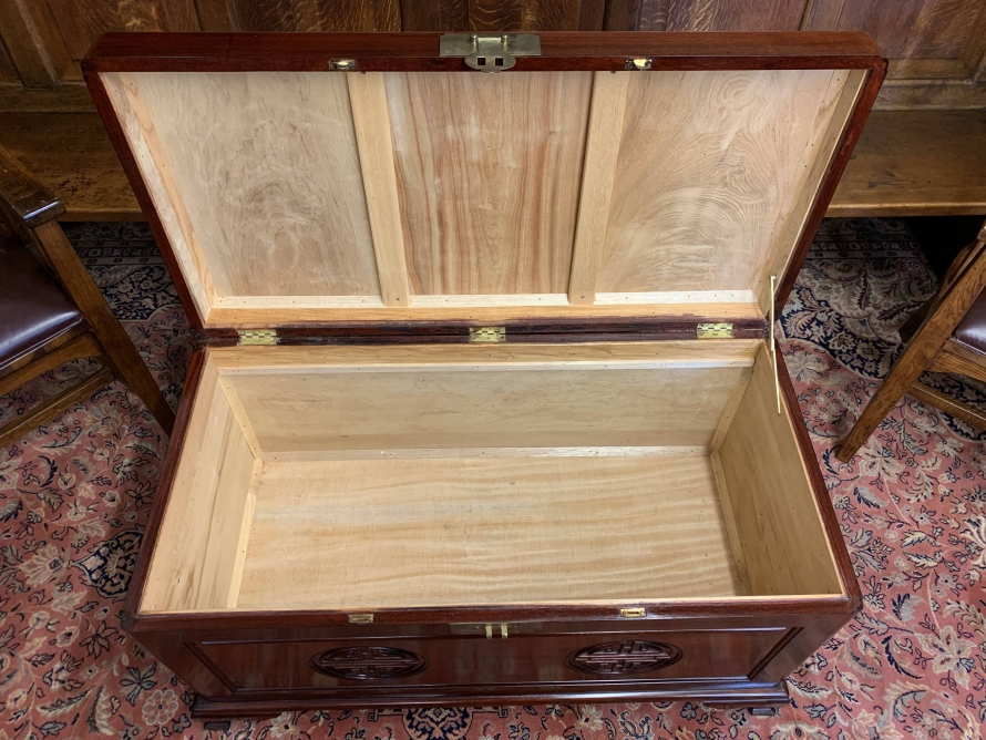 The chest is in excellent condition. The carved lift up lid opens to reveal a camphor wood interior. Carved panel to the front, panelled sides chest sits on four shaped legs to the front.
