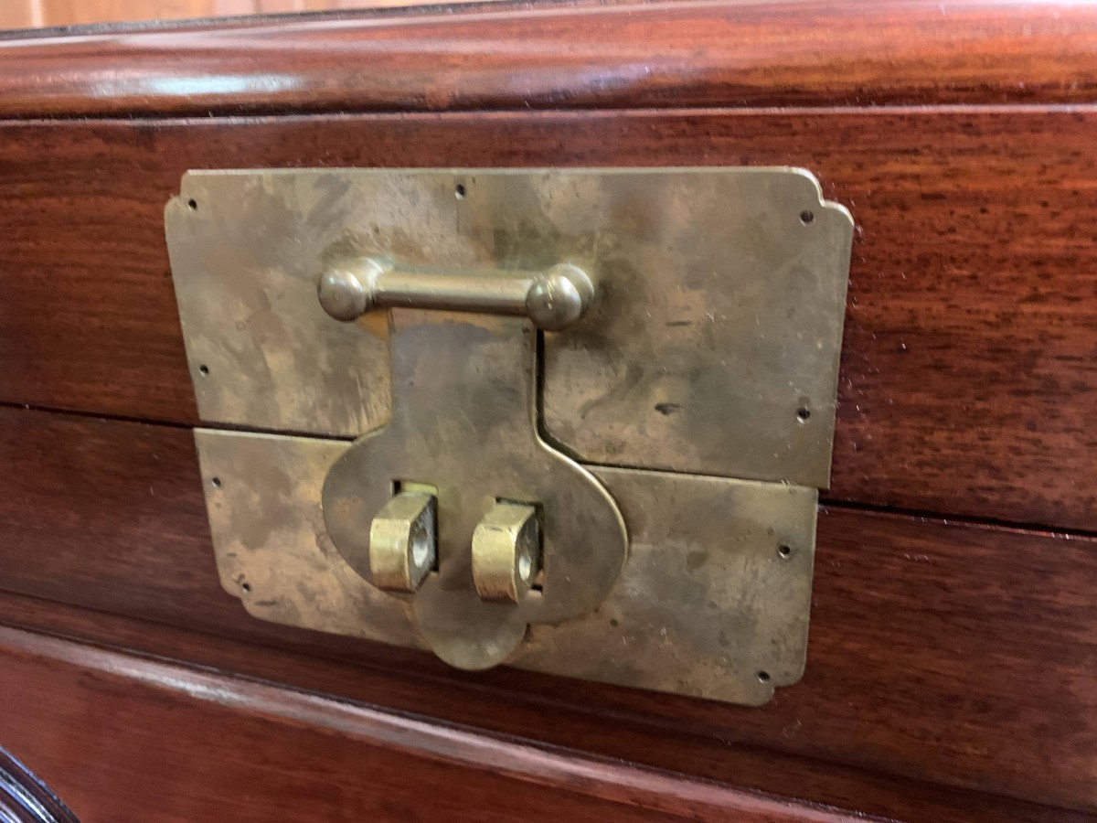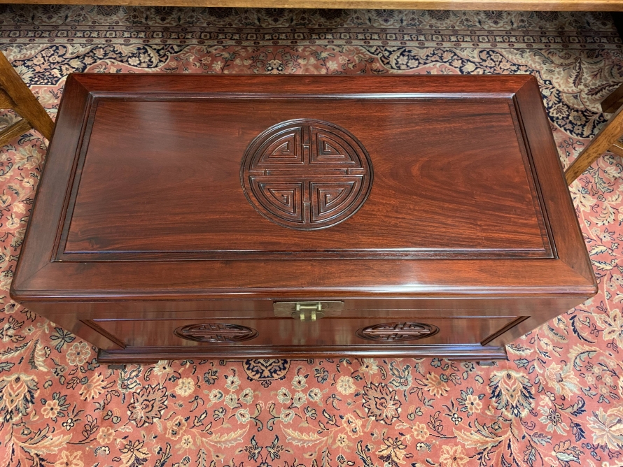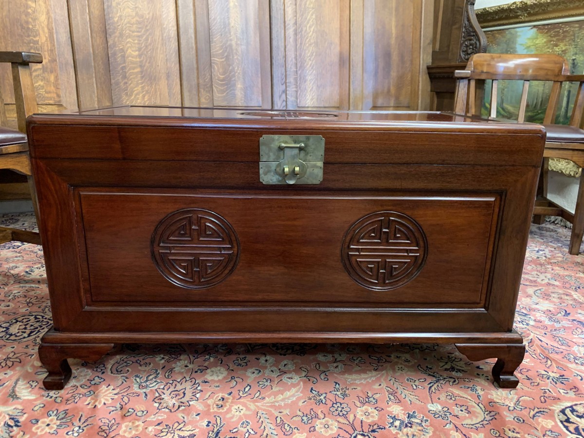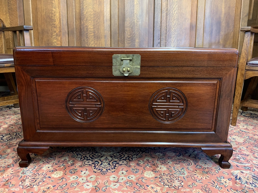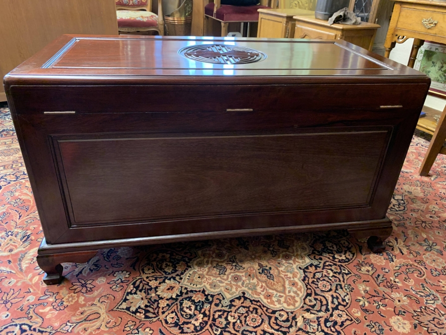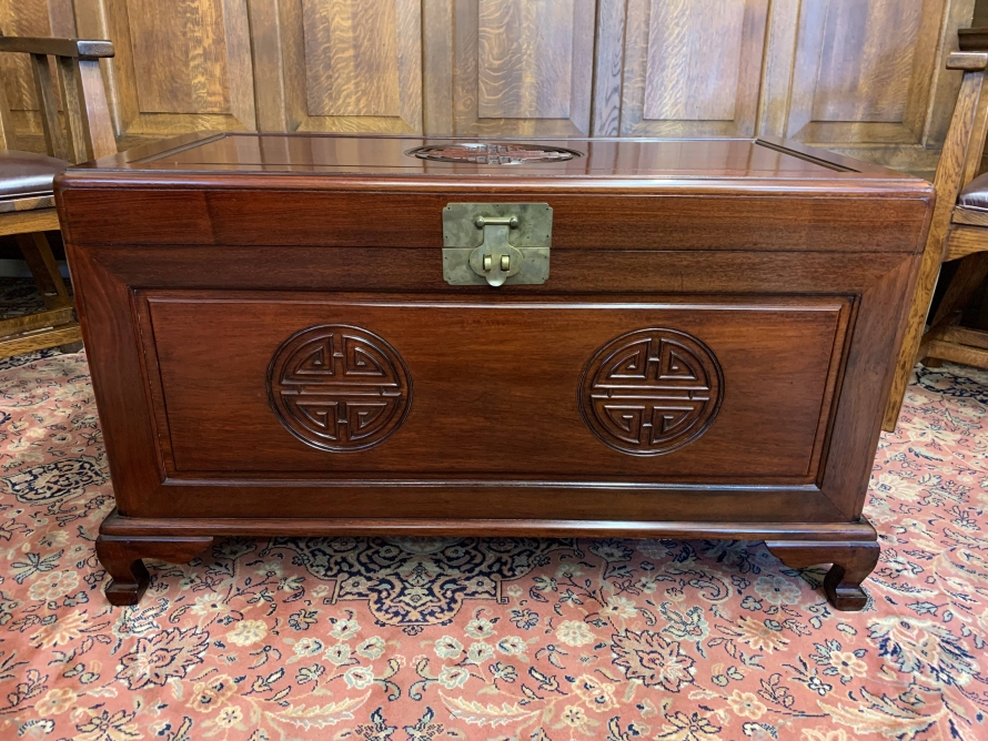 The chest is in excellent condition. The carved lift up lid opens to reveal a camphor wood interior. Carved panel to the front, panelled sides chest sits on four shaped legs to the front.