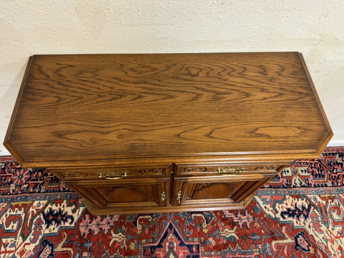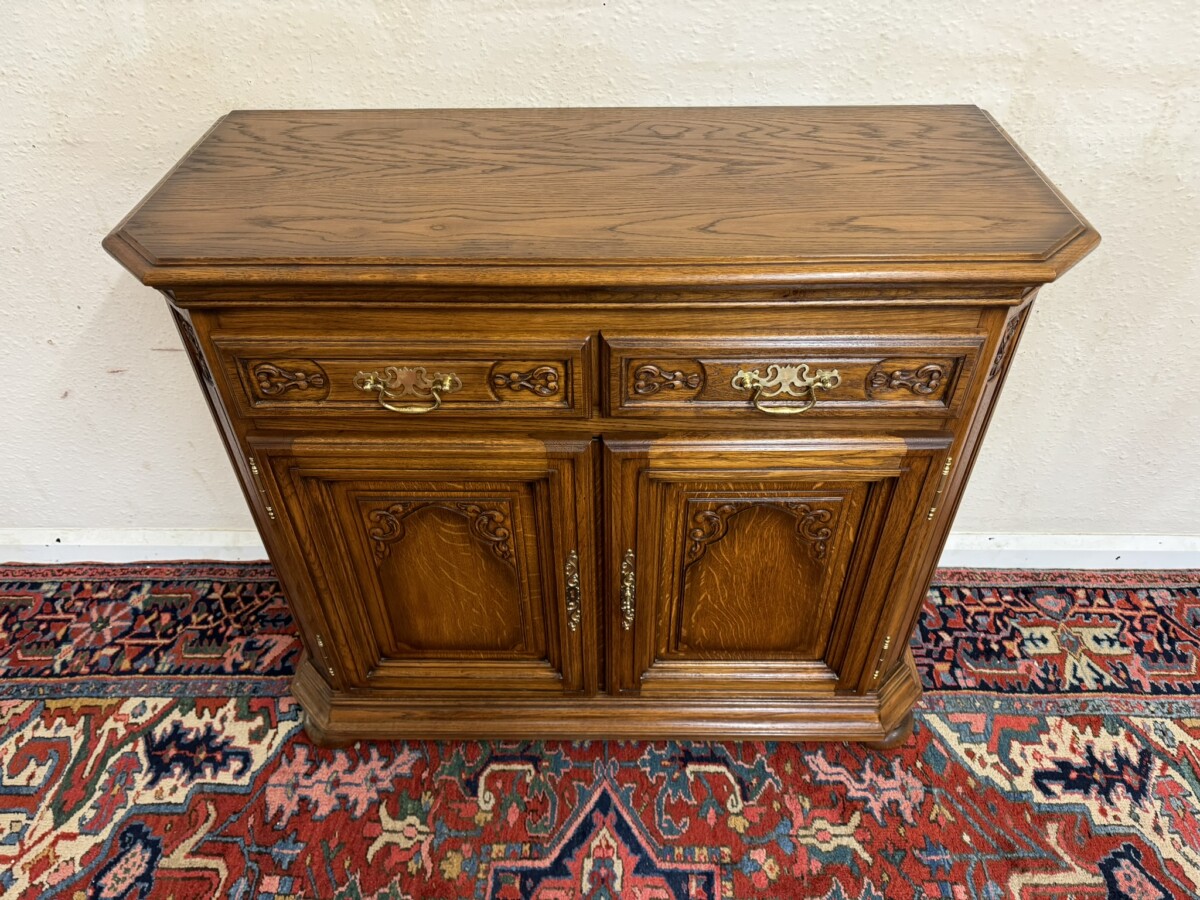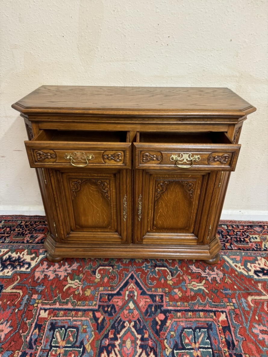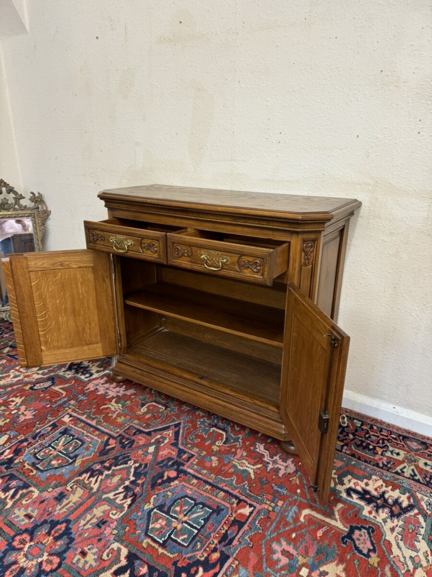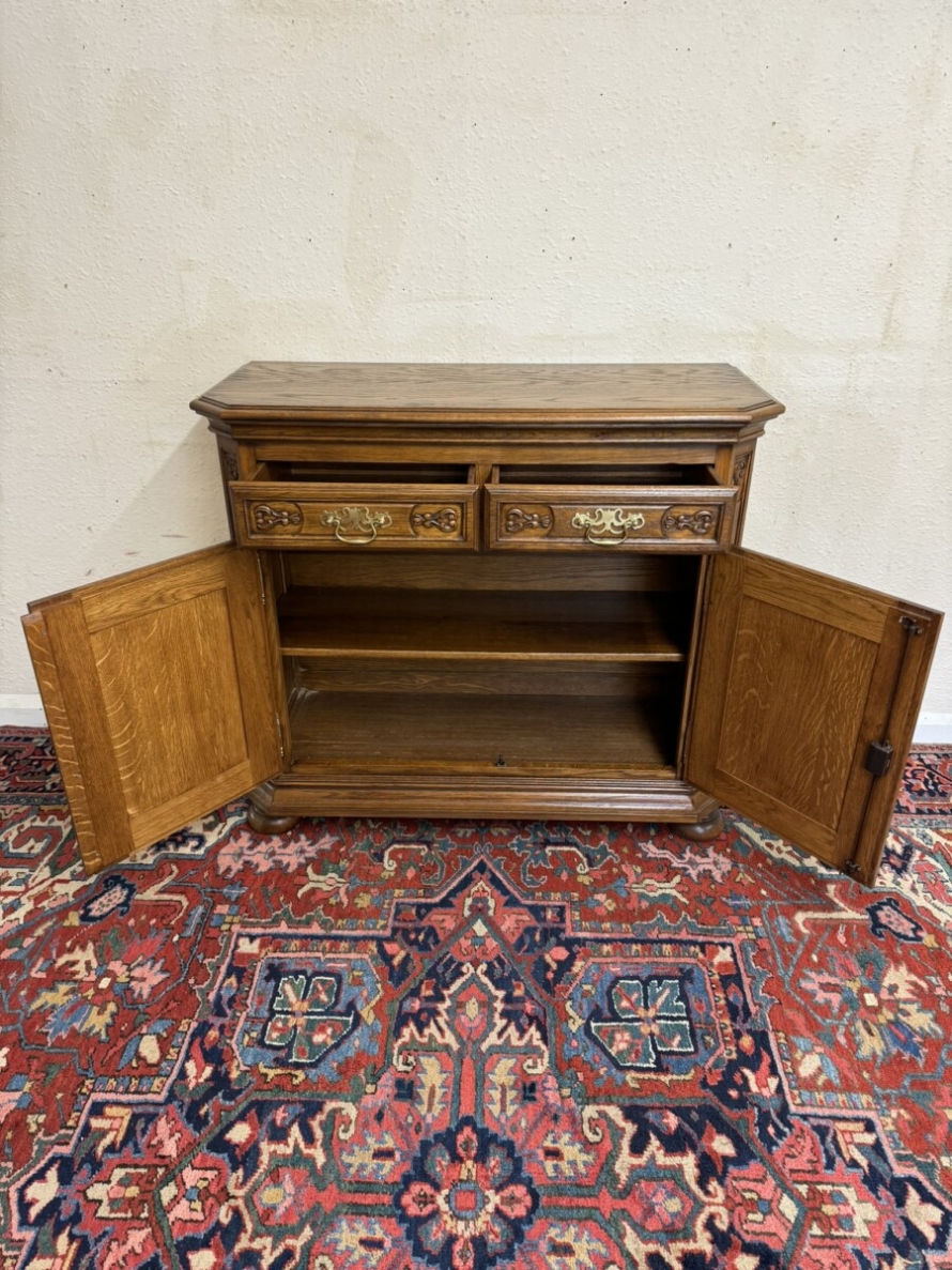 The oversailing top has front canted corners, below are a pair of carved drawers, each drawer has a brass handle, below are a pair of lockable carved panelled doors, the doors open to reveal a removable shelf. Fielded panelled sides and standing on two bun feet to the front.