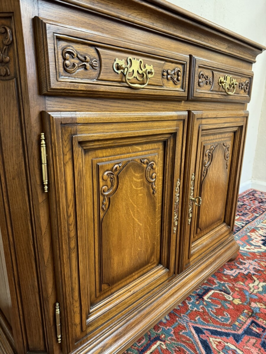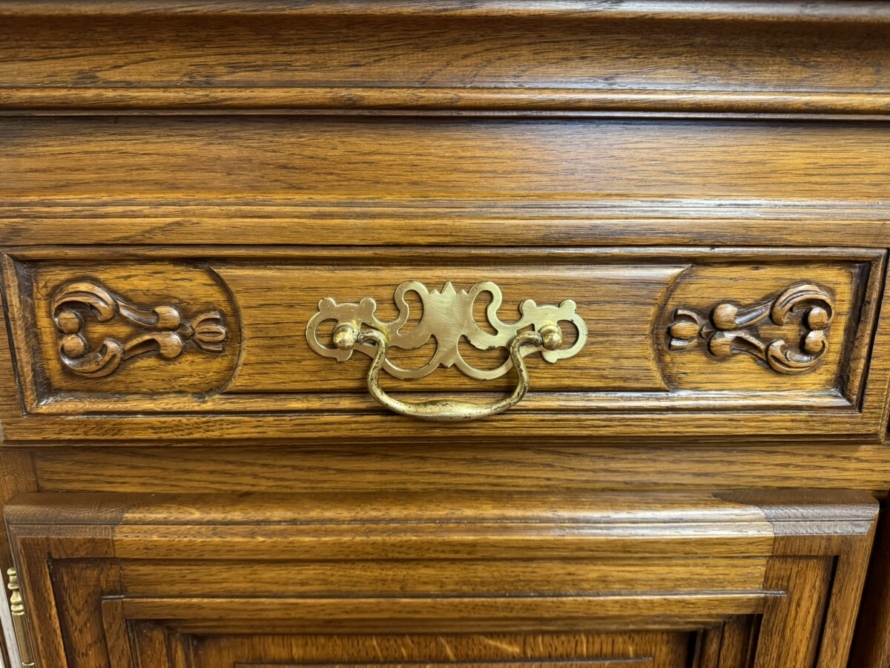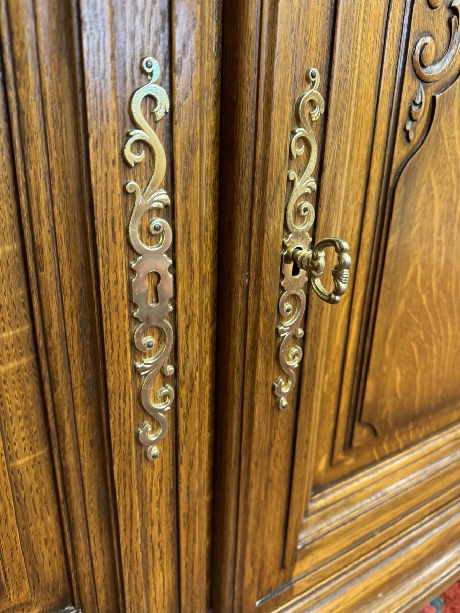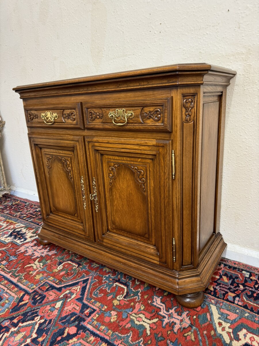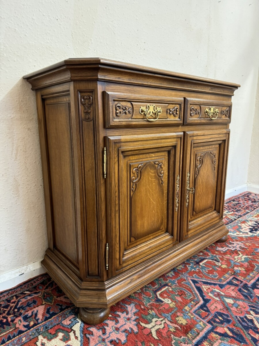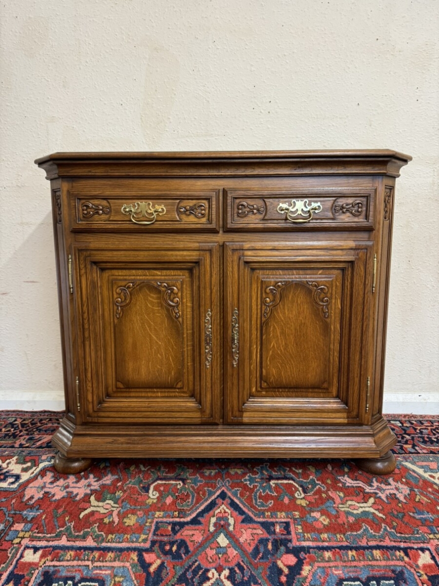 The oversailing top has front canted corners, below are a pair of carved drawers, each drawer has a brass handle, below are a pair of lockable carved panelled doors, the doors open to reveal a removable shelf. Fielded panelled sides and standing on two bun feet to the front.