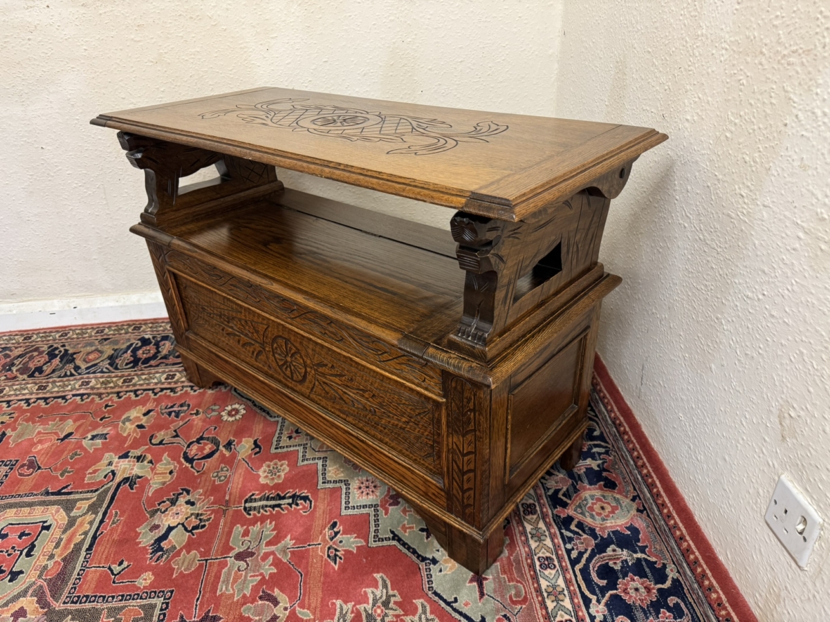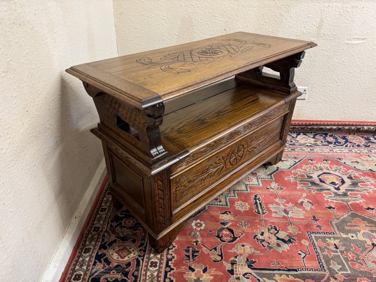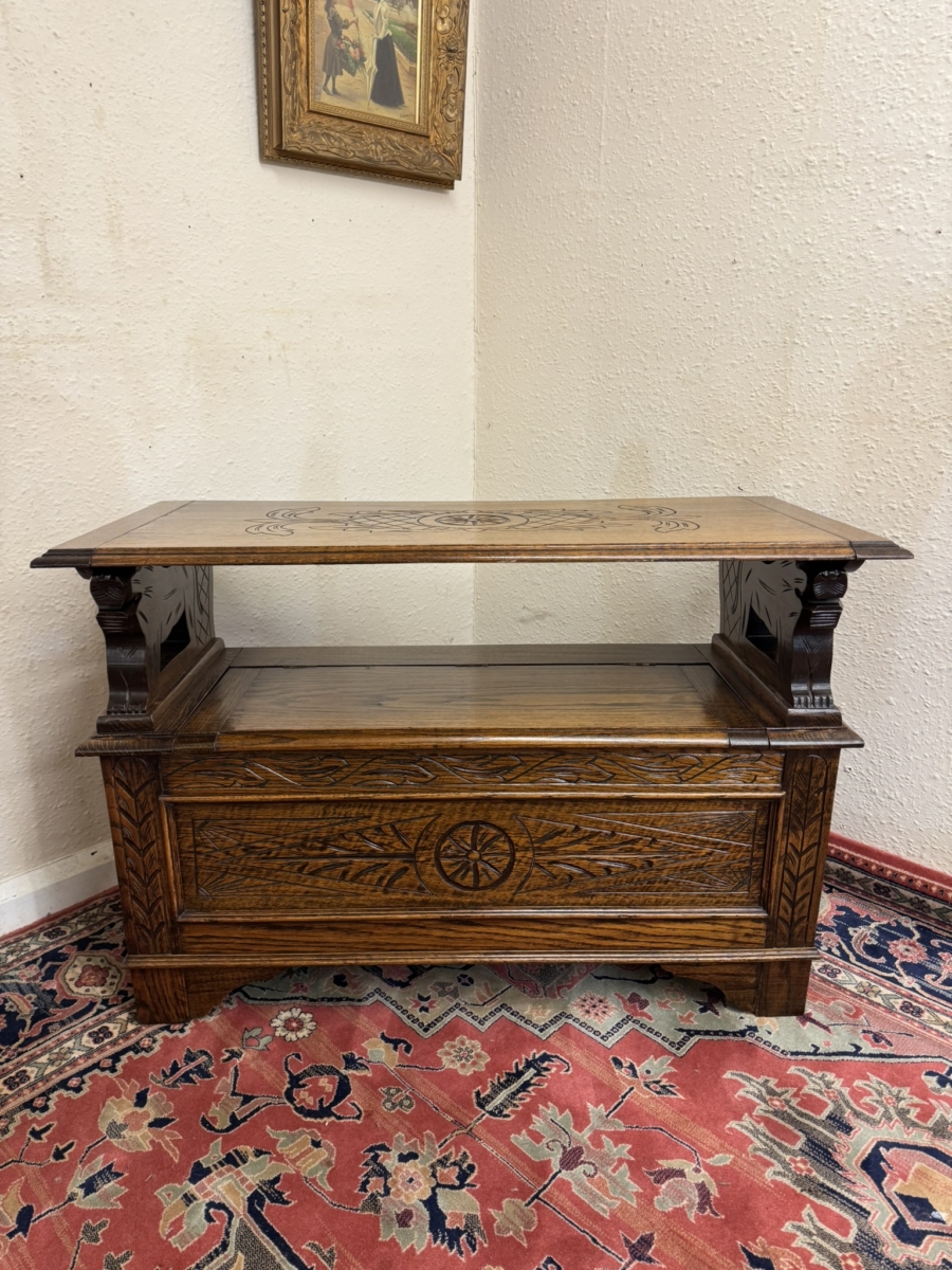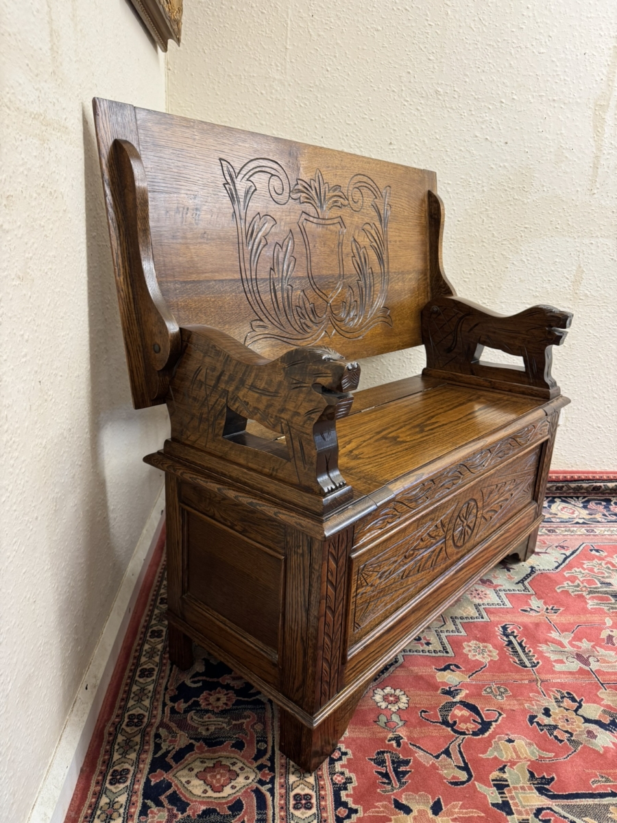 This fantastic quality monks bench dates circa 1930. The carved top folds back to form a backrest. Lift up lid opens to offer storage space, carved supports. Recessed panelled sides carved front and standing on traditional block feet.