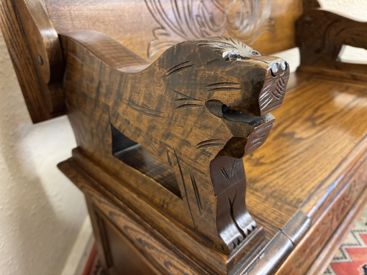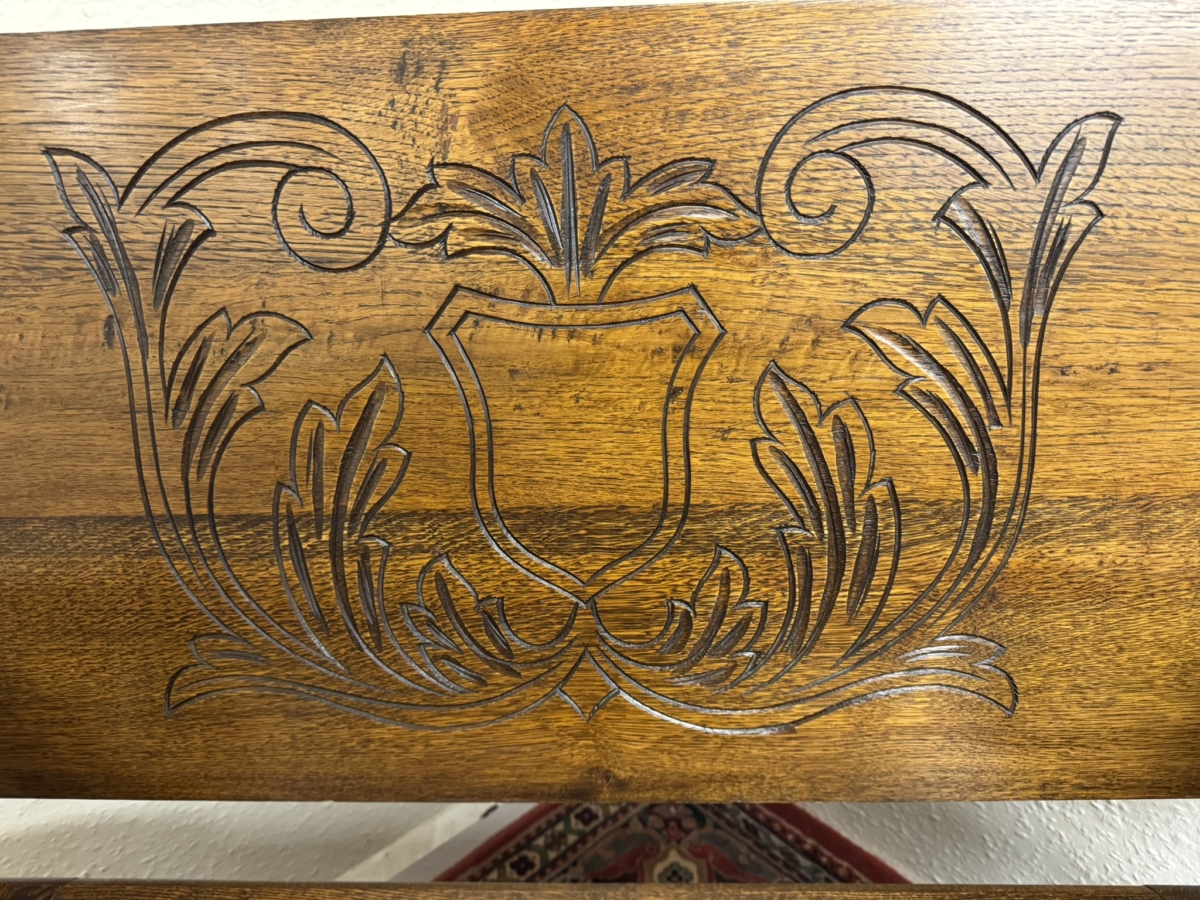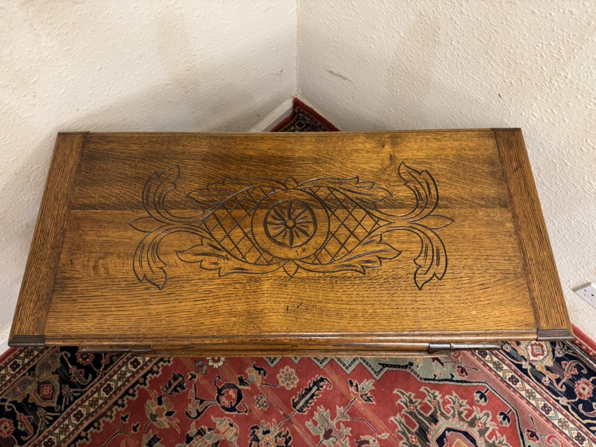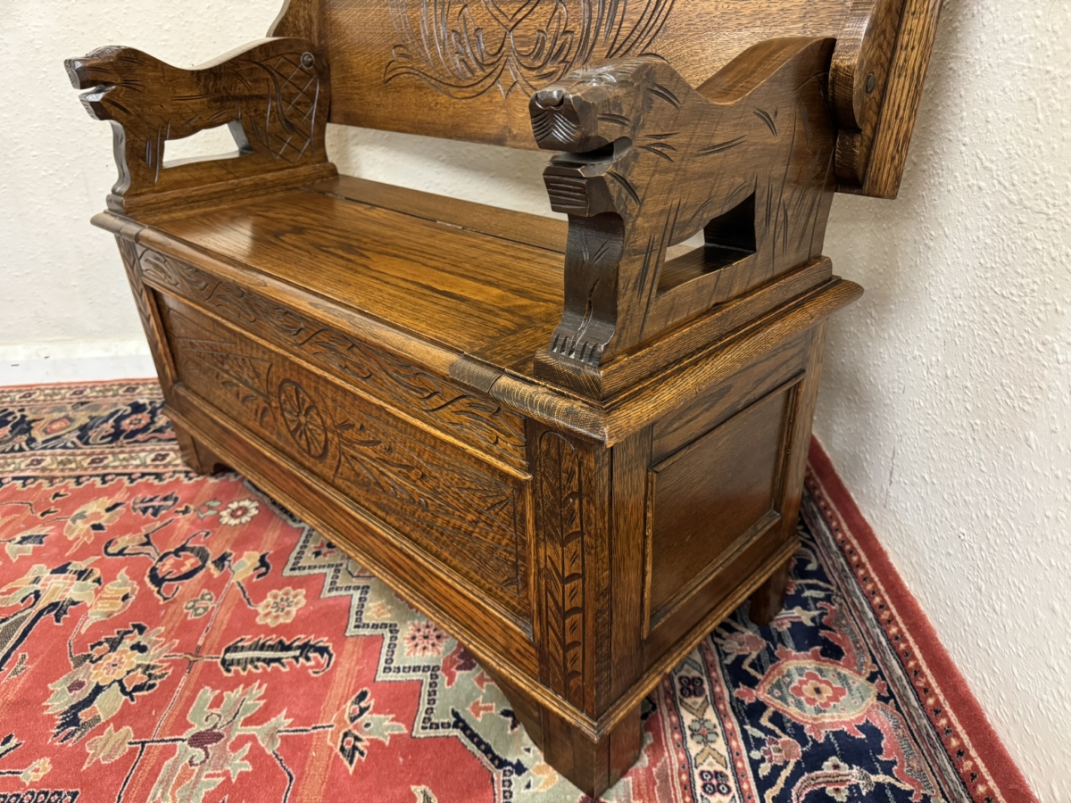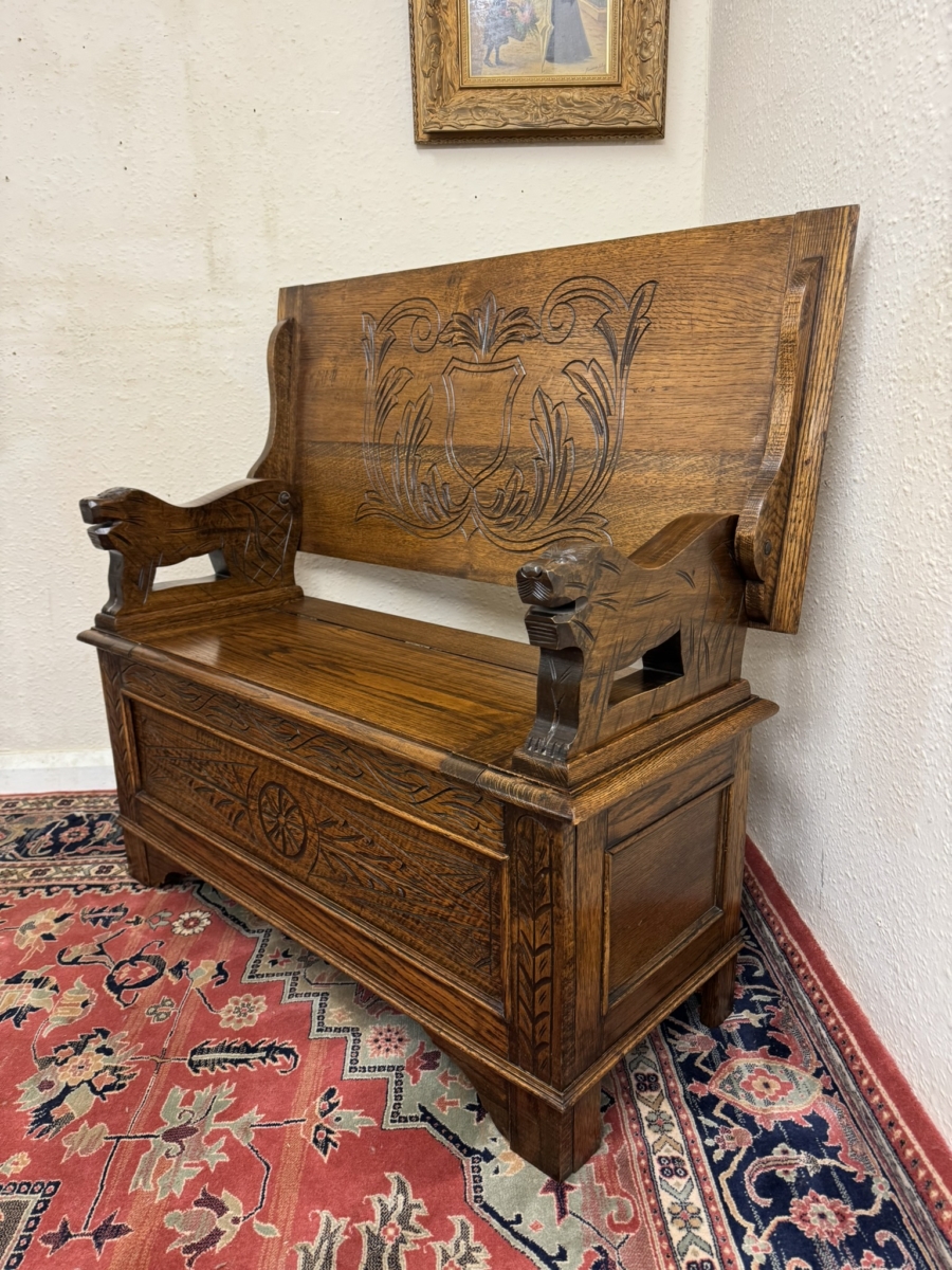 This fantastic quality monks bench dates circa 1930. The carved top folds back to form a backrest. Lift up lid opens to offer storage space, carved supports. Recessed panelled sides carved front and standing on traditional block feet.