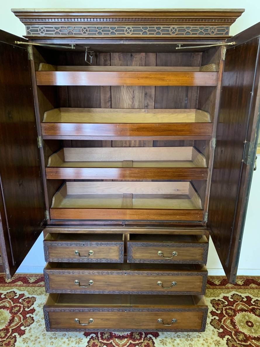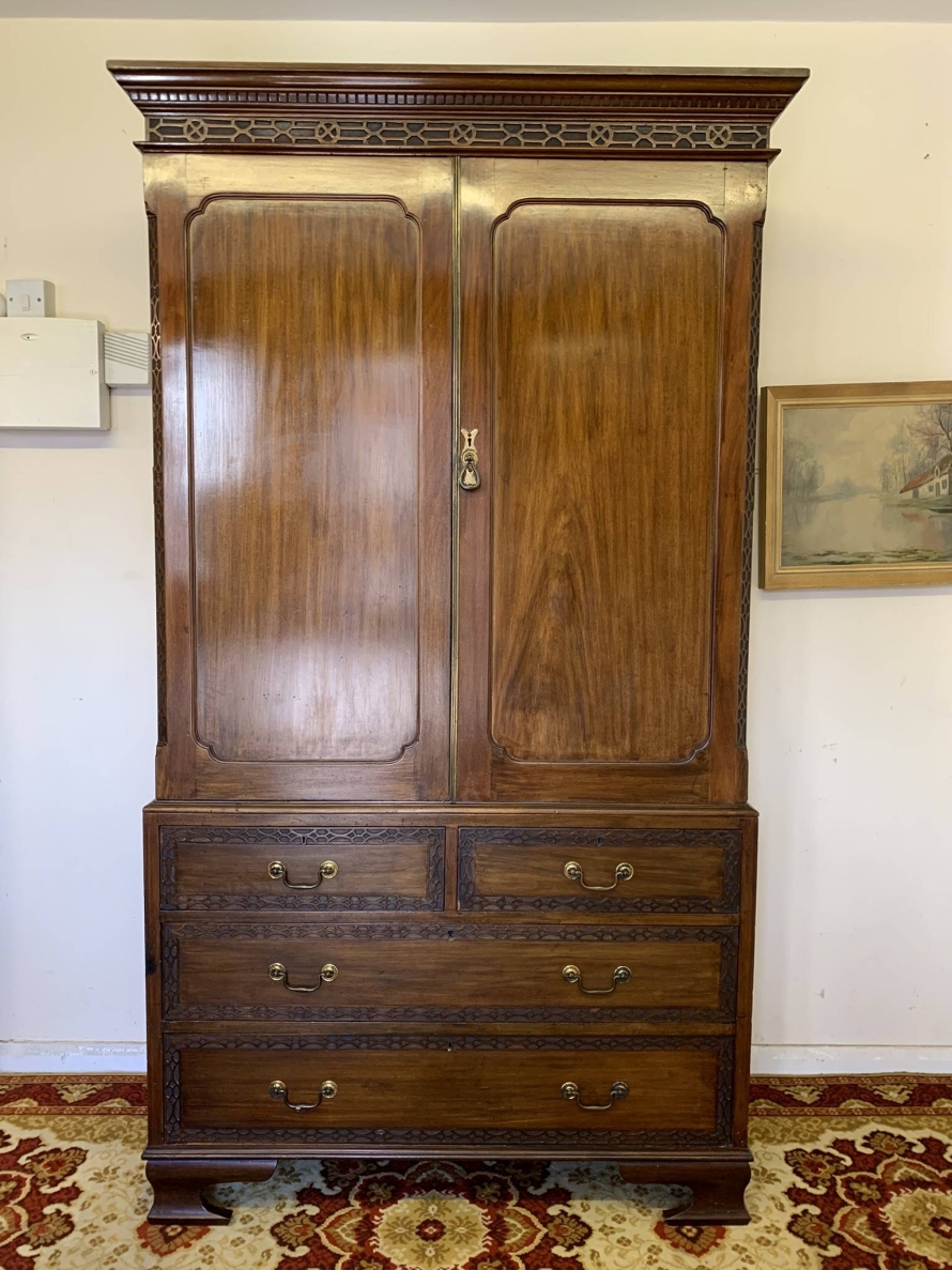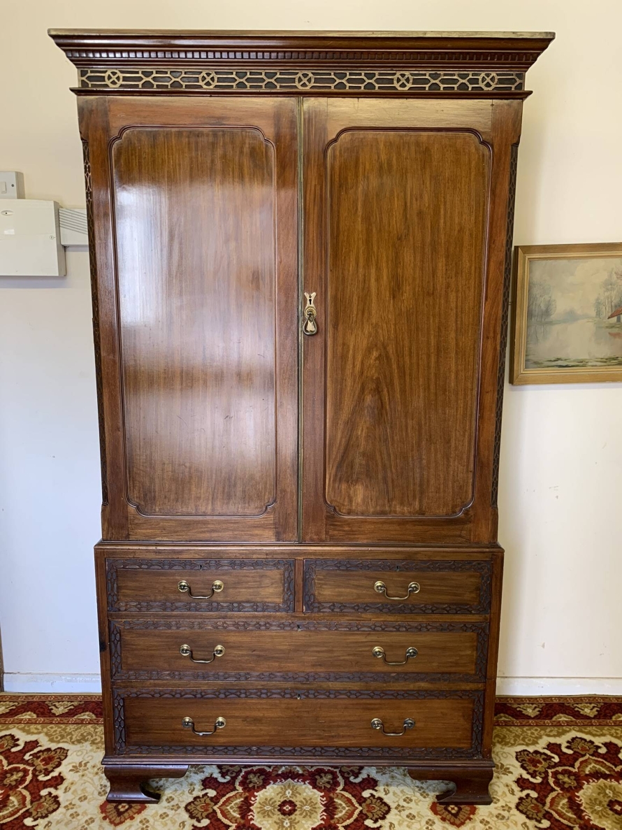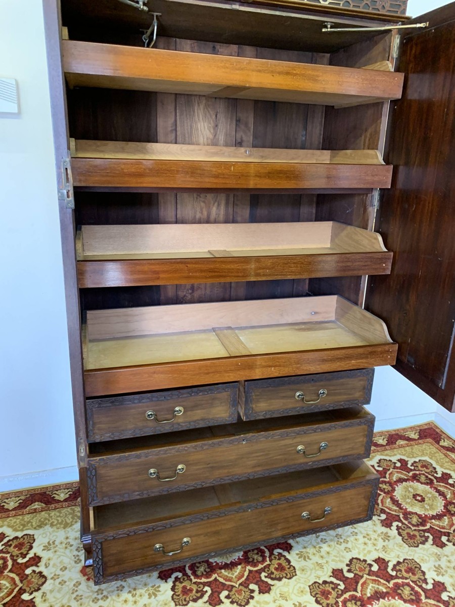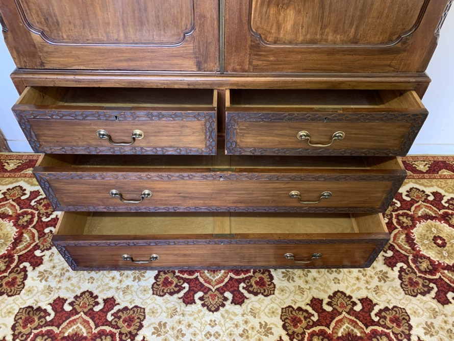 The oversailing top has carved decoration, below are a pair of recessed panelled doors the doors having chamered carved edging. The doors open to reveal four sliding storage shelves. Below are two carved short drawers, each drawer having brass handle, below two carved long drawers, each drawer having a pair of brass handles. This fabulous linen press stands on bracket feet. The linen press dates circa 1910.