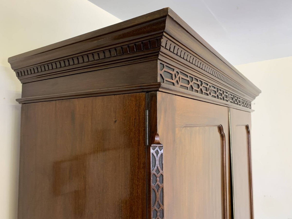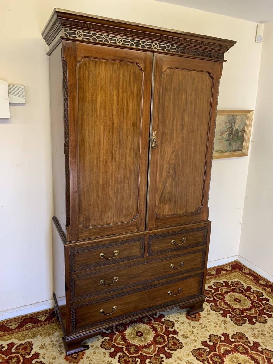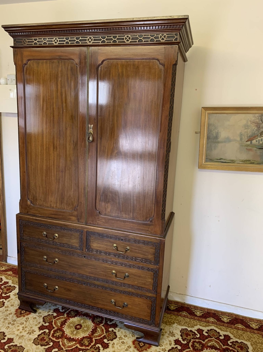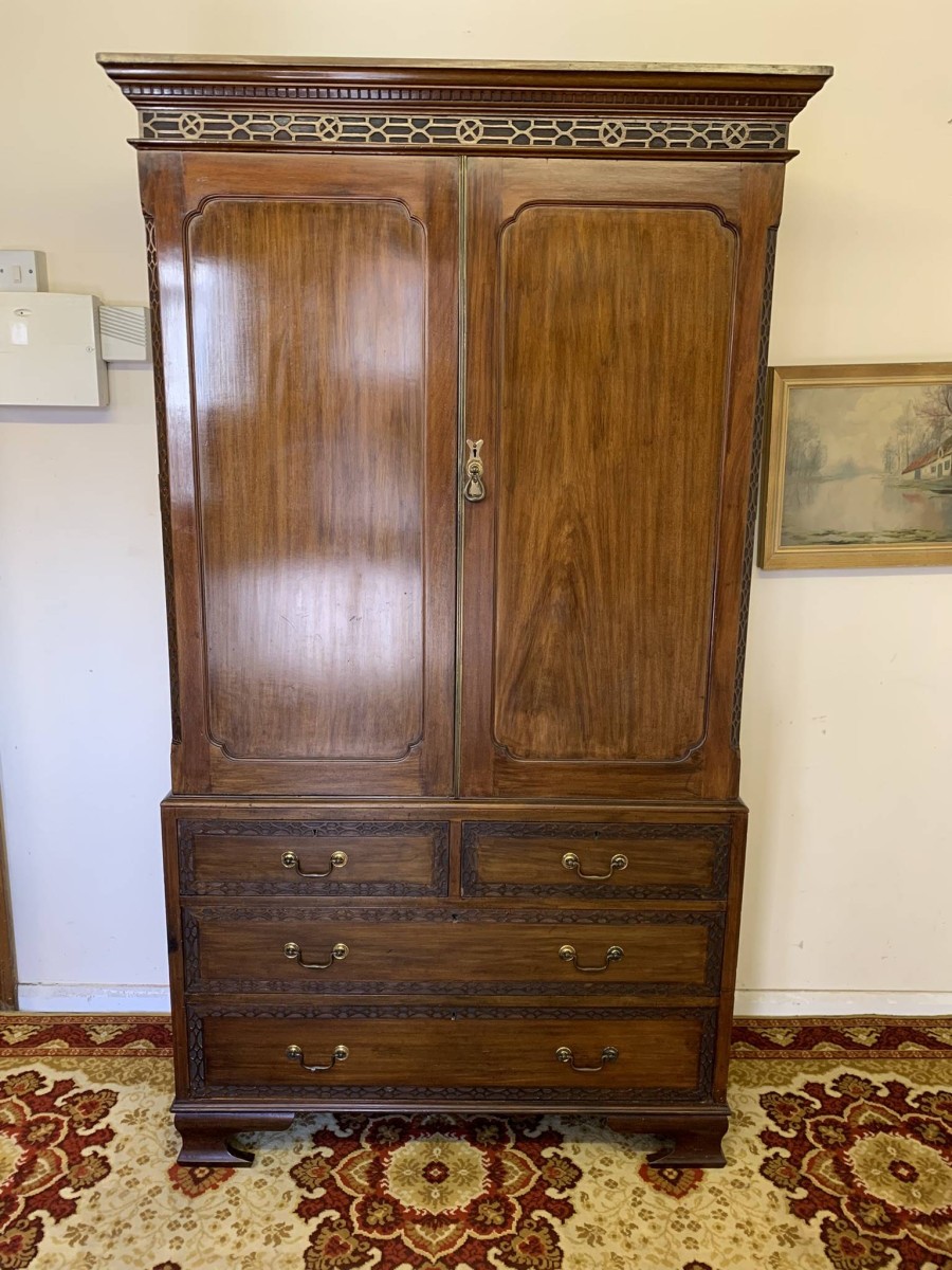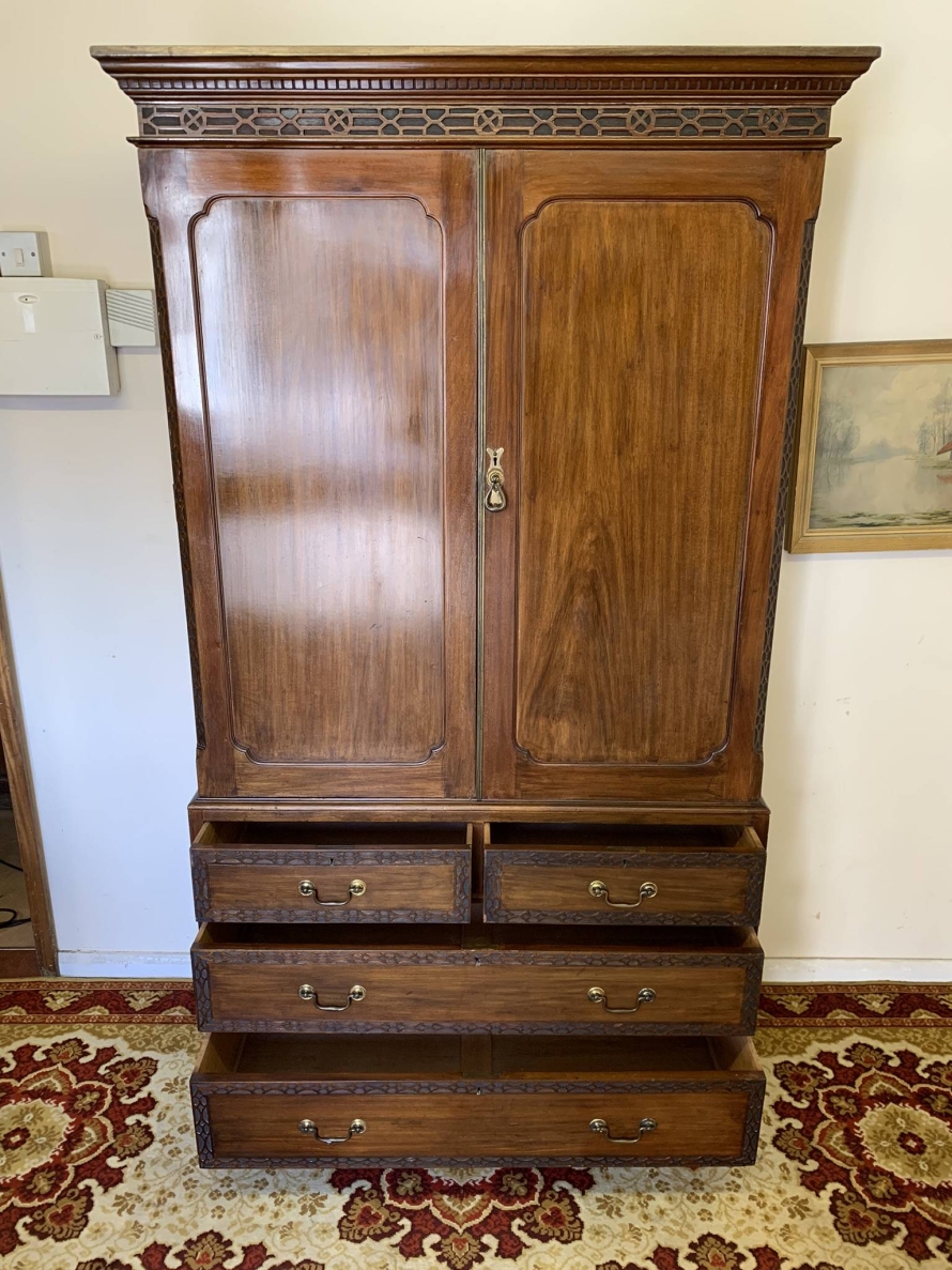 The oversailing top has carved decoration, below are a pair of recessed panelled doors the doors having chamered carved edging. The doors open to reveal four sliding storage shelves. Below are two carved short drawers, each drawer having brass handle, below two carved long drawers, each drawer having a pair of brass handles. This fabulous linen press stands on bracket feet. The linen press dates circa 1910.