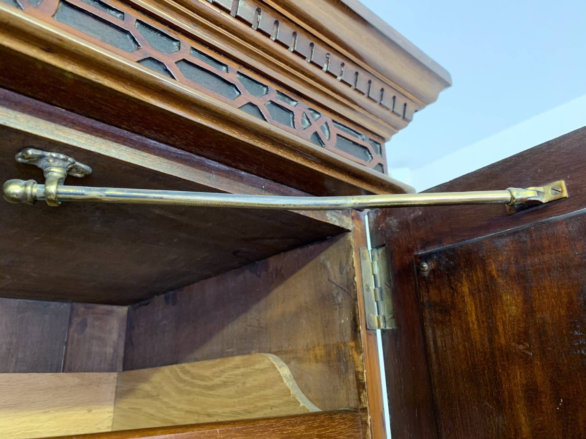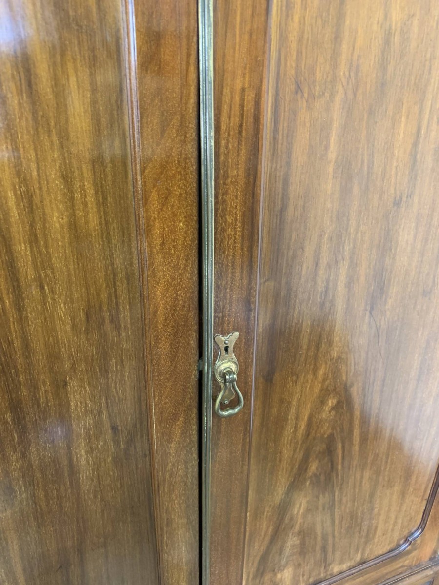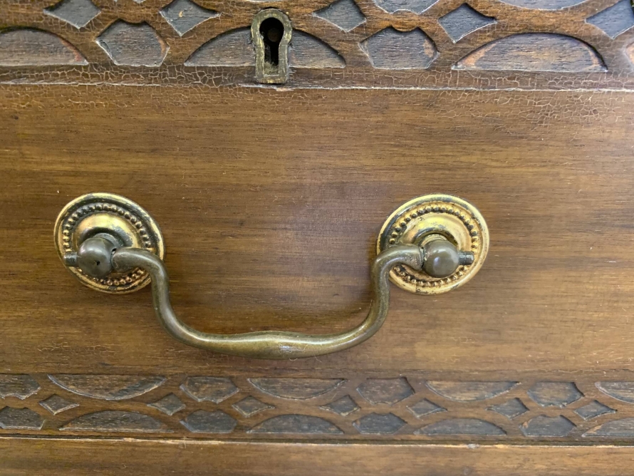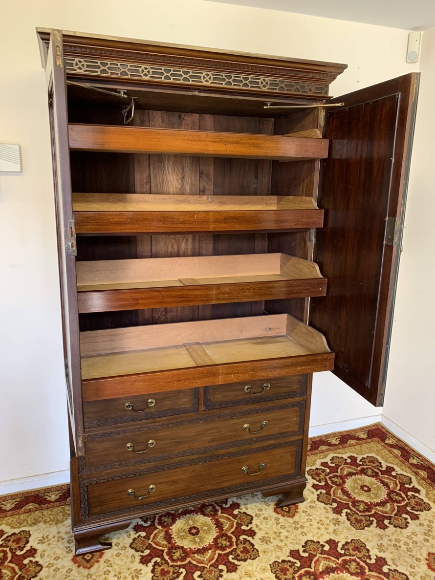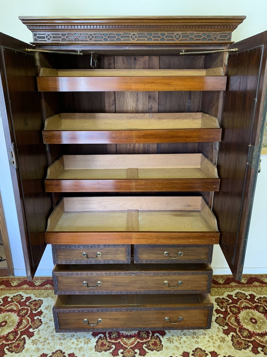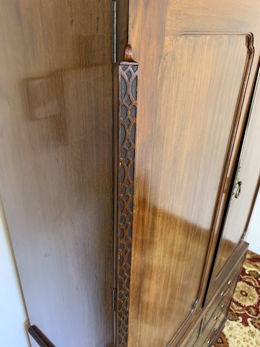 The oversailing top has carved decoration, below are a pair of recessed panelled doors the doors having chamered carved edging. The doors open to reveal four sliding storage shelves. Below are two carved short drawers, each drawer having brass handle, below two carved long drawers, each drawer having a pair of brass handles. This fabulous linen press stands on bracket feet. The linen press dates circa 1910.