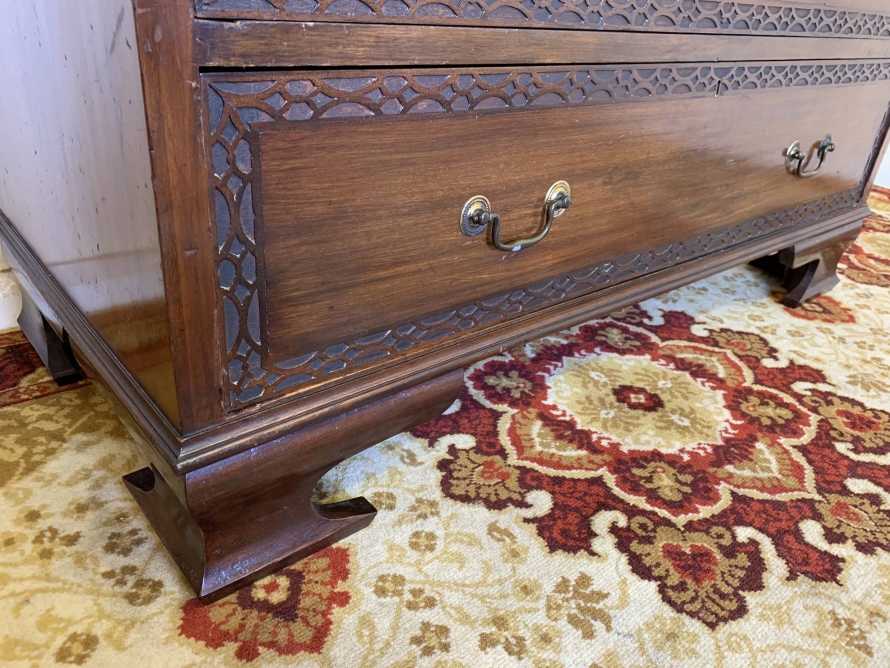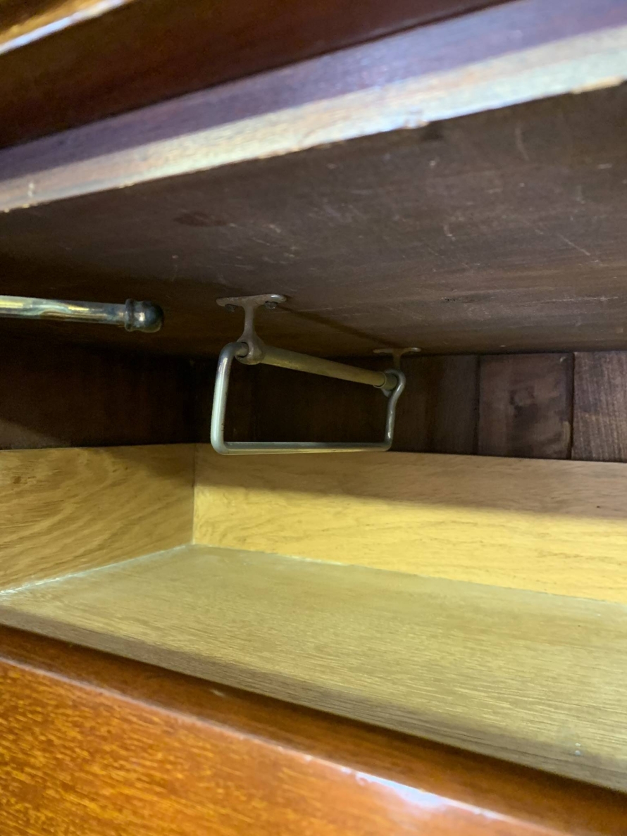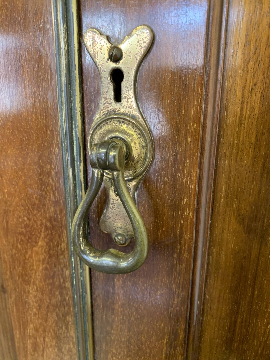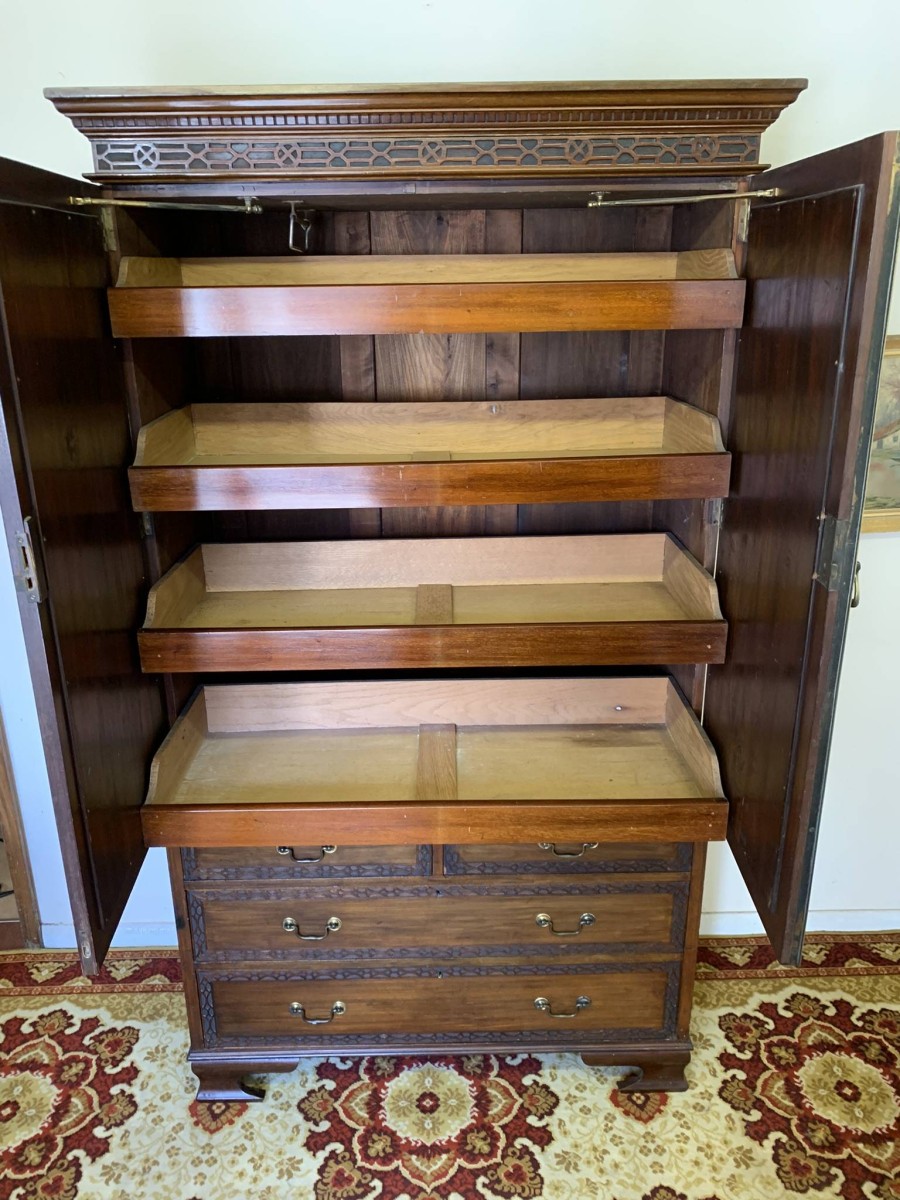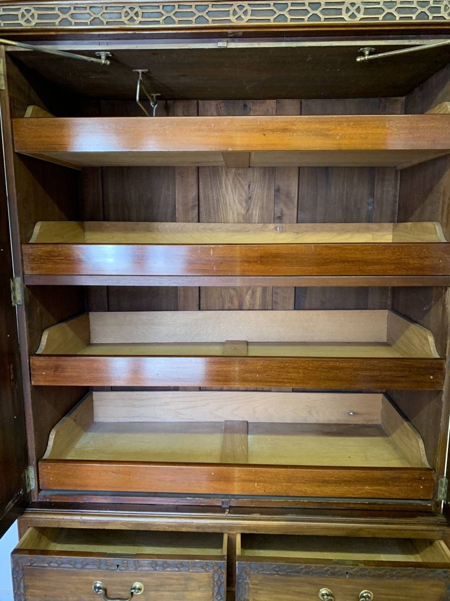 The oversailing top has carved decoration, below are a pair of recessed panelled doors the doors having chamered carved edging. The doors open to reveal four sliding storage shelves. Below are two carved short drawers, each drawer having brass handle, below two carved long drawers, each drawer having a pair of brass handles. This fabulous linen press stands on bracket feet. The linen press dates circa 1910.