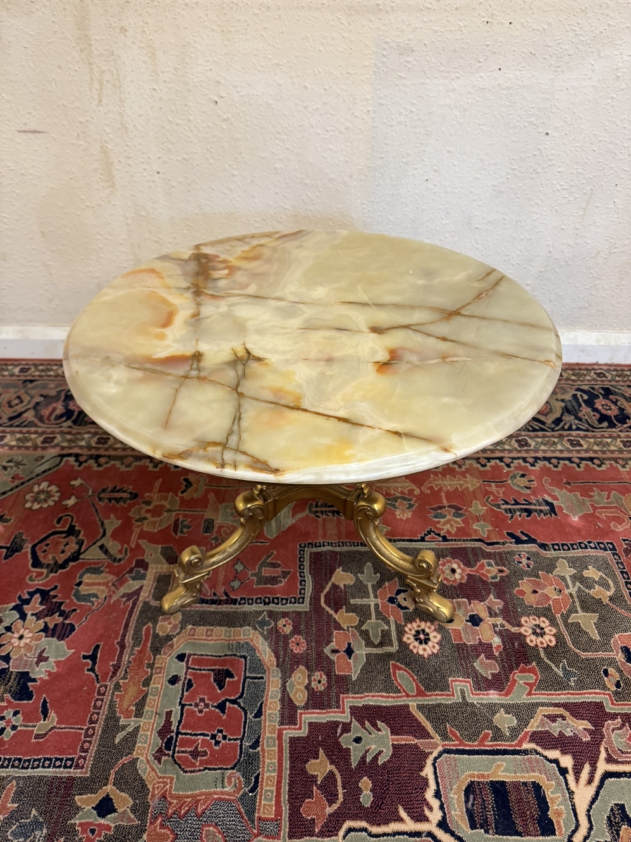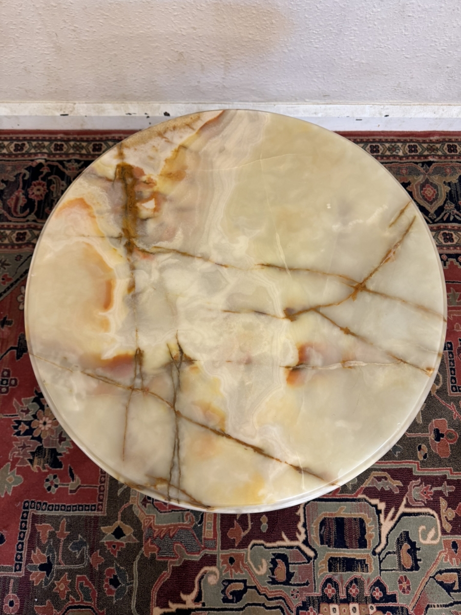 This fabulous table dates circa 1950. The round onyx top sits on a fluted stem with three curved legs.