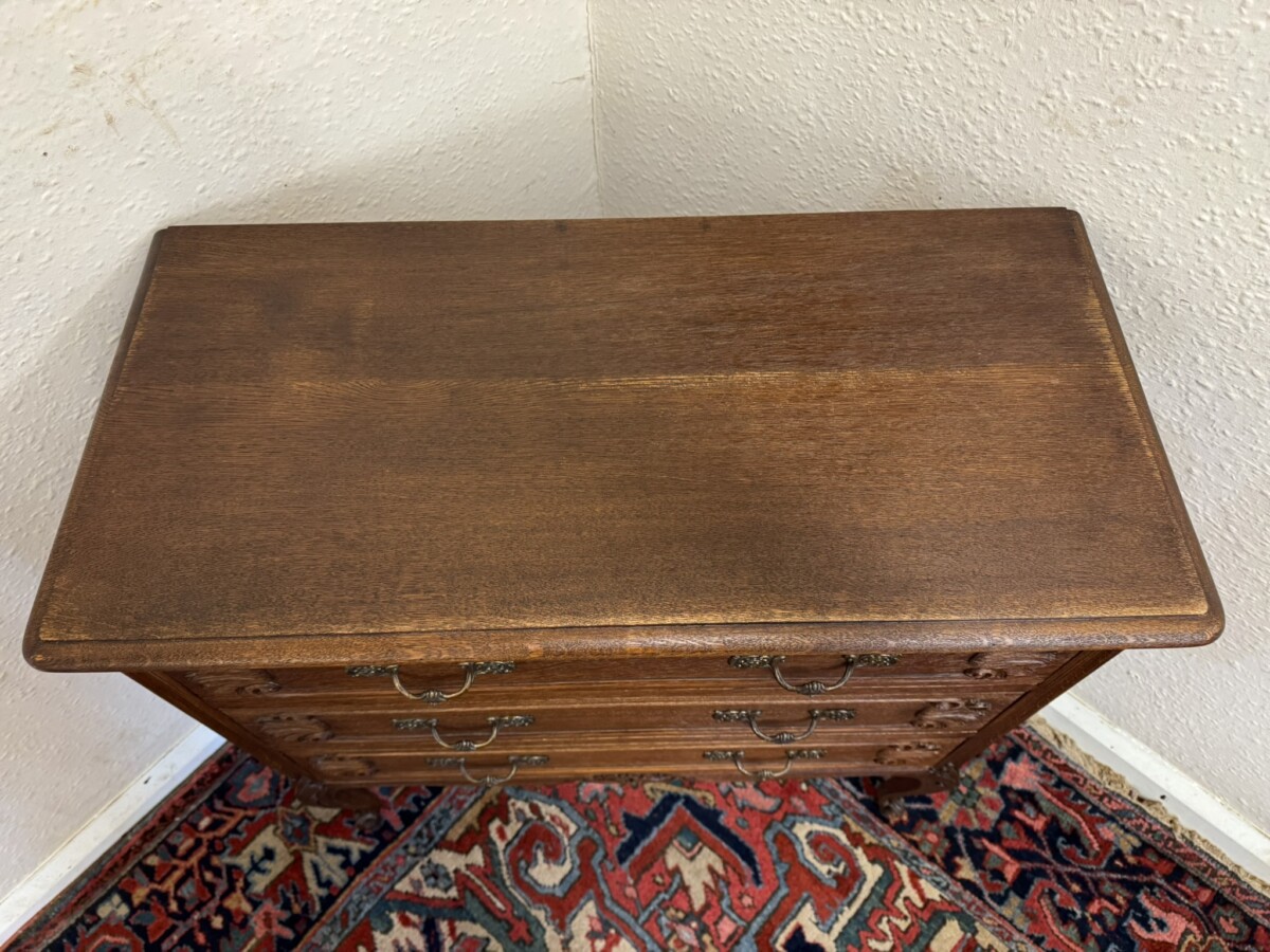 This super chest is in excellent condition. The oversailing top sits above three carved drawers, each drawer having a pair of ornate brass handles. Recessed panelled sides, shaped skirt with decorative central carving and standing on cabriole shaped legs, the front pair of legs are carved.