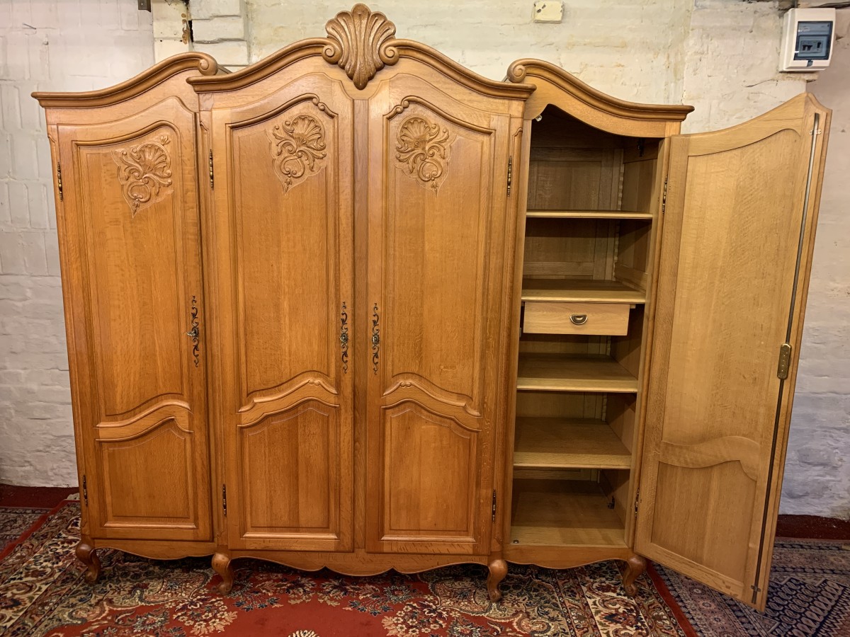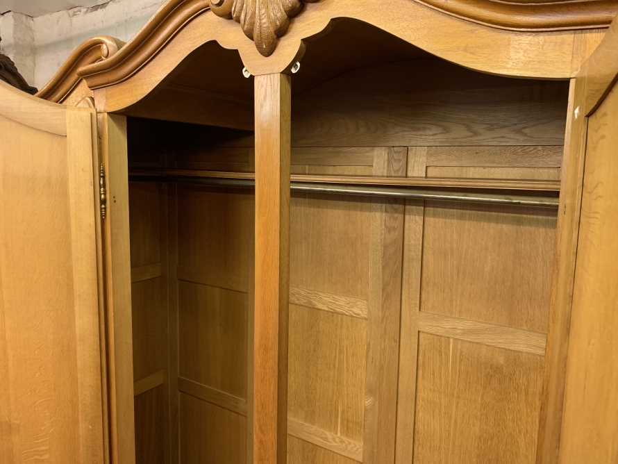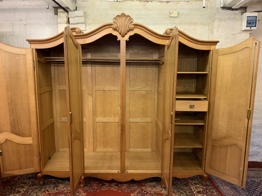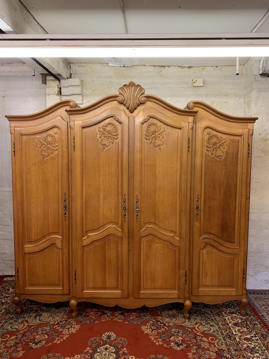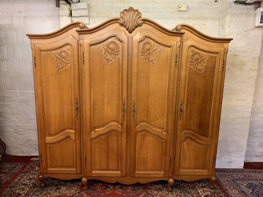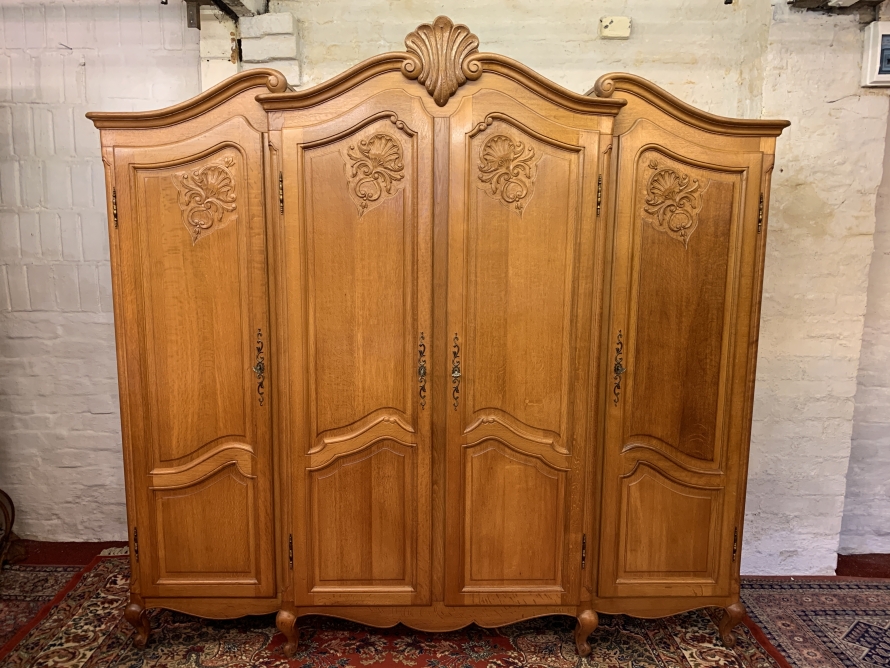 | Fabulous Quality French Carved Oak Brakefront Four-Door Armoire/Wardrobe The shaped oversailing top rises to a fantastic central carving, below are four lockable carved recessed panelled doors, each door having brass hinges, brass escutcheon and key. The two central doors are brakefront. The left-hand door and pair of central doors open to reveal a wooden shelf above brass hanging rail. The right-hand door opens to reveal four adjustable and removable shelves, one shelf having a drawer below. Recessed panelled sides shaped skirt this fabulous French armoire stands on four carved cabriole shaped legs to the front. Please note this armoire completely splits down for easy transportation into any home. Width 2 m 21 cm Height 2 m 9 cm Depth 70 cm |