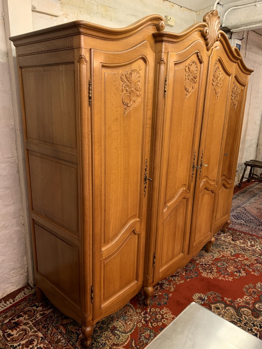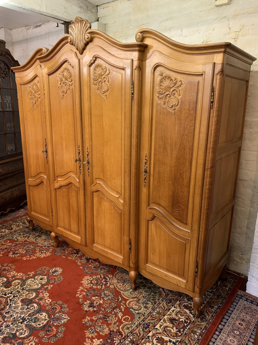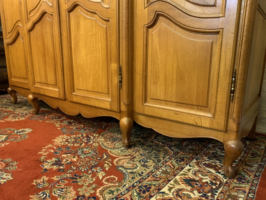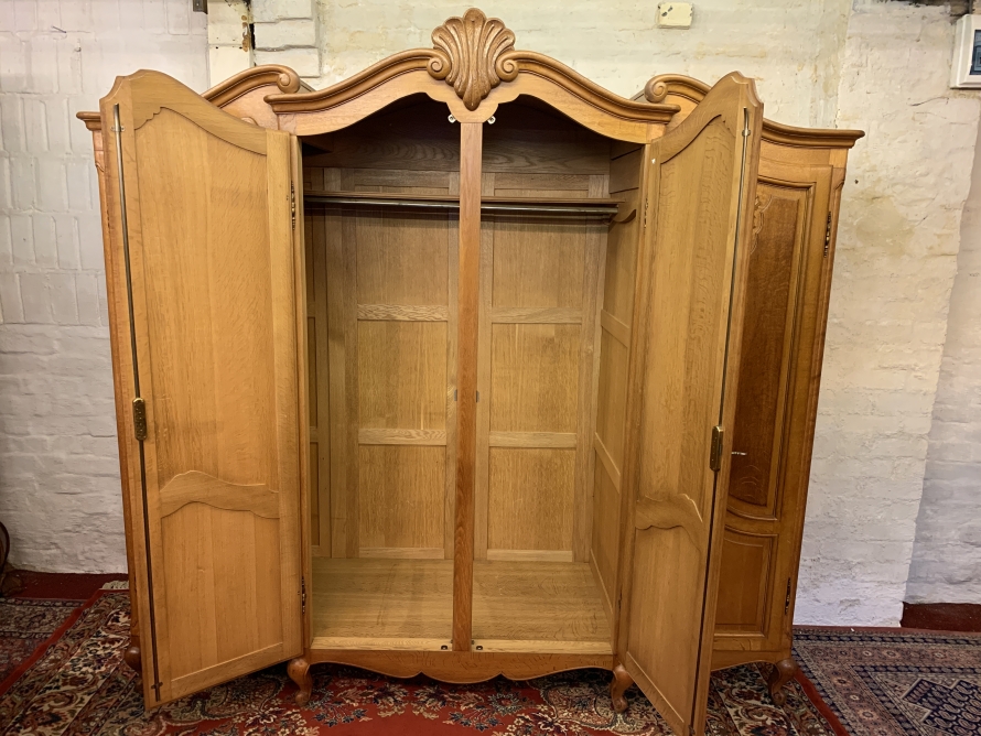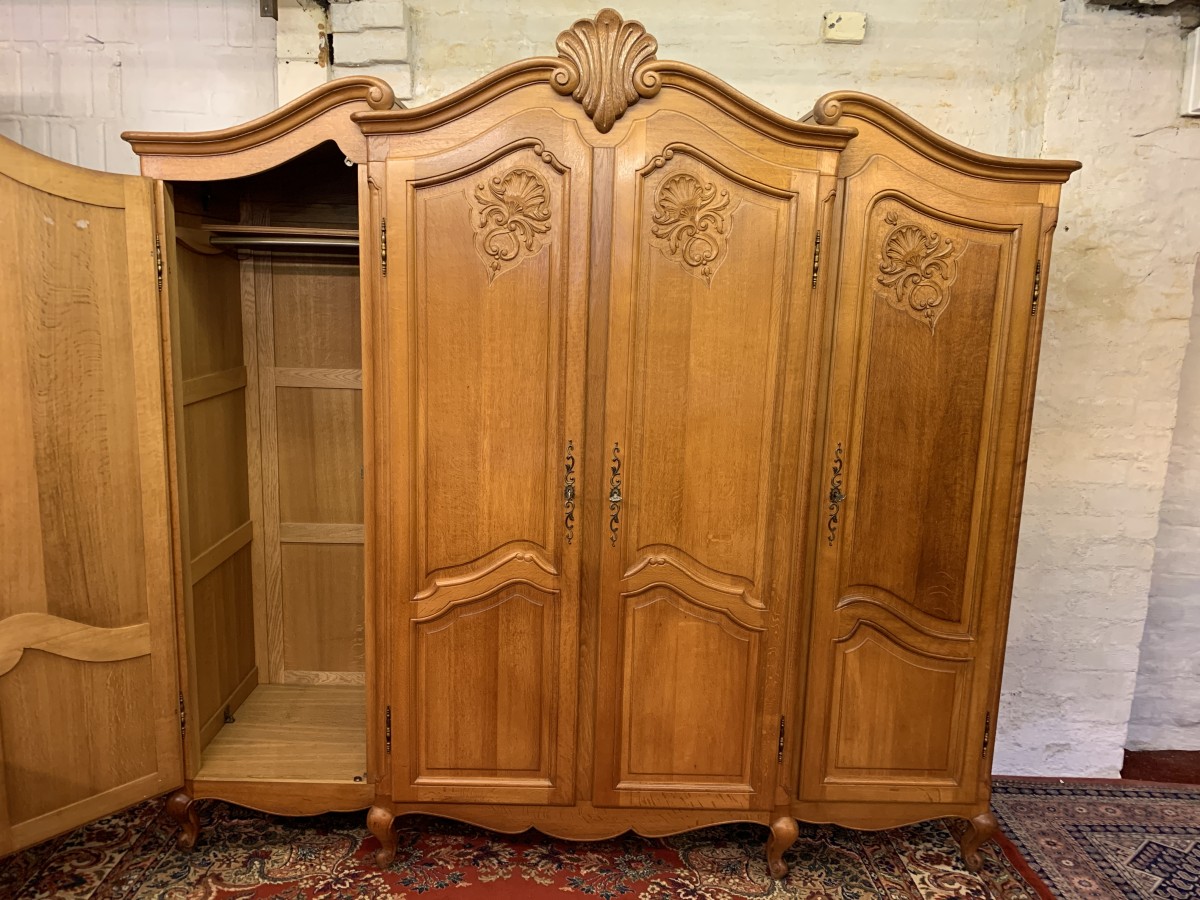 | Fabulous Quality French Carved Oak Brakefront Four-Door Armoire/Wardrobe The shaped oversailing top rises to a fantastic central carving, below are four lockable carved recessed panelled doors, each door having brass hinges, brass escutcheon and key. The two central doors are brakefront. The left-hand door and pair of central doors open to reveal a wooden shelf above brass hanging rail. The right-hand door opens to reveal four adjustable and removable shelves, one shelf having a drawer below. Recessed panelled sides shaped skirt this fabulous French armoire stands on four carved cabriole shaped legs to the front. Please note this armoire completely splits down for easy transportation into any home. Width 2 m 21 cm Height 2 m 9 cm Depth 70 cm |