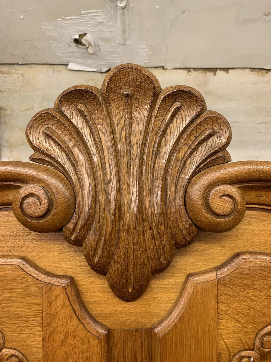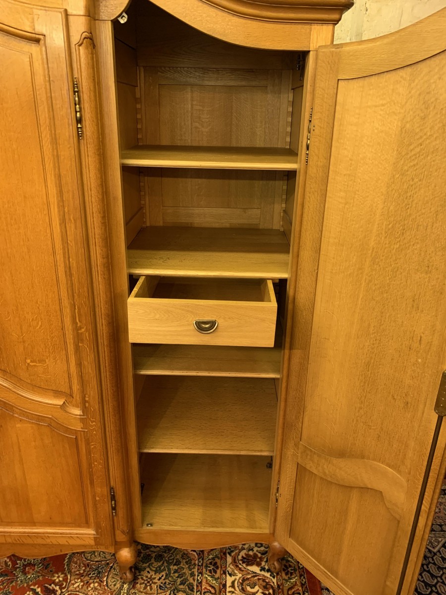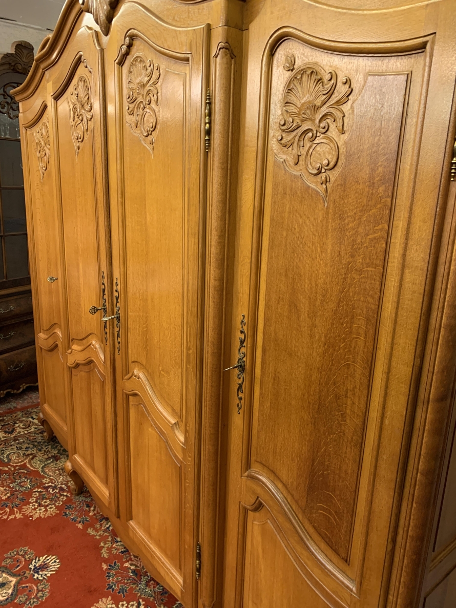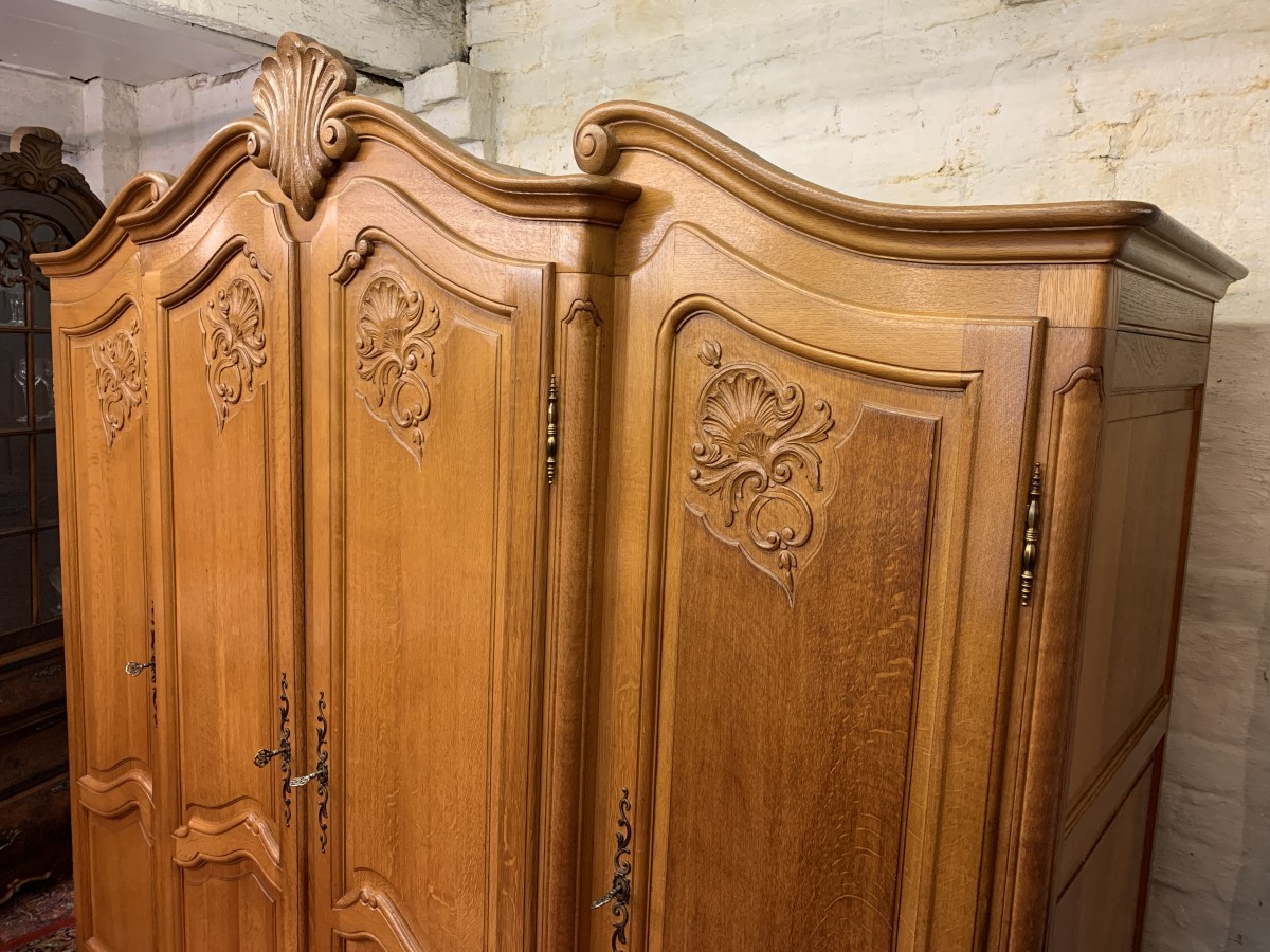 | Fabulous Quality French Carved Oak Brakefront Four-Door Armoire/Wardrobe The shaped oversailing top rises to a fantastic central carving, below are four lockable carved recessed panelled doors, each door having brass hinges, brass escutcheon and key. The two central doors are brakefront. The left-hand door and pair of central doors open to reveal a wooden shelf above brass hanging rail. The right-hand door opens to reveal four adjustable and removable shelves, one shelf having a drawer below. Recessed panelled sides shaped skirt this fabulous French armoire stands on four carved cabriole shaped legs to the front. Please note this armoire completely splits down for easy transportation into any home. Width 2 m 21 cm Height 2 m 9 cm Depth 70 cm |