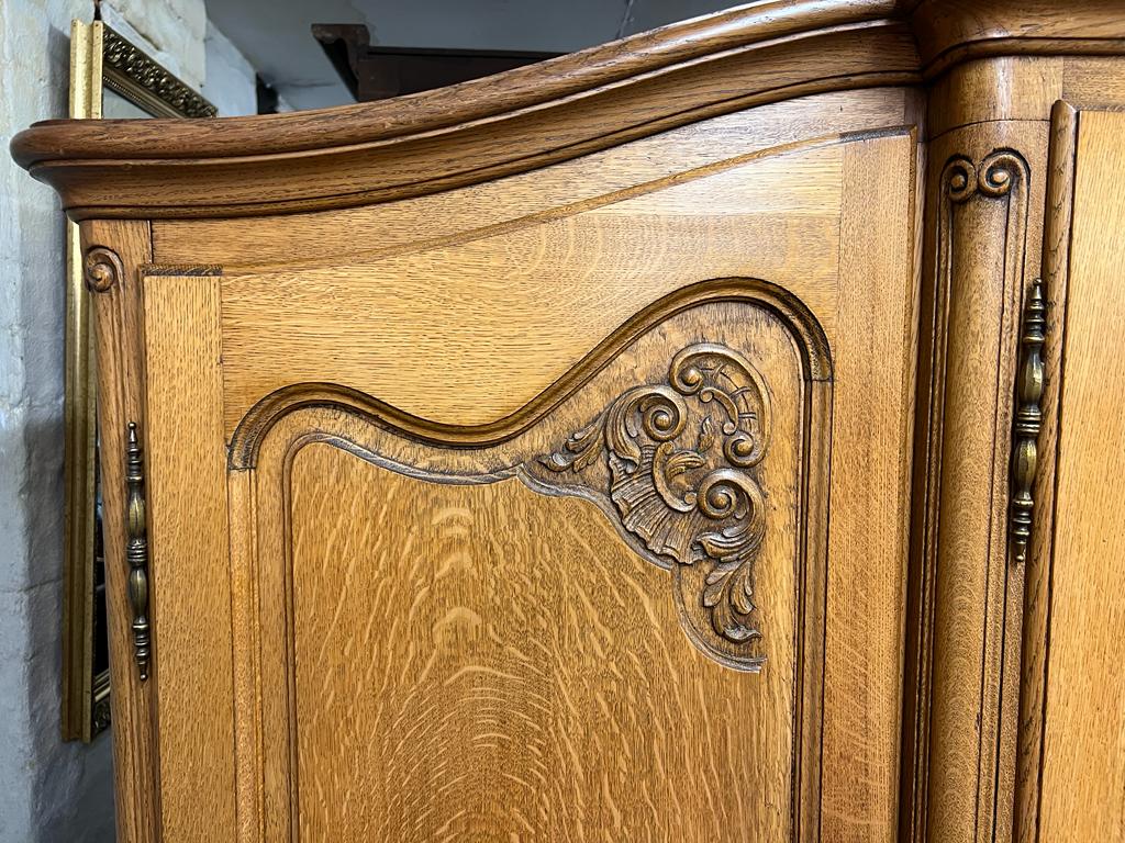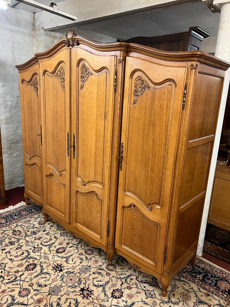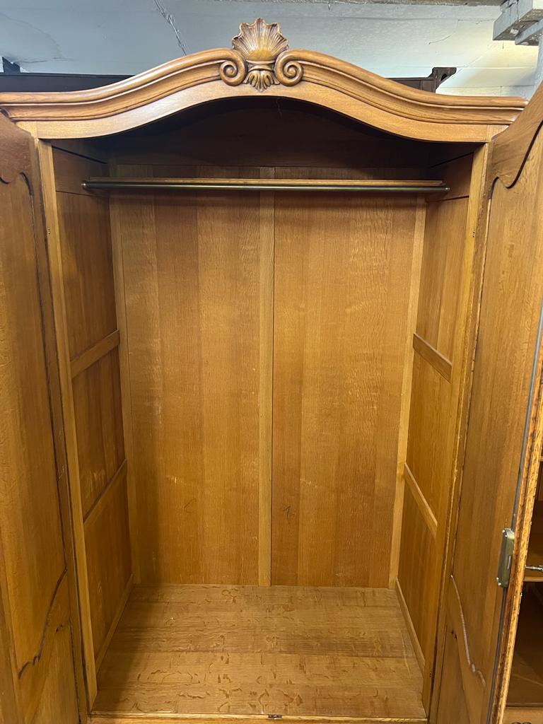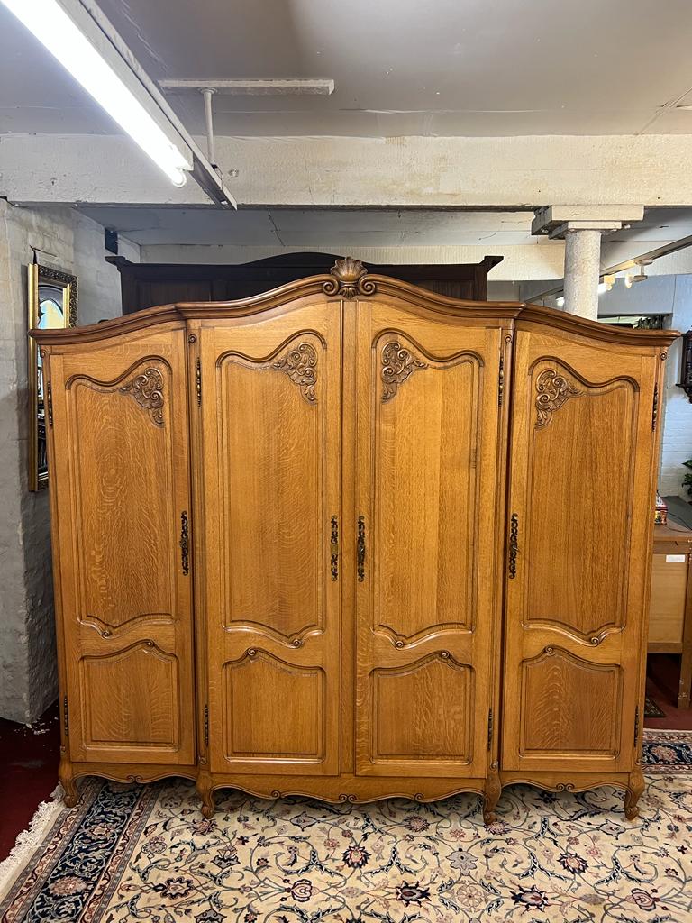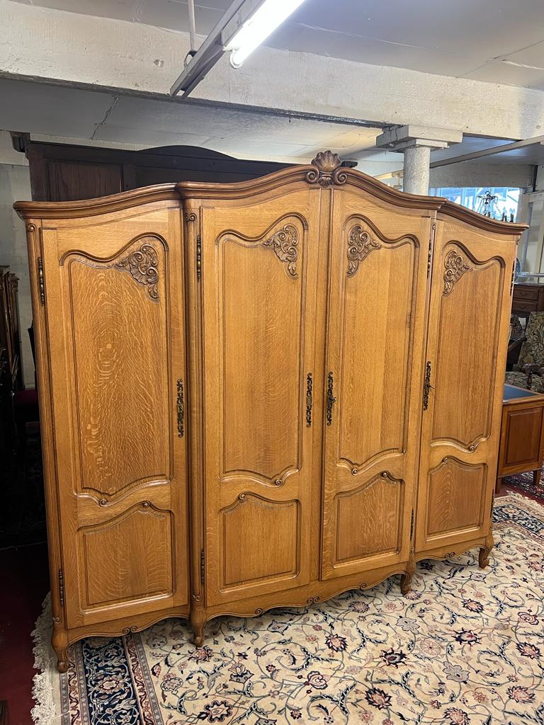 The shaped oversailing top rises to a decorative central carving, below are four lockable carved recessed panelled doors, the central pair of doors are brakefront. Each door has brass hinges and decorative brass escutcheon. The left-hand door opens to reveal a hanging rail. The central pair of brake frontdoors open to reveal a shelf above a hanging rail. The right-hand door opens to reveal three removable shelves. Recessed panelled sides, shaped skirt this stunning armoire stands on four carved cabriole shaped legs to the front. Please note this armoire completely splits down for easy transportation and delivery into any home.
