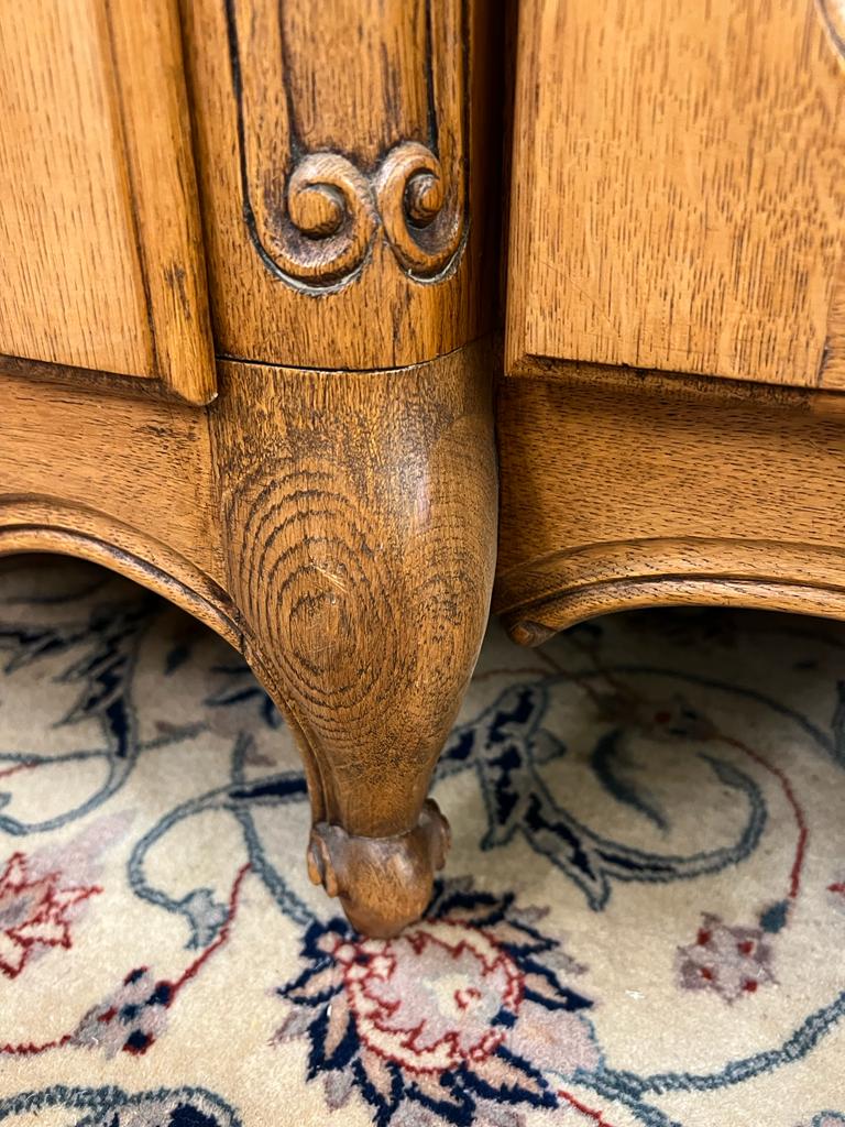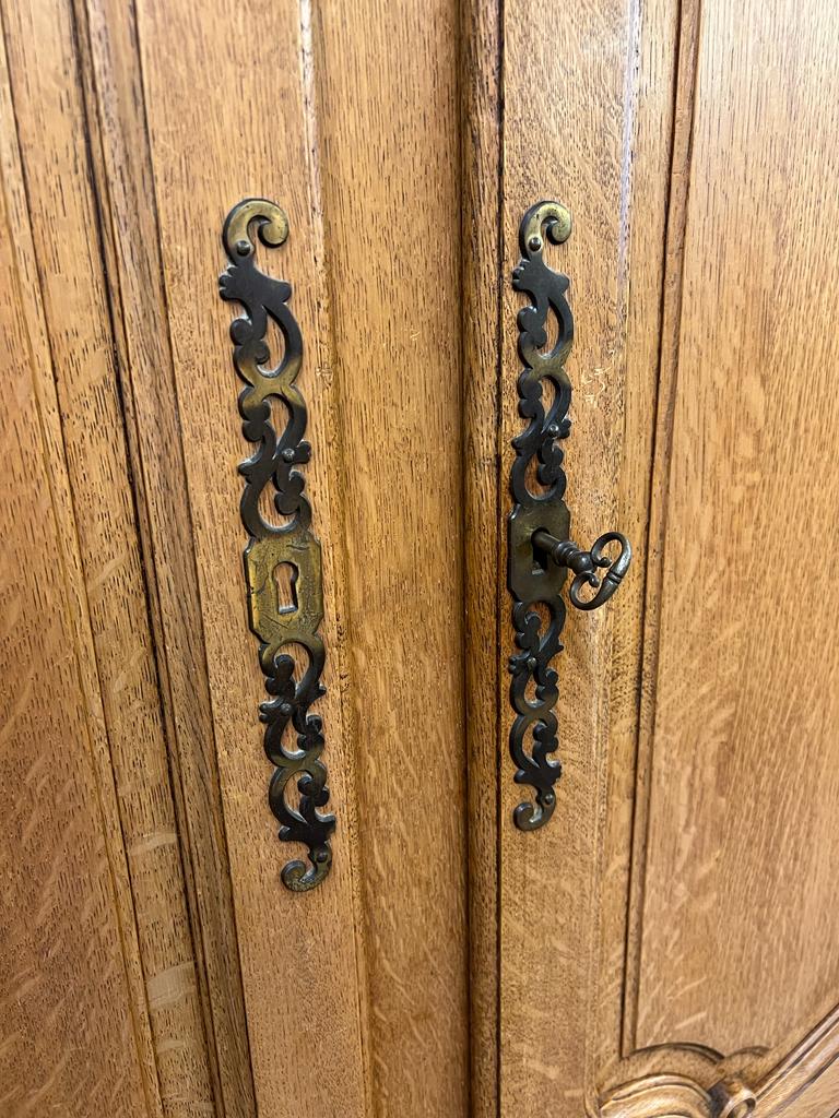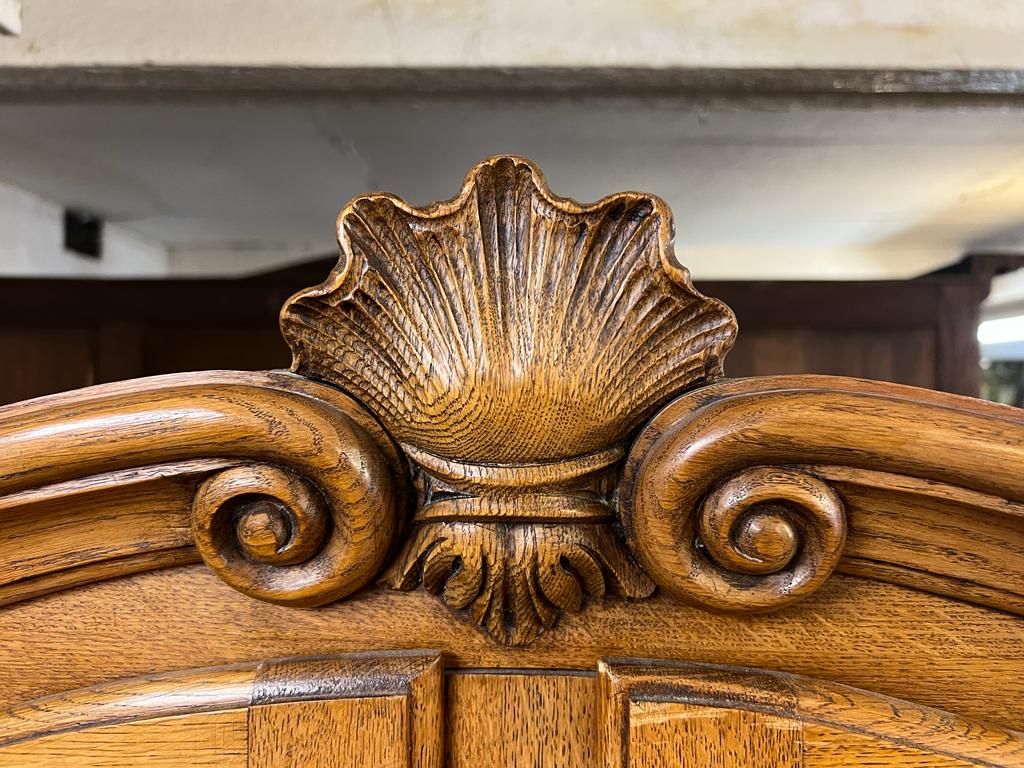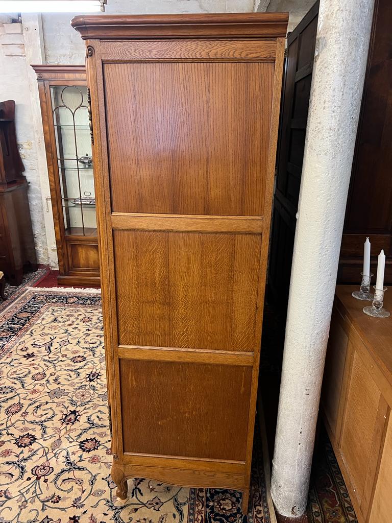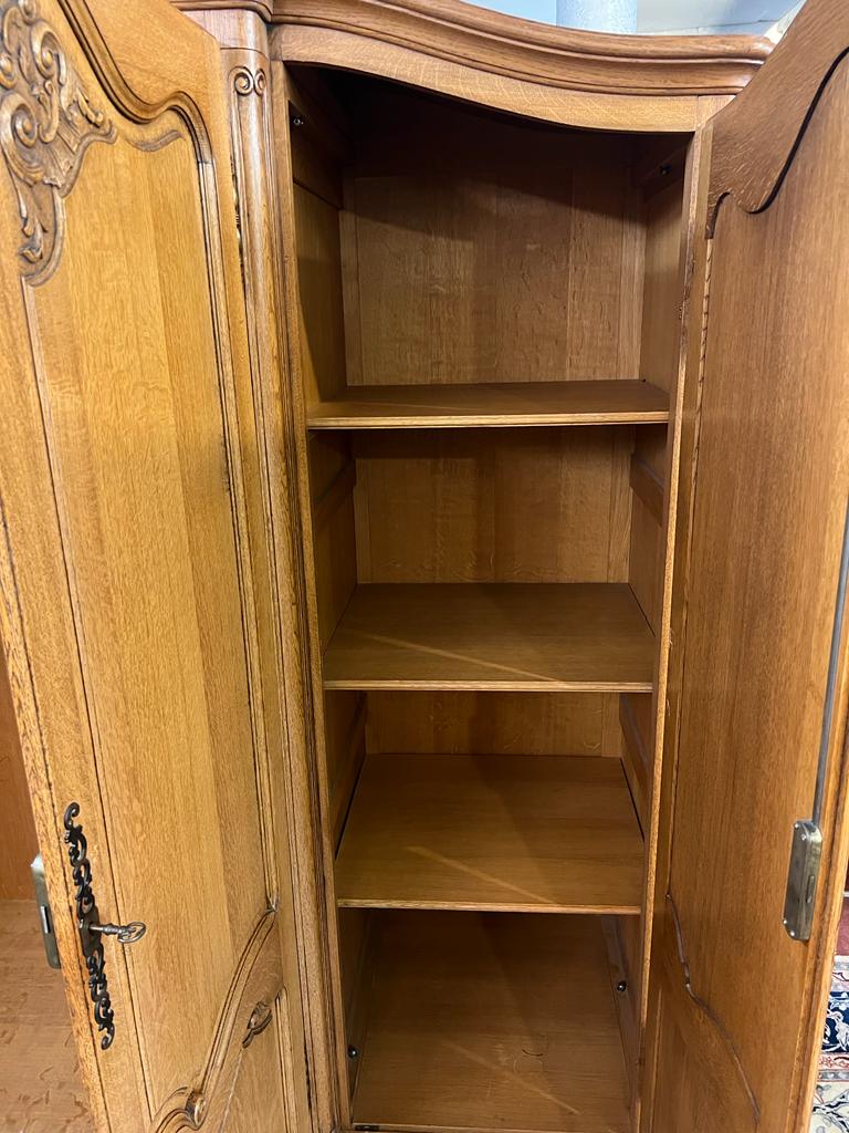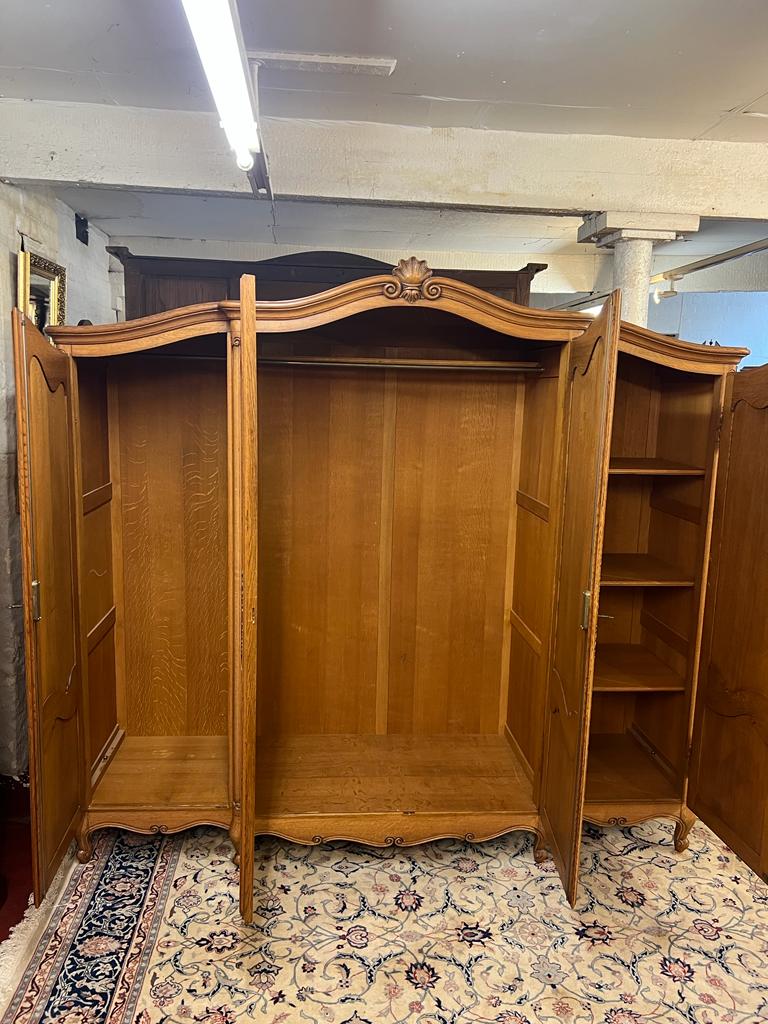 The shaped oversailing top rises to a decorative central carving, below are four lockable carved recessed panelled doors, the central pair of doors are brakefront. Each door has brass hinges and decorative brass escutcheon. The left-hand door opens to reveal a hanging rail. The central pair of brake frontdoors open to reveal a shelf above a hanging rail. The right-hand door opens to reveal three removable shelves. Recessed panelled sides, shaped skirt this stunning armoire stands on four carved cabriole shaped legs to the front. Please note this armoire completely splits down for easy transportation and delivery into any home.