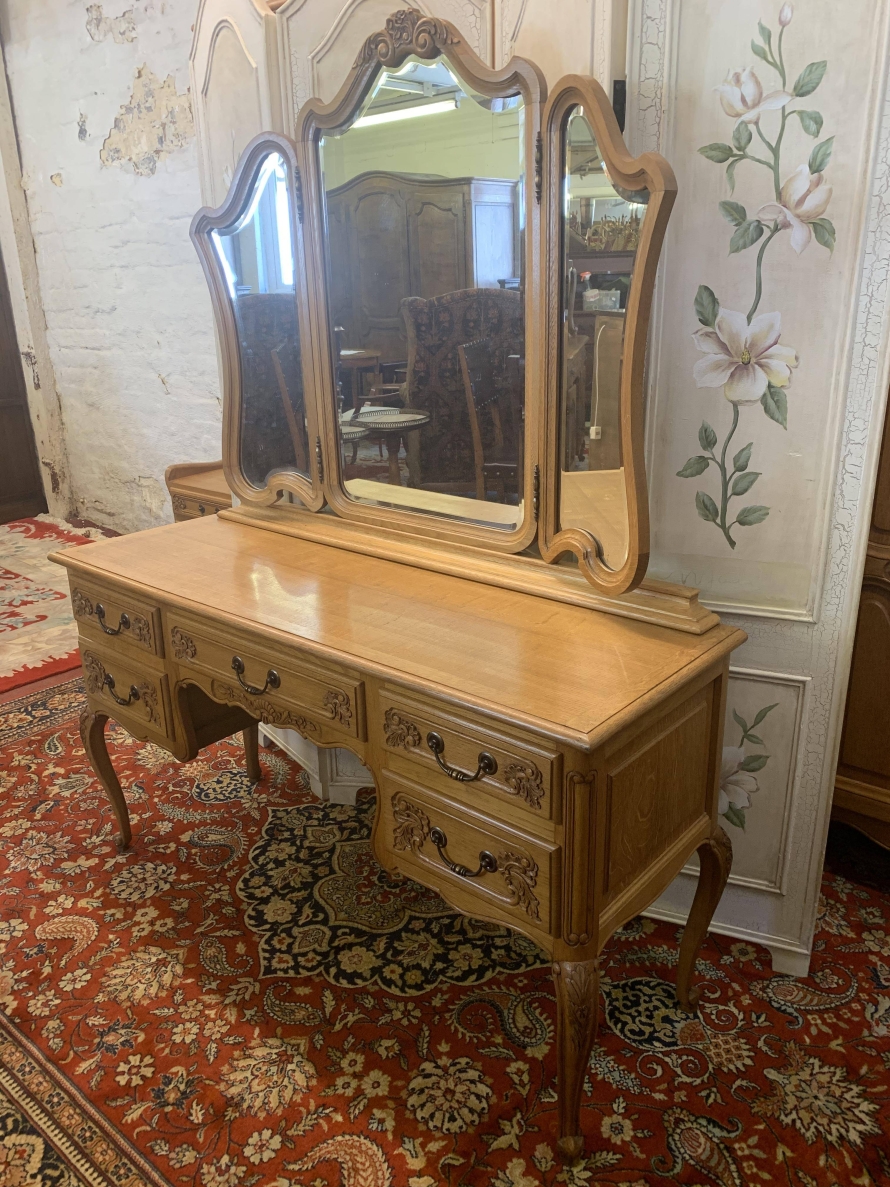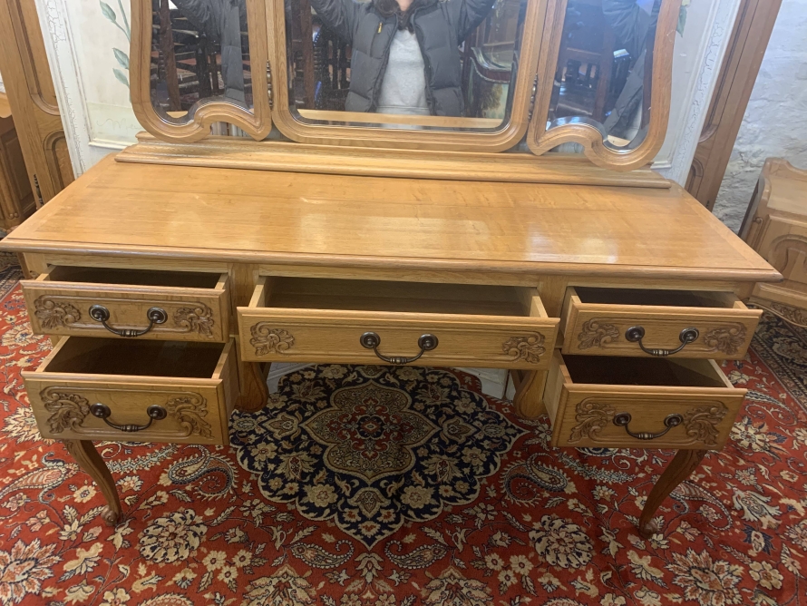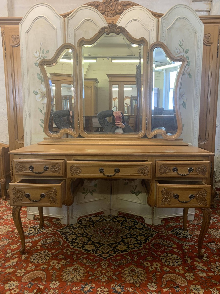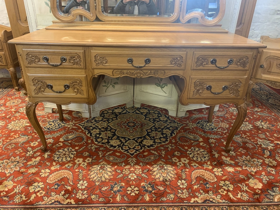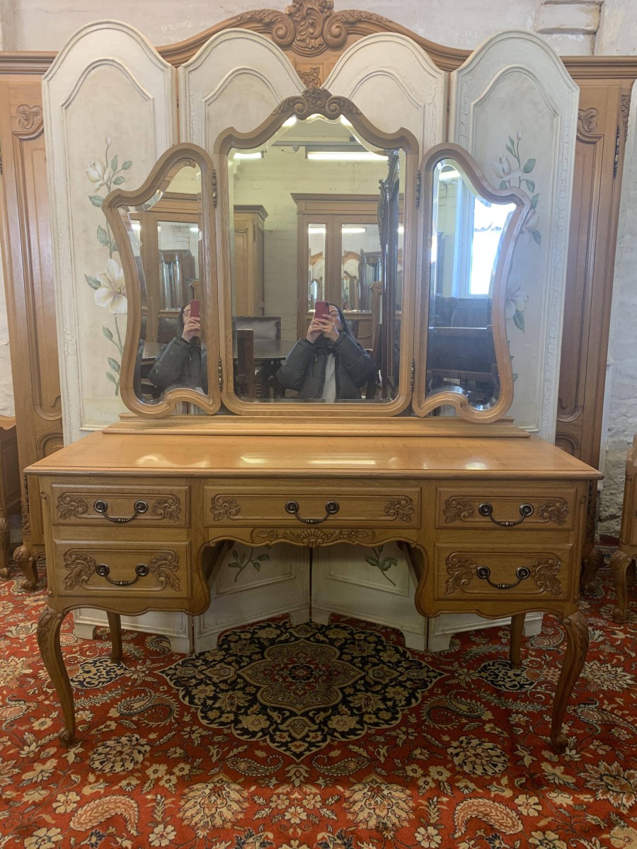 The fixed bevel edged central mirror rises to an ornate carving. This mirror is flanked by a pair of shaped bevelled edge adjustable mirrors. Below is a central carved knee hole drawer, the drawer has a drop handle and ornate carving below, this drawer is flanked by a pair of carved recessed panelled drawers, each drawer having drop handles. Recessed panelled sides, shaped skirt, this beautiful dressing table stands on four carved cabriole shaped legs. Please note we are also listing a matching four-door break front armoire and pair of bedside cabinets.