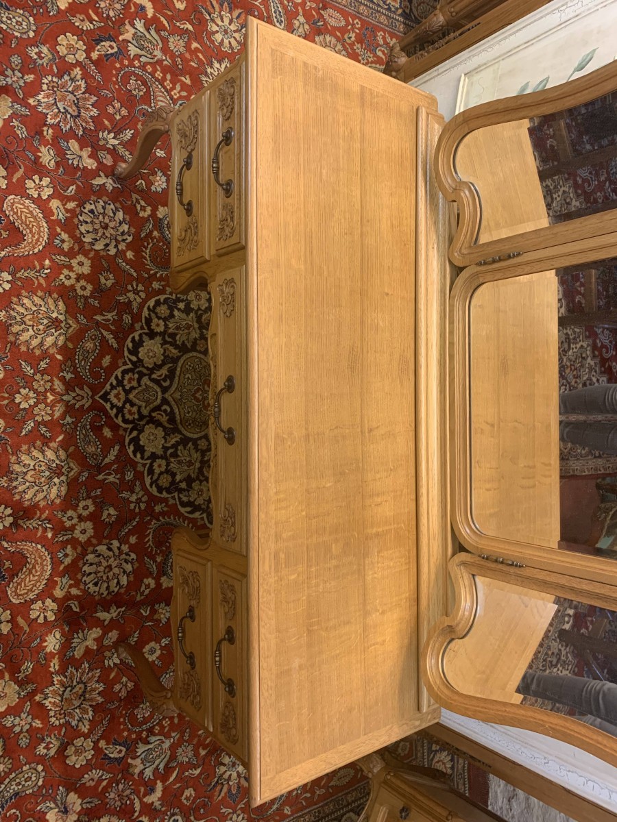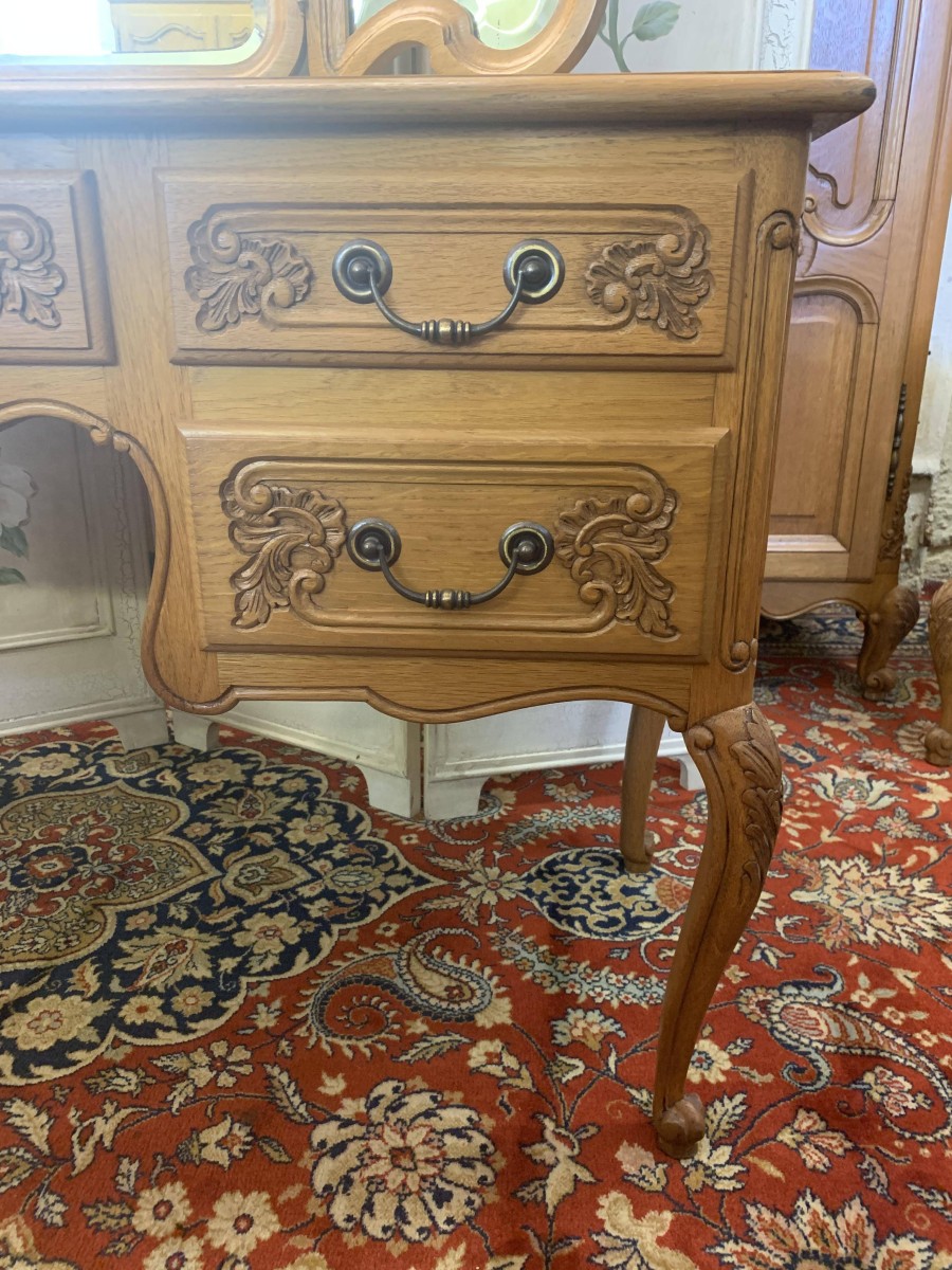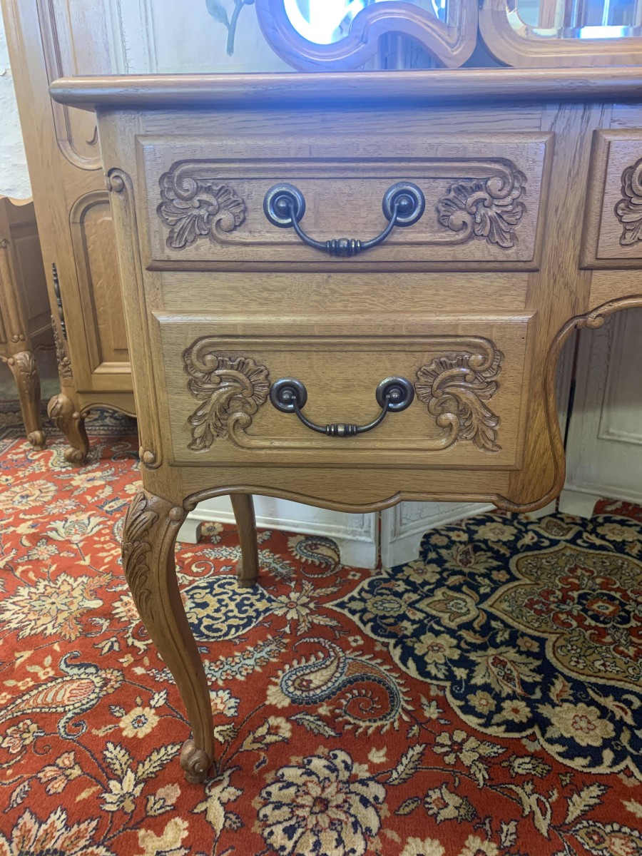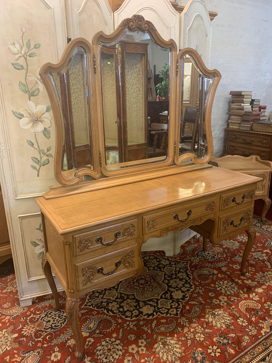 The fixed bevel edged central mirror rises to an ornate carving. This mirror is flanked by a pair of shaped bevelled edge adjustable mirrors. Below is a central carved knee hole drawer, the drawer has a drop handle and ornate carving below, this drawer is flanked by a pair of carved recessed panelled drawers, each drawer having drop handles. Recessed panelled sides, shaped skirt, this beautiful dressing table stands on four carved cabriole shaped legs. Please note we are also listing a matching four-door break front armoire and pair of bedside cabinets.