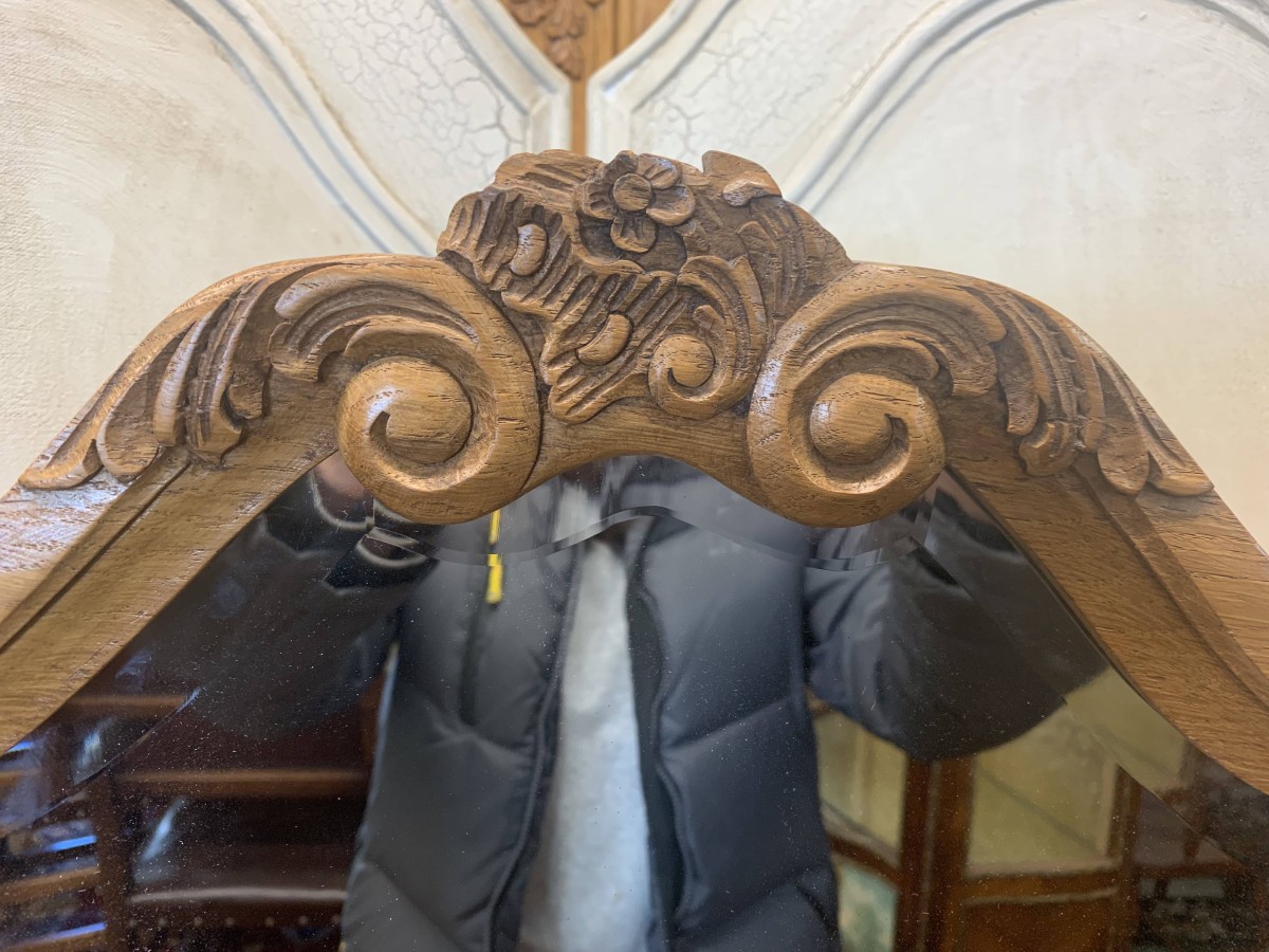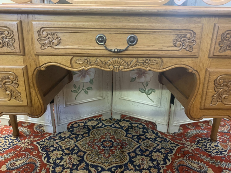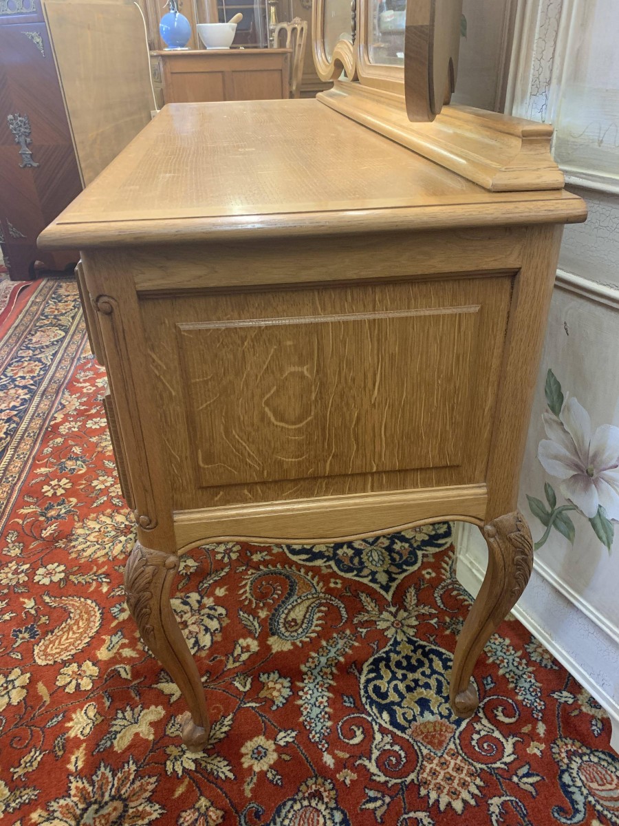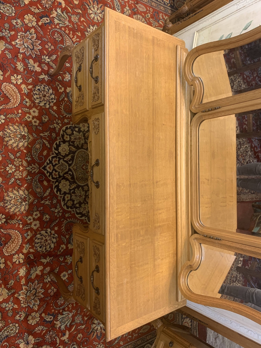 The fixed bevel edged central mirror rises to an ornate carving. This mirror is flanked by a pair of shaped bevelled edge adjustable mirrors. Below is a central carved knee hole drawer, the drawer has a drop handle and ornate carving below, this drawer is flanked by a pair of carved recessed panelled drawers, each drawer having drop handles. Recessed panelled sides, shaped skirt, this beautiful dressing table stands on four carved cabriole shaped legs. Please note we are also listing a matching four-door break front armoire and pair of bedside cabinets.