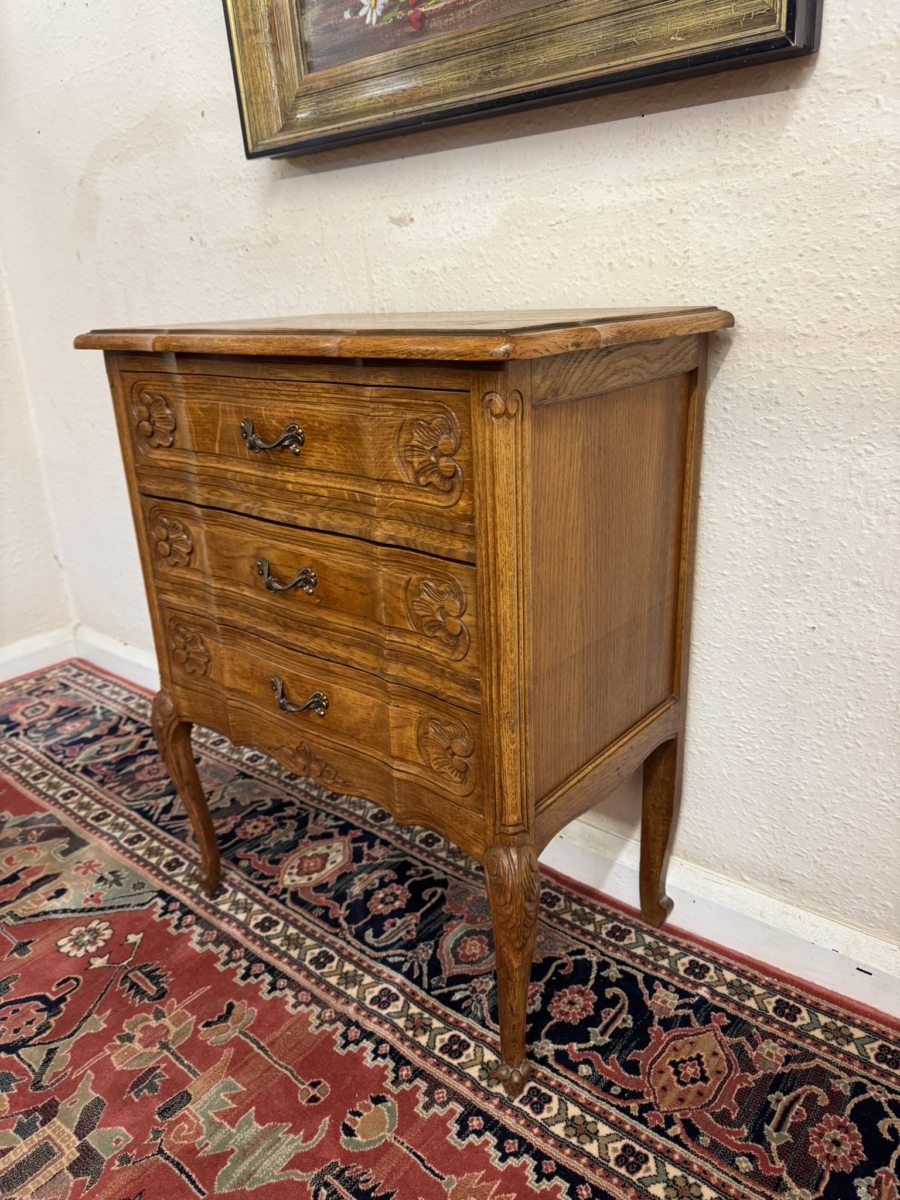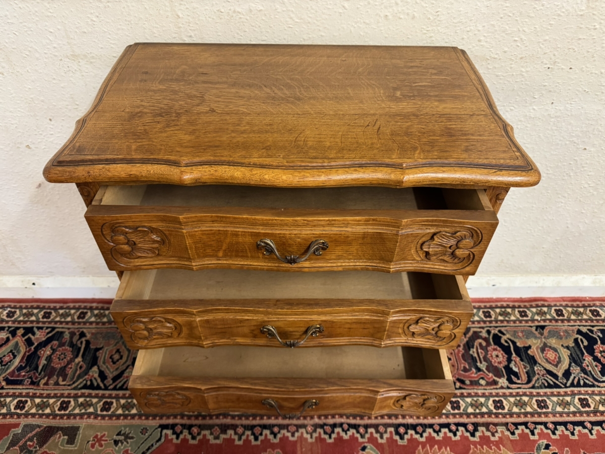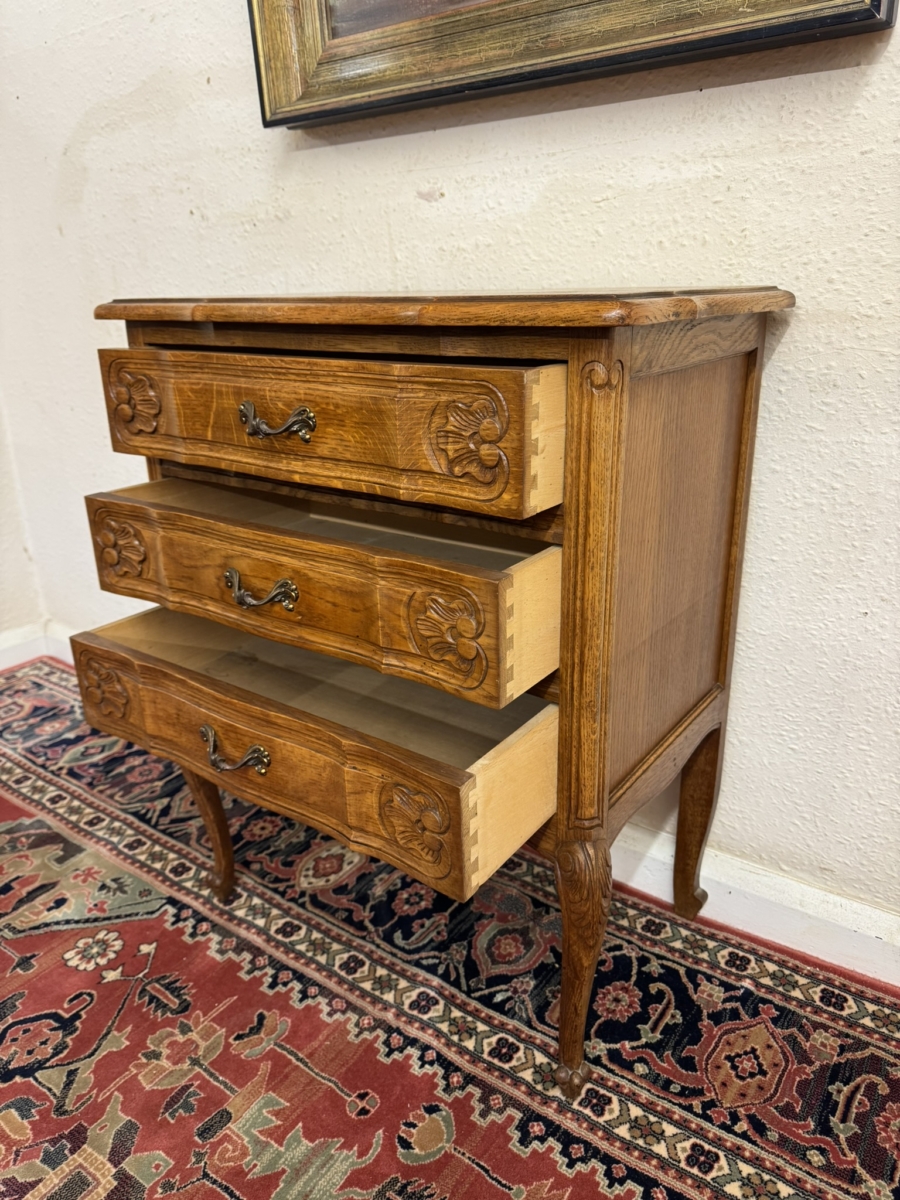 This neat sized French chest of drawers is in excellent condition. The shaped top sits above three carved curved drawers, each drawer having an ornate brass handle. Recessed panelled sides, shaped skirt with central carving and standing on carved cabriole shaped legs.