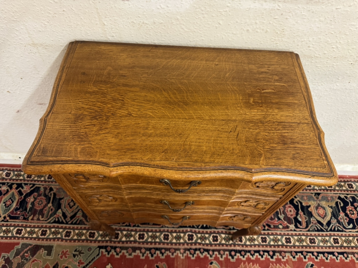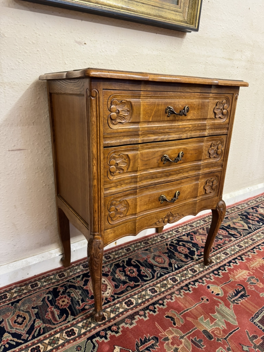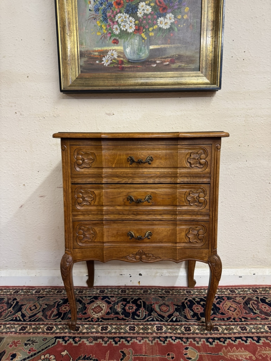 This neat sized French chest of drawers is in excellent condition. The shaped top sits above three carved curved drawers, each drawer having an ornate brass handle. Recessed panelled sides, shaped skirt with central carving and standing on carved cabriole shaped legs.