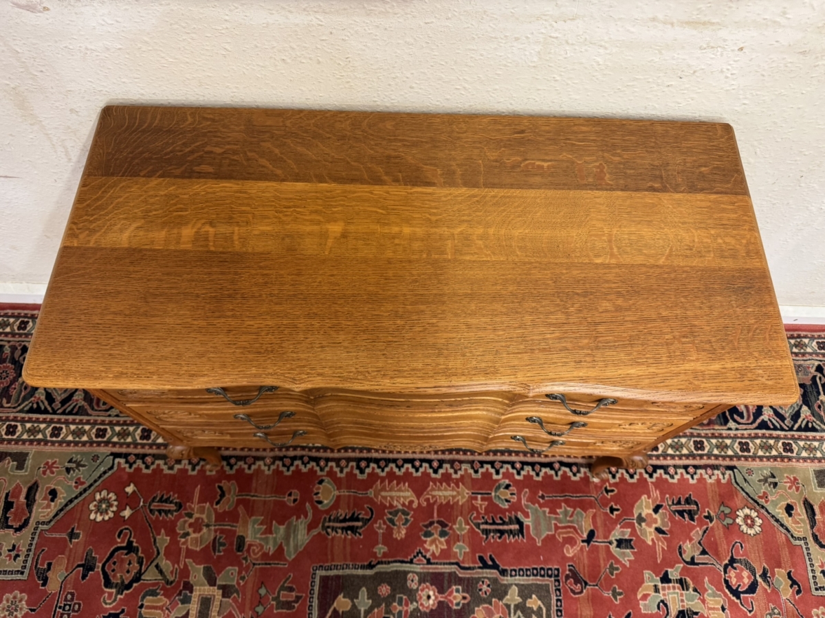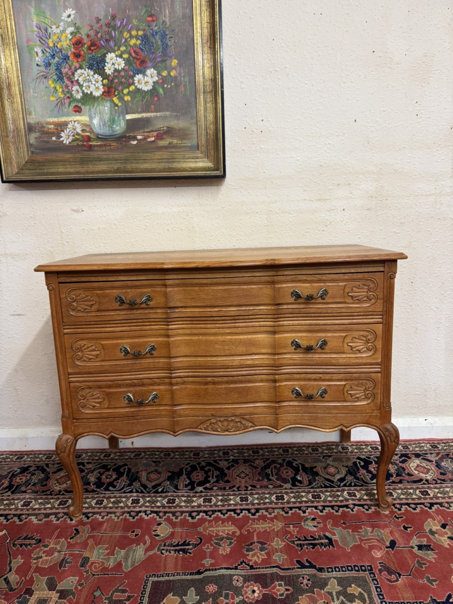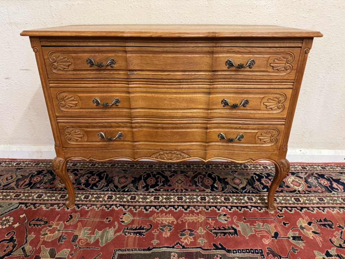 This fine chest is in excellent condition. The shaped over sailing top sits above three long curved drawers, each drawer having a pair of ornate brass handles and carved decoration. Shaped skirt with central carving and standing on carved cabriole shaped legs to the front.