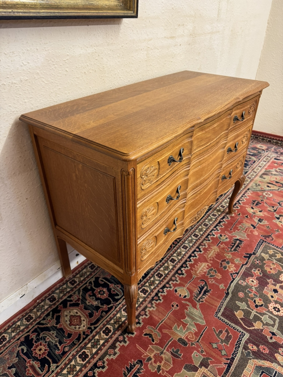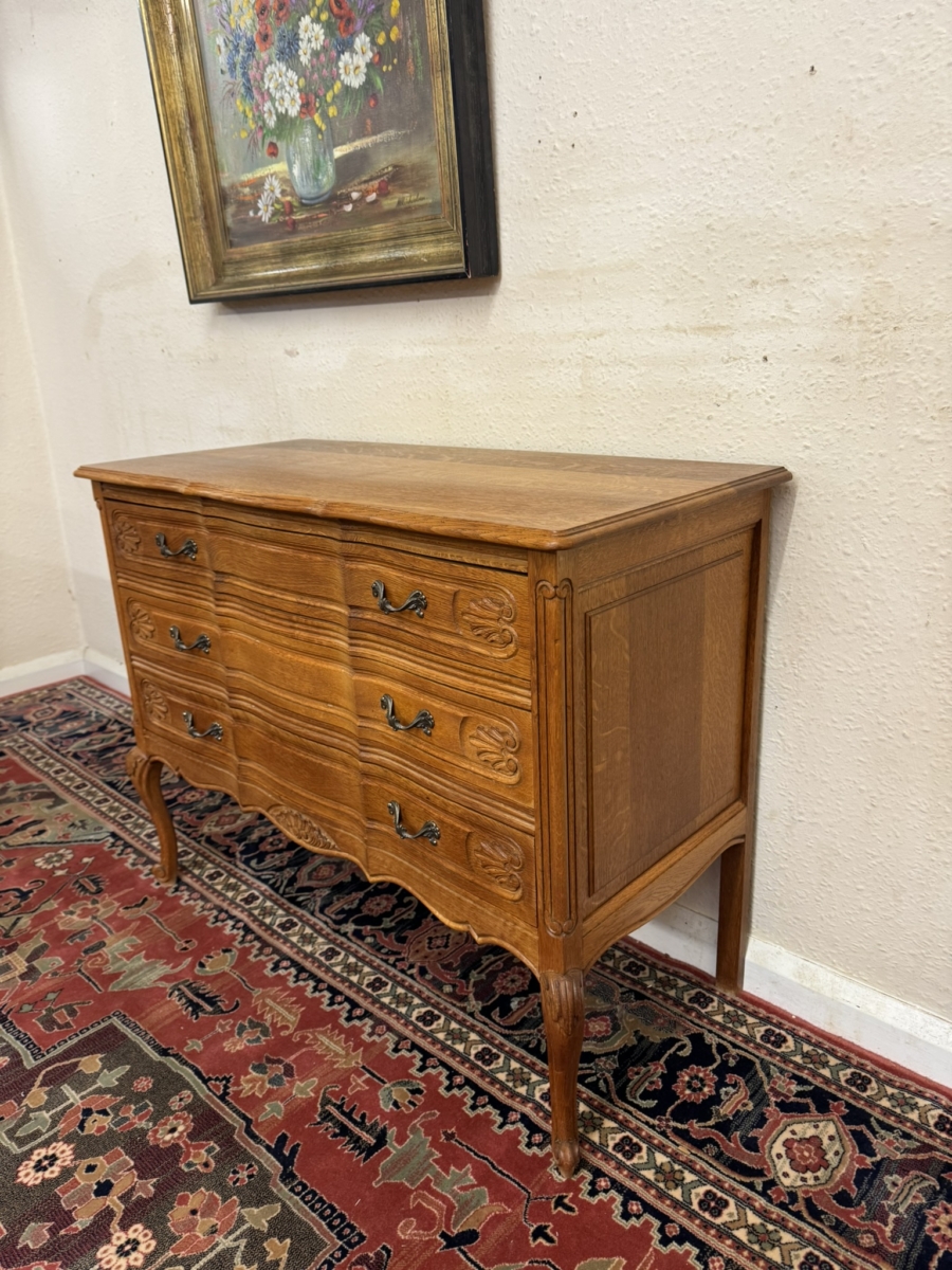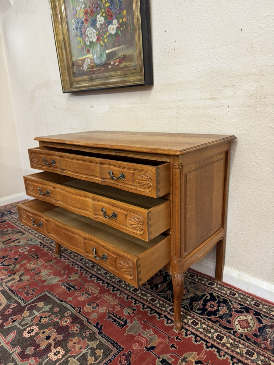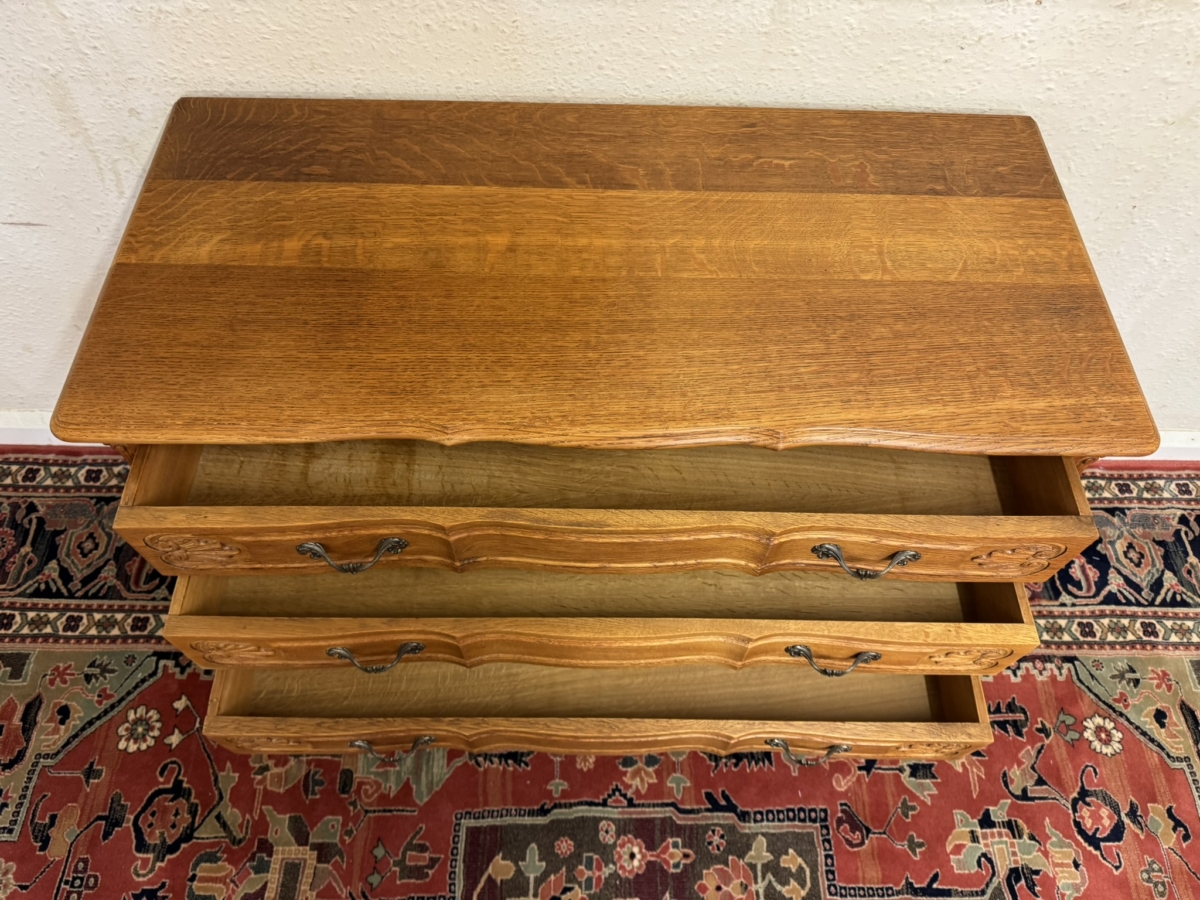 This fine chest is in excellent condition. The shaped over sailing top sits above three long curved drawers, each drawer having a pair of ornate brass handles and carved decoration. Shaped skirt with central carving and standing on carved cabriole shaped legs to the front.