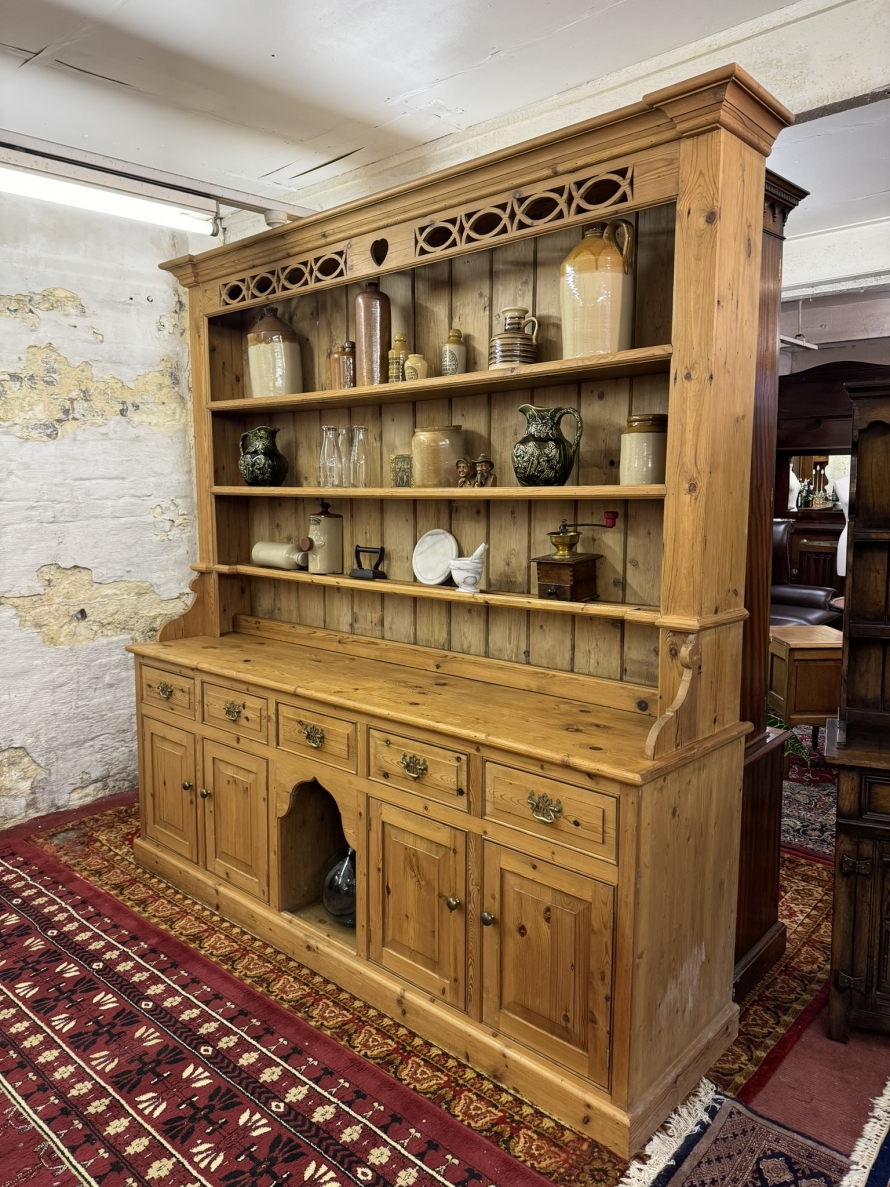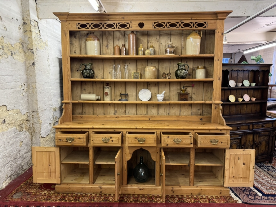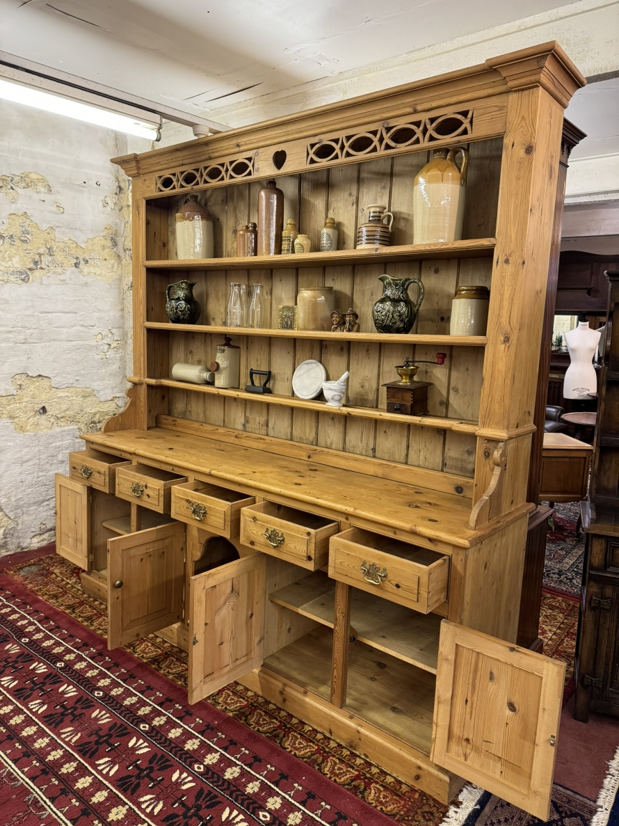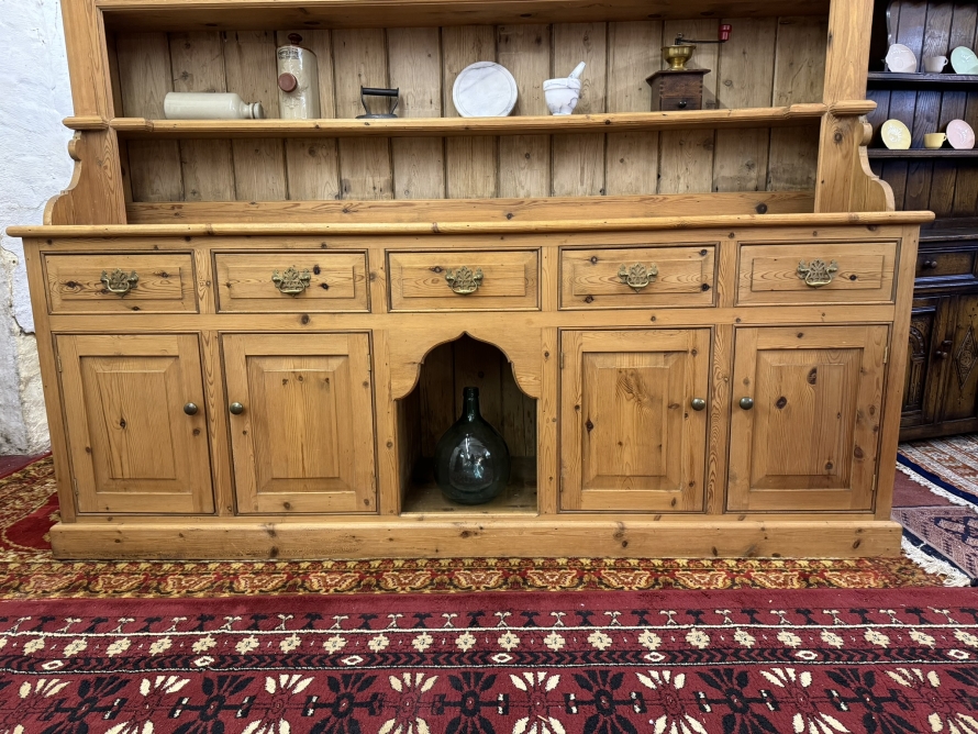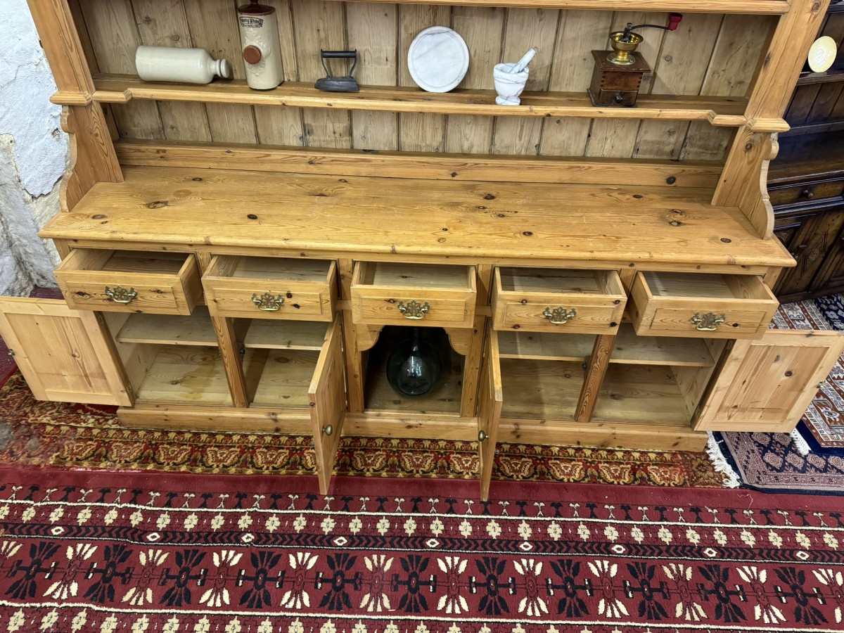 This lovely impressive dresser is ready to be placed directly into the home. The plate rack back has a stepped cornice with carving below, boarded back with three shelves. The dresser base having five drawers, four fielded panelled doors with a central open storage section. The doors open to reveal fixed shelve; this stunning dresser sits on a platform base.