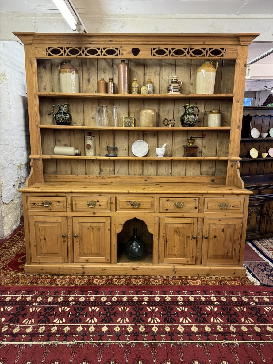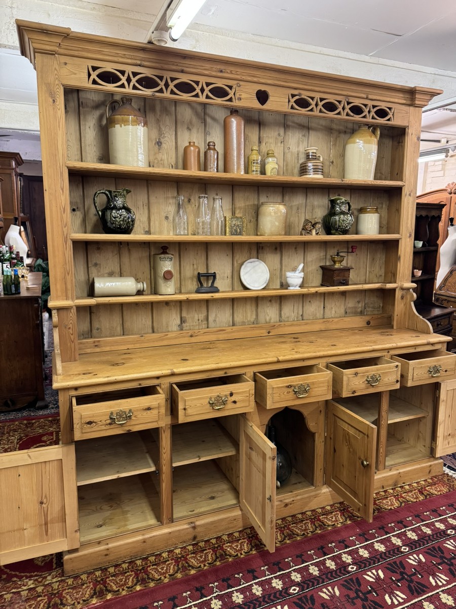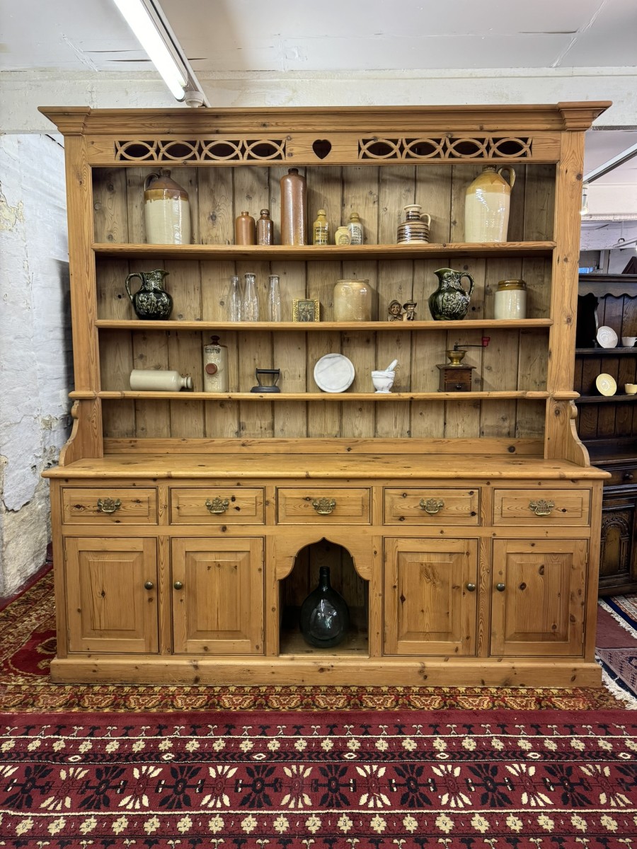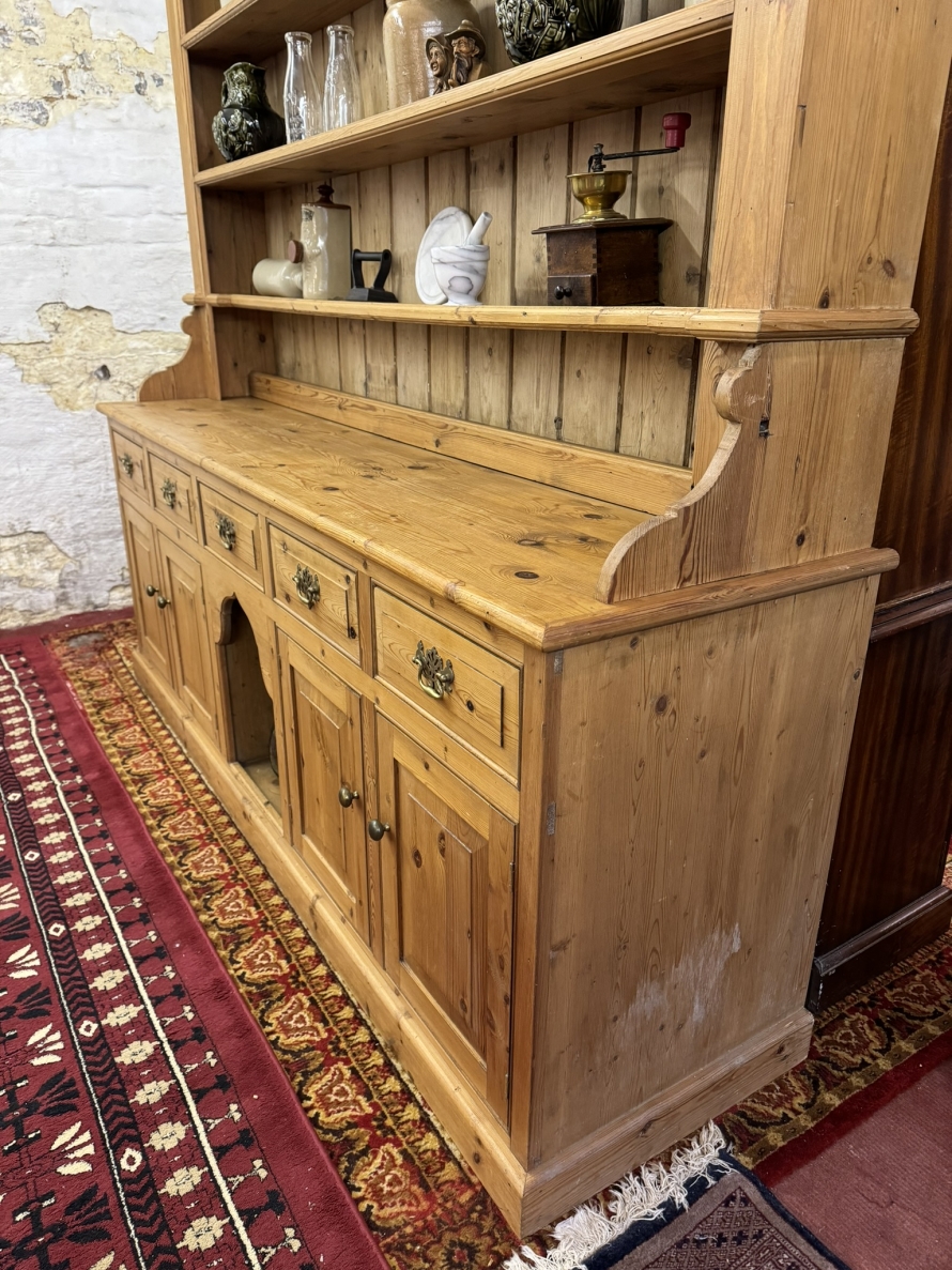 This lovely impressive dresser is ready to be placed directly into the home. The plate rack back has a stepped cornice with carving below, boarded back with three shelves. The dresser base having five drawers, four fielded panelled doors with a central open storage section. The doors open to reveal fixed shelve; this stunning dresser sits on a platform base.