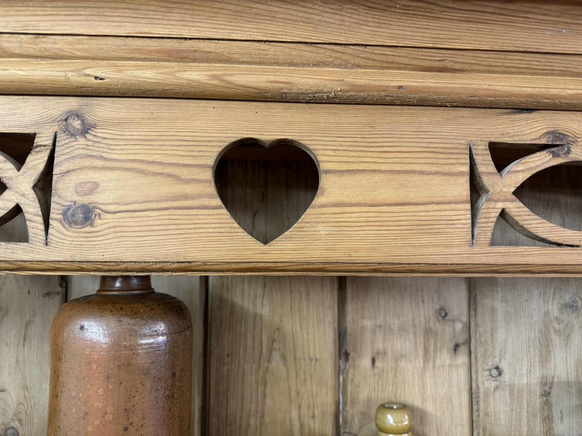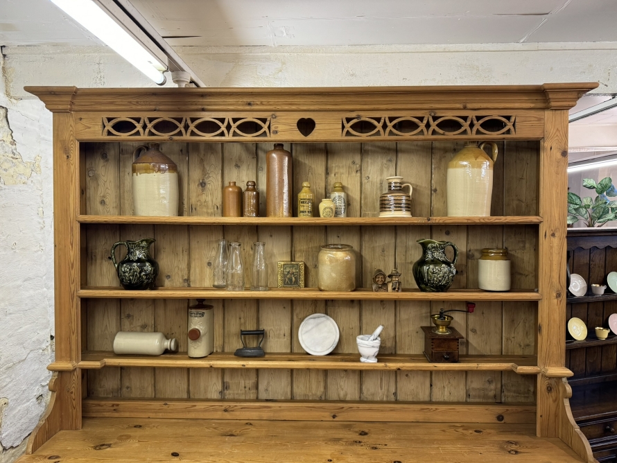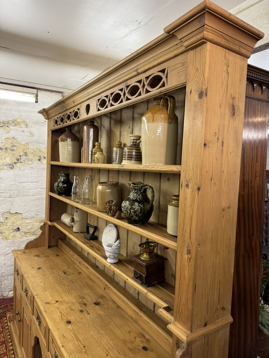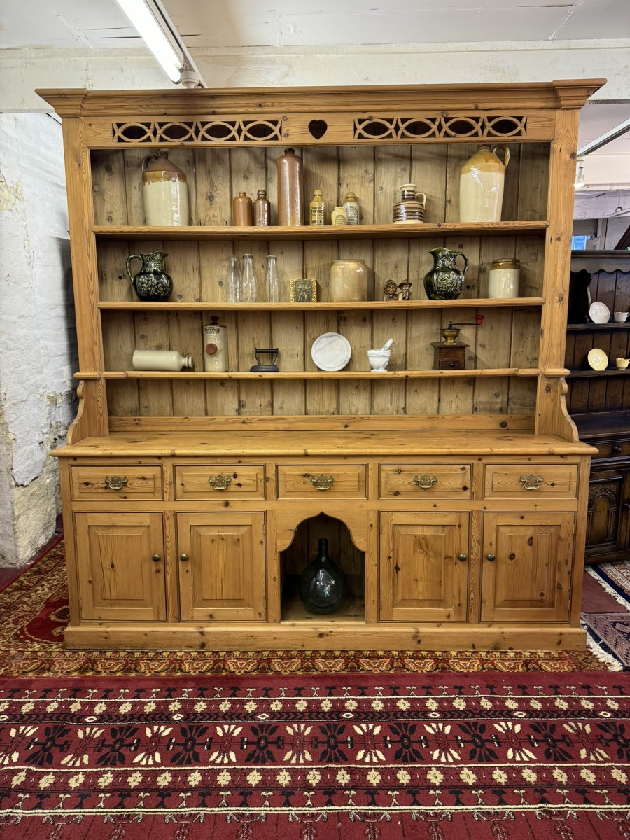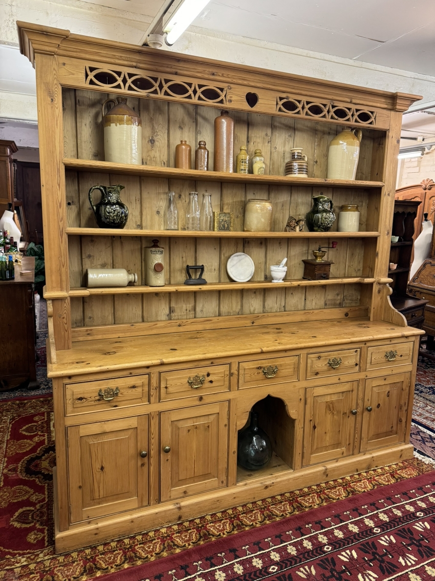 This lovely impressive dresser is ready to be placed directly into the home. The plate rack back has a stepped cornice with carving below, boarded back with three shelves. The dresser base having five drawers, four fielded panelled doors with a central open storage section. The doors open to reveal fixed shelve; this stunning dresser sits on a platform base.