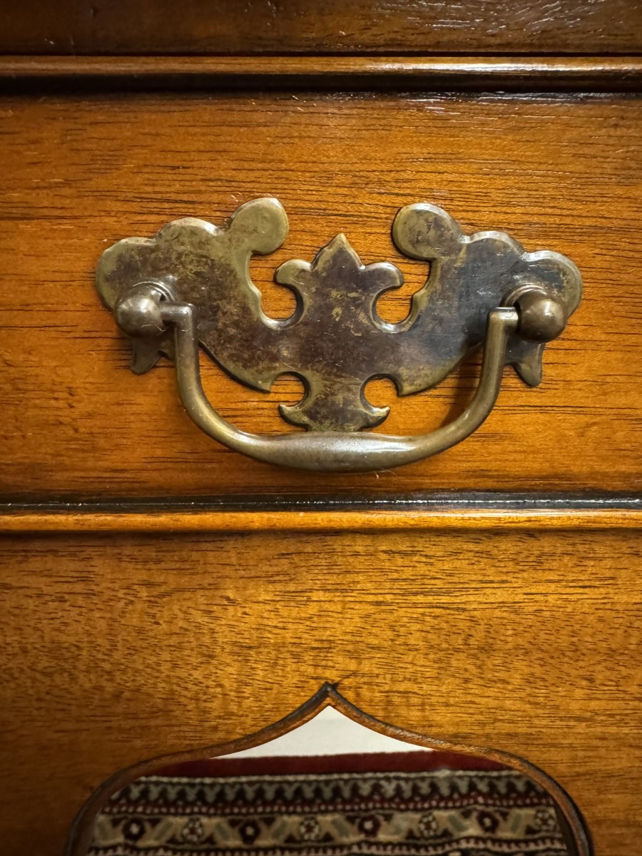 Made in solid mahogany and in excellent condition. The oversailing top sits above five drawers, each drawer having a drop brass handle and decorative back plate. Carved canted corners to the front and standing on elegant cabriole shaped legs.