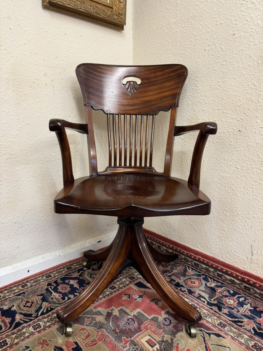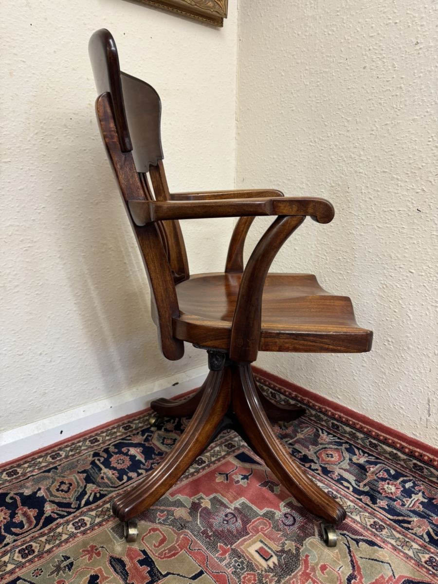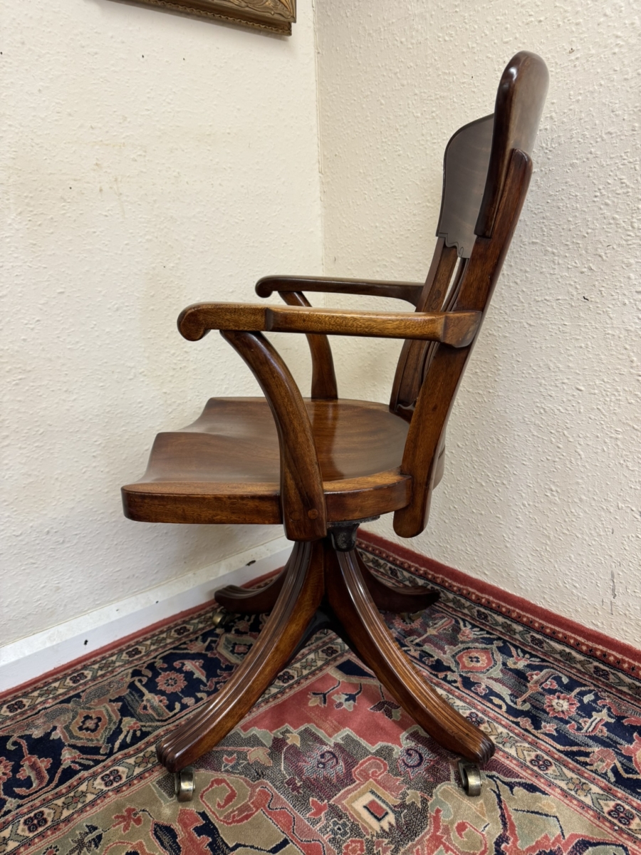 This fine desk chair is in excellent condition and made in solid mahogany. Shaped back, arms and shaped seat. four carved swept legs on brass casters. The chair revolves 360°.