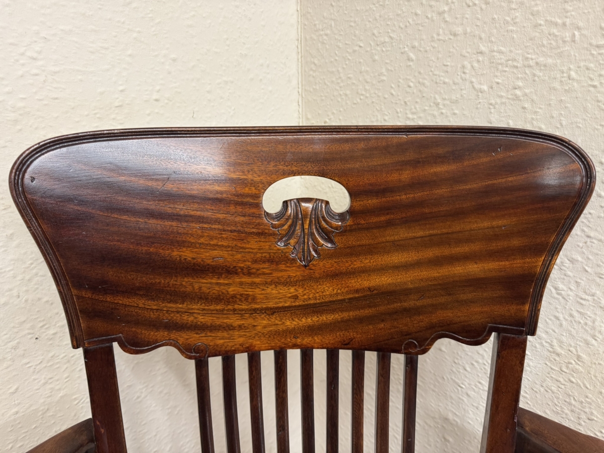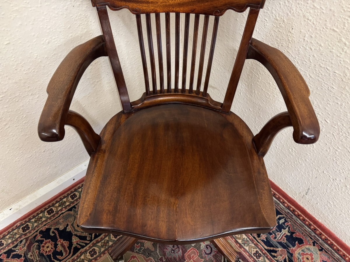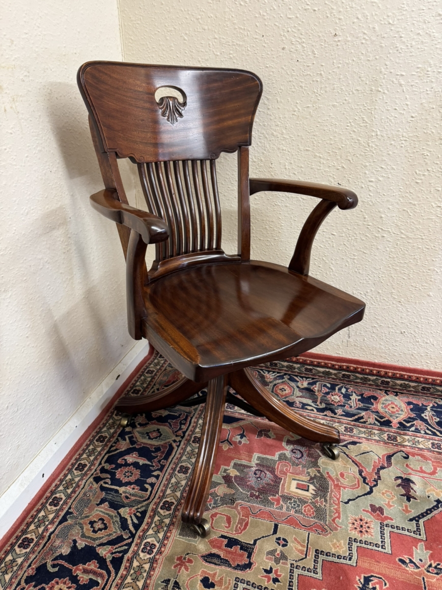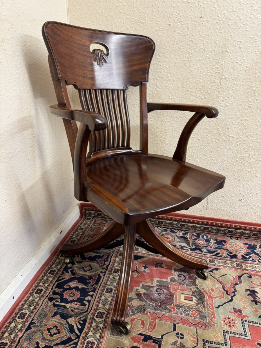 This fine desk chair is in excellent condition and made in solid mahogany. Shaped back, arms and shaped seat. four carved swept legs on brass casters. The chair revolves 360°.