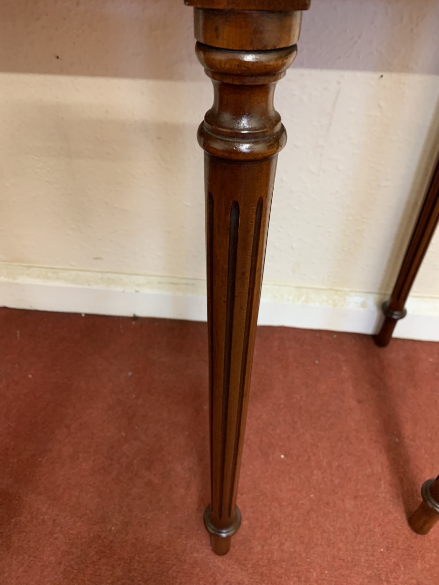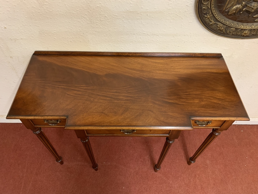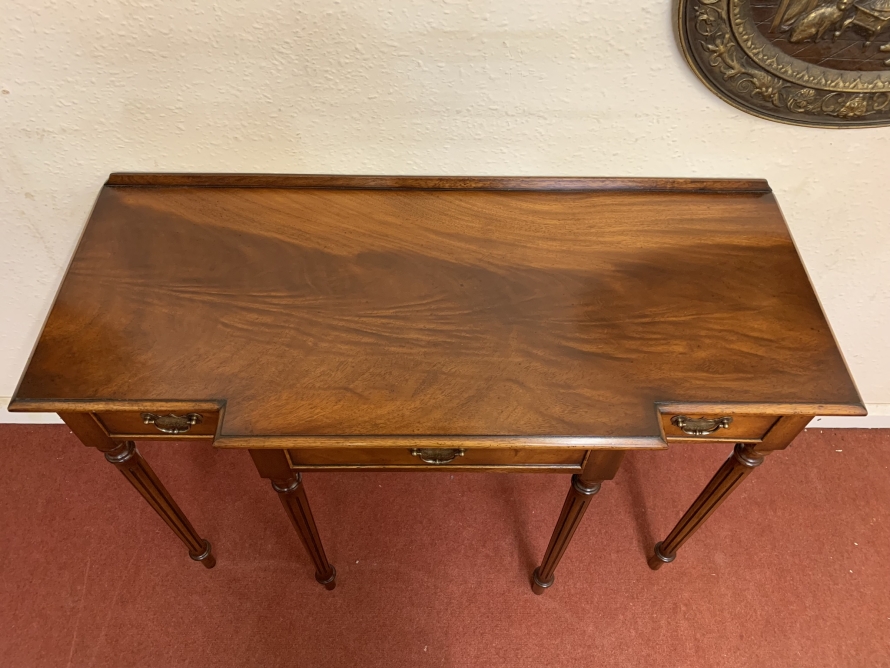 Made in striking mahogany this side table/hall table is in excellent condition. The brakefront central drawer is flanked by a pair of drawers, each drawer having an ornate brass handle. The drawers slide easily open and closed. This super quality side table / hall table stands on six reeded legs with turned feet.