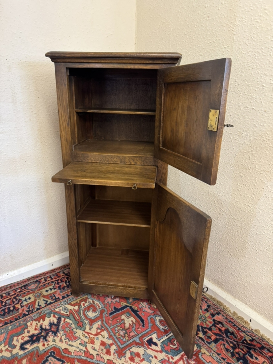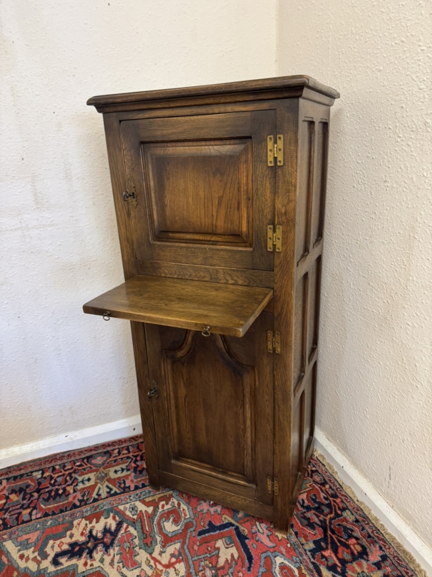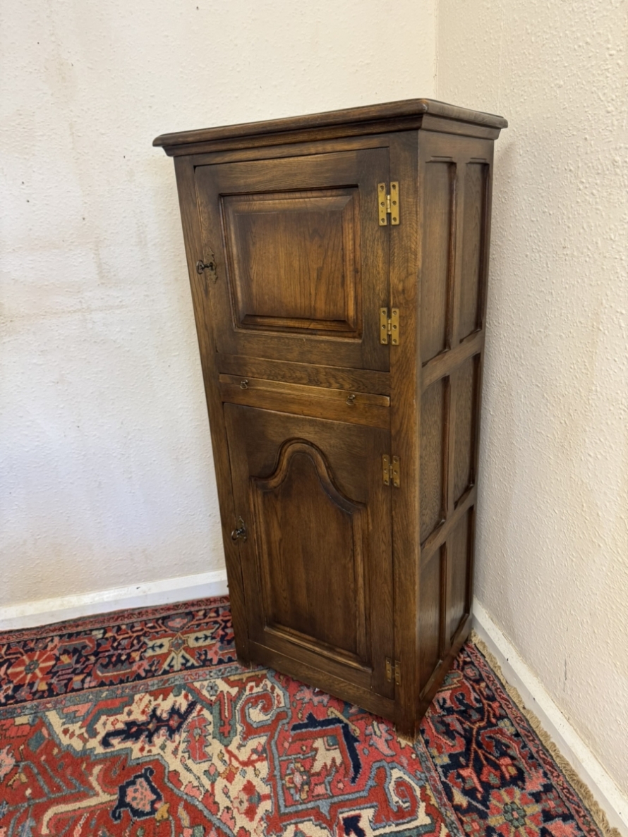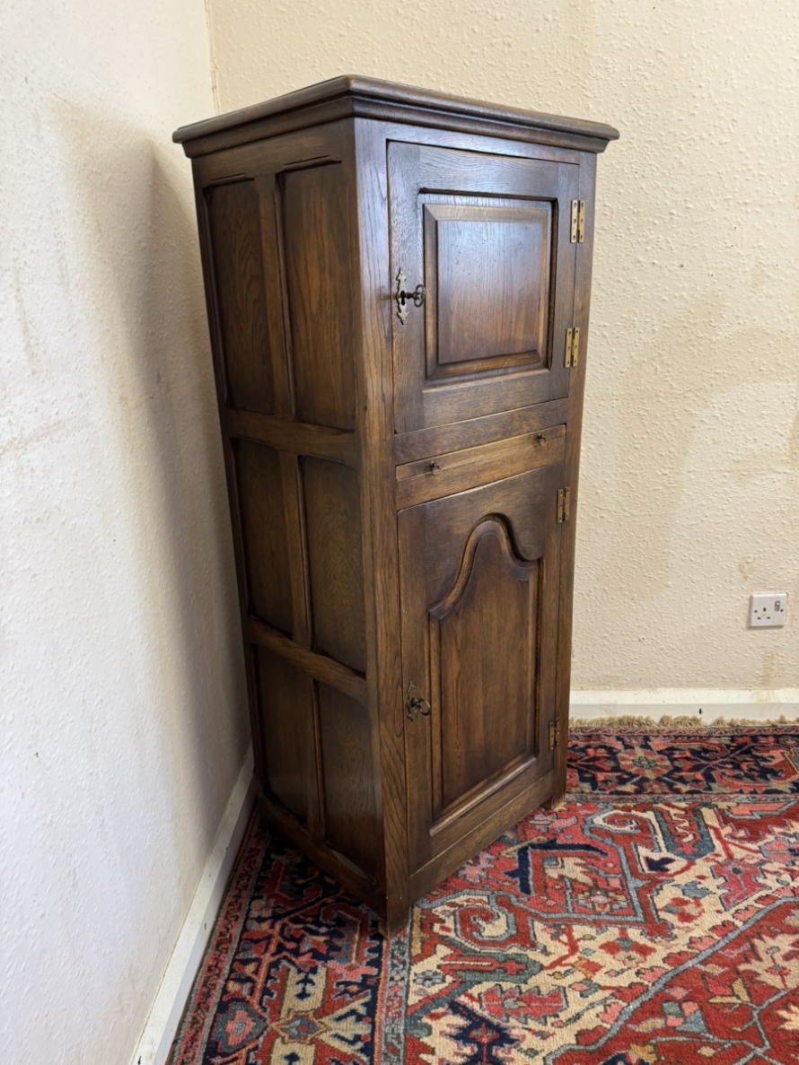 This neat sized cupboard is made in fabulous solid oak. The over sailing top sits above a lockable recessed panelled cupboard door, the door having brass H hinges, brass escutcheon and key. The door opens to reveal a shelf, below is a sliding shelf, below the shelf is a shaped recessed panelled lockable cupboard door, the door having brass H hinges and brass escutcheon and key. The door opens to reveal a shelf. Recessed panelled sides and standing on traditional block feet.