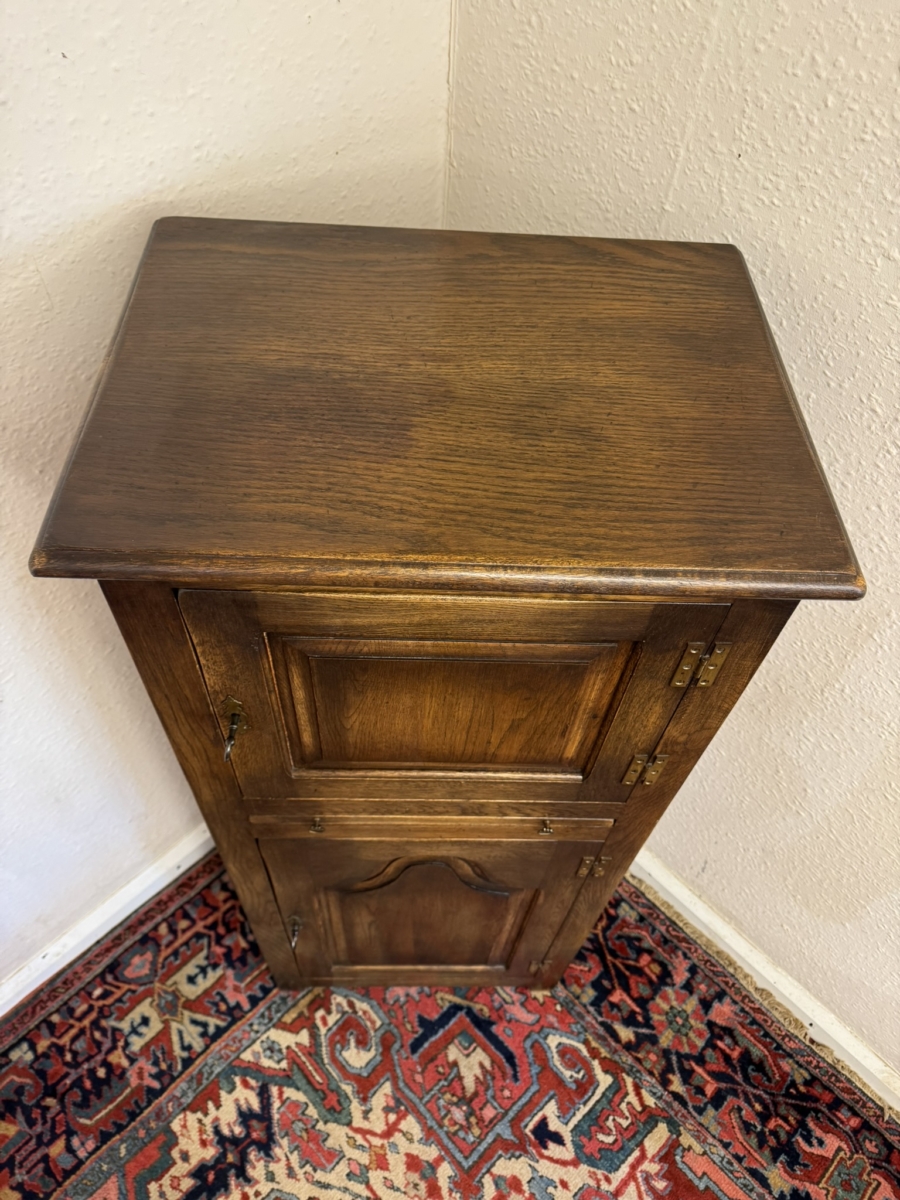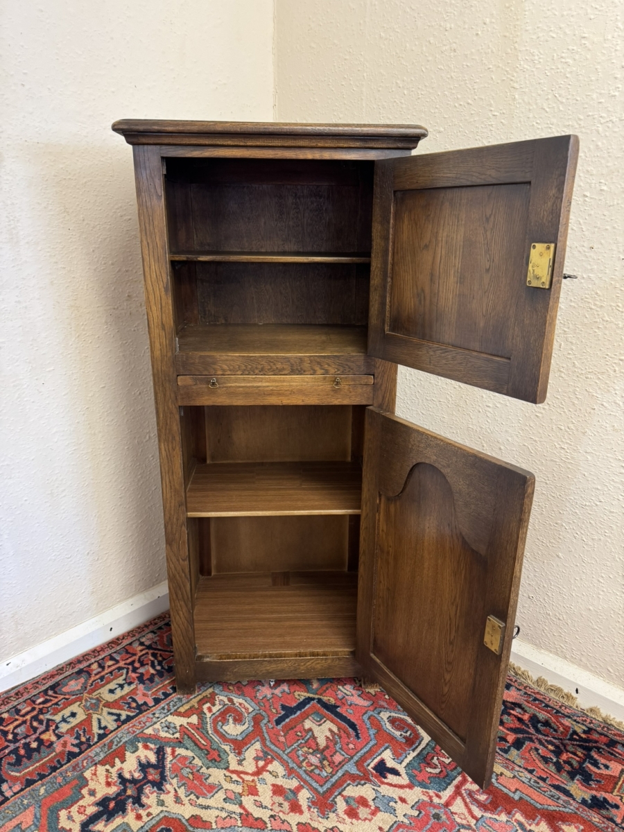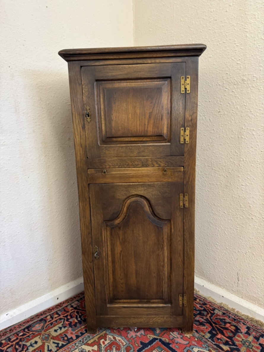 This neat sized cupboard is made in fabulous solid oak. The over sailing top sits above a lockable recessed panelled cupboard door, the door having brass H hinges, brass escutcheon and key. The door opens to reveal a shelf, below is a sliding shelf, below the shelf is a shaped recessed panelled lockable cupboard door, the door having brass H hinges and brass escutcheon and key. The door opens to reveal a shelf. Recessed panelled sides and standing on traditional block feet.