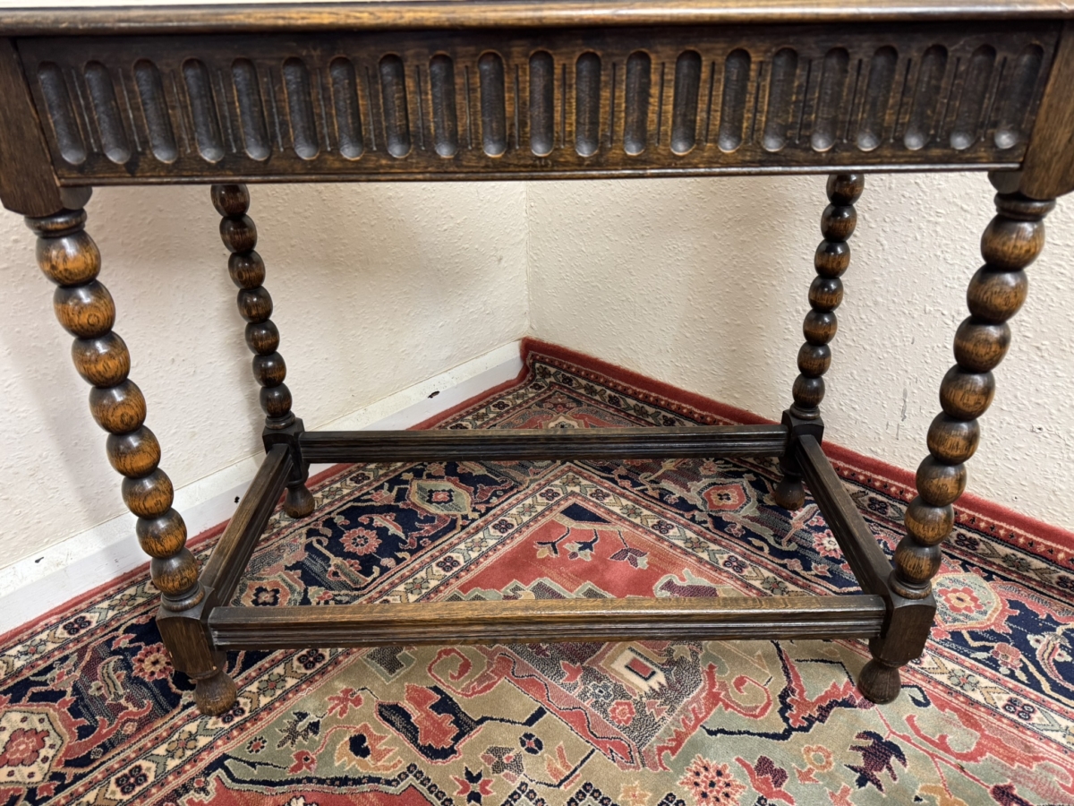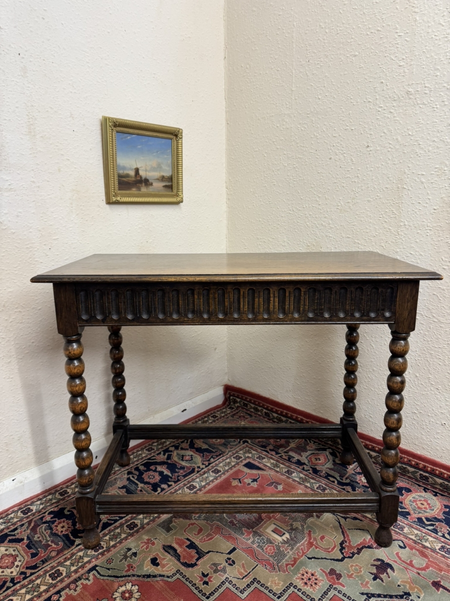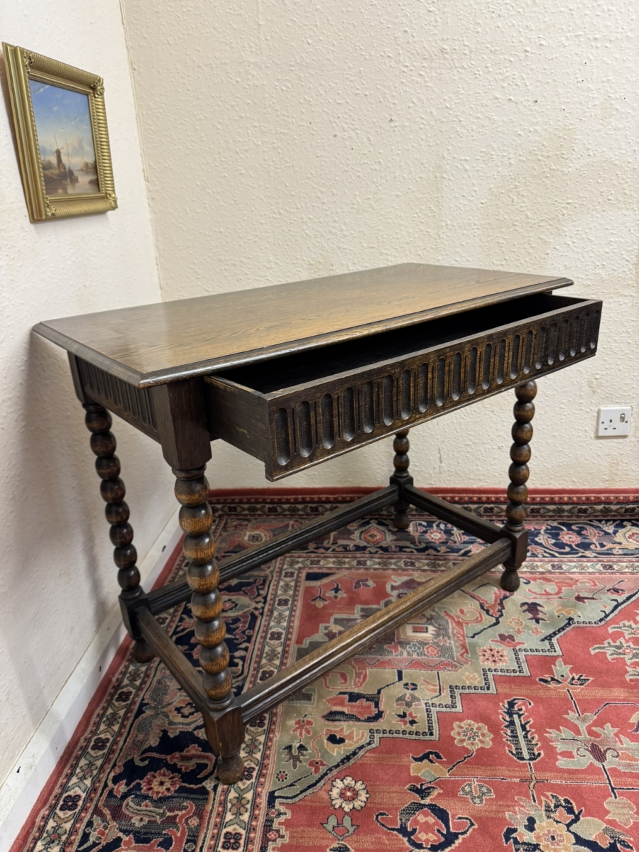 Lovely grained oak table which is in excellent condition. Over sailing top sits above a carved drawer. Four bobbin legs, stretcher supports and standing on turned feet.