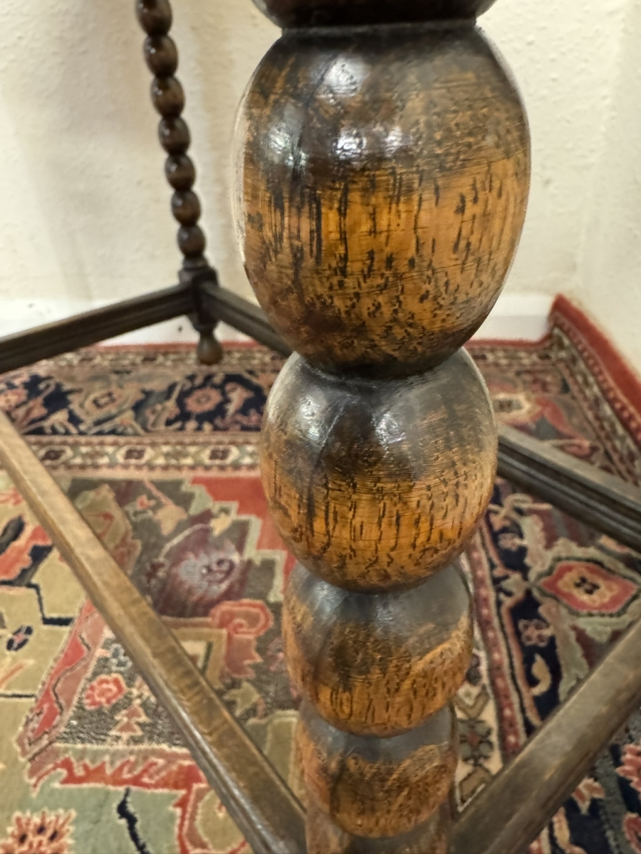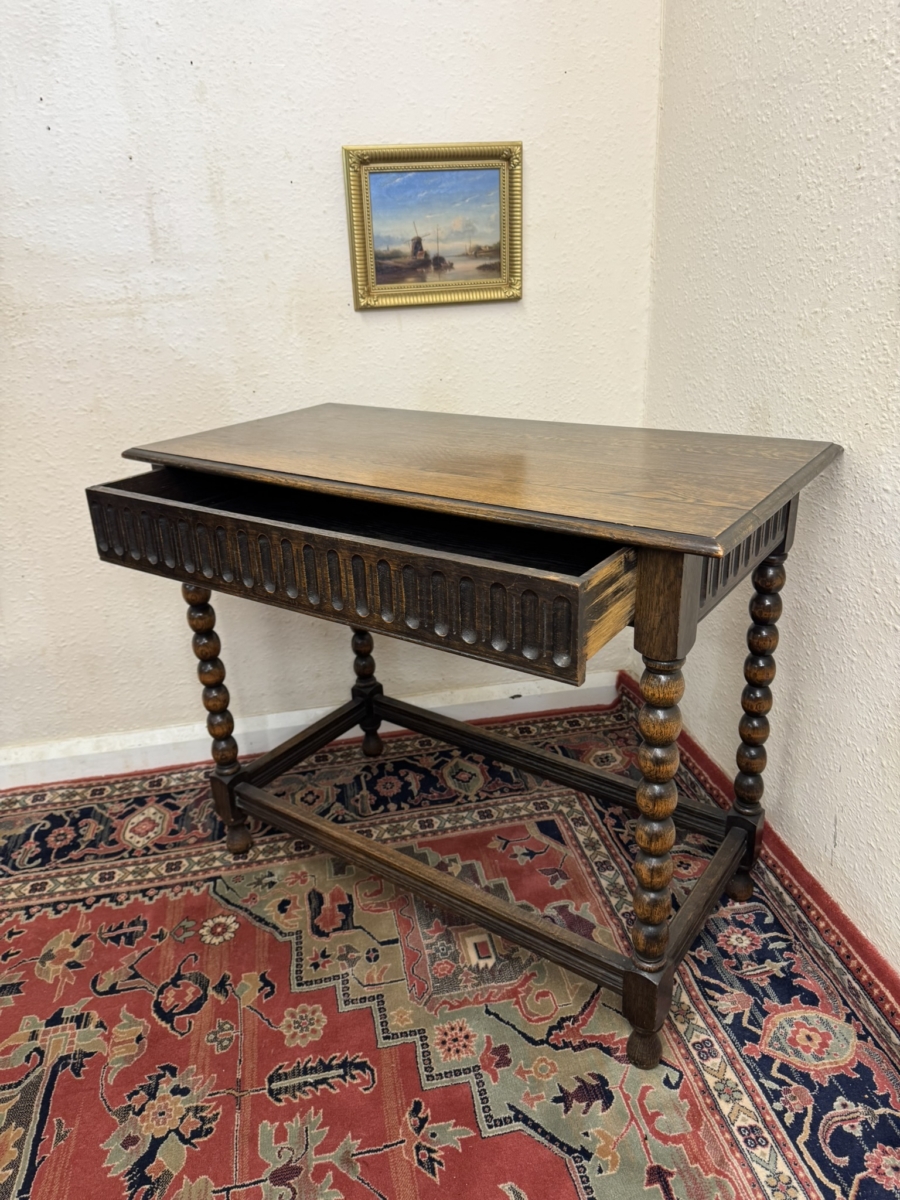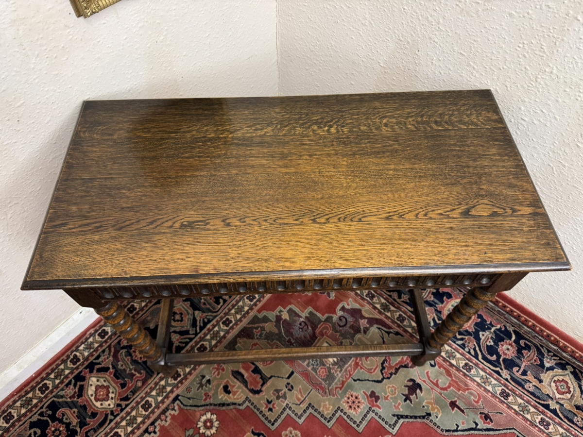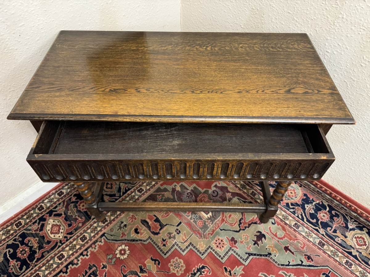 Lovely grained oak table which is in excellent condition. Over sailing top sits above a carved drawer. Four bobbin legs, stretcher supports and standing on turned feet.
