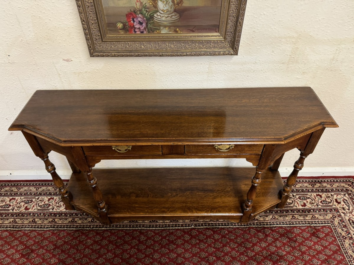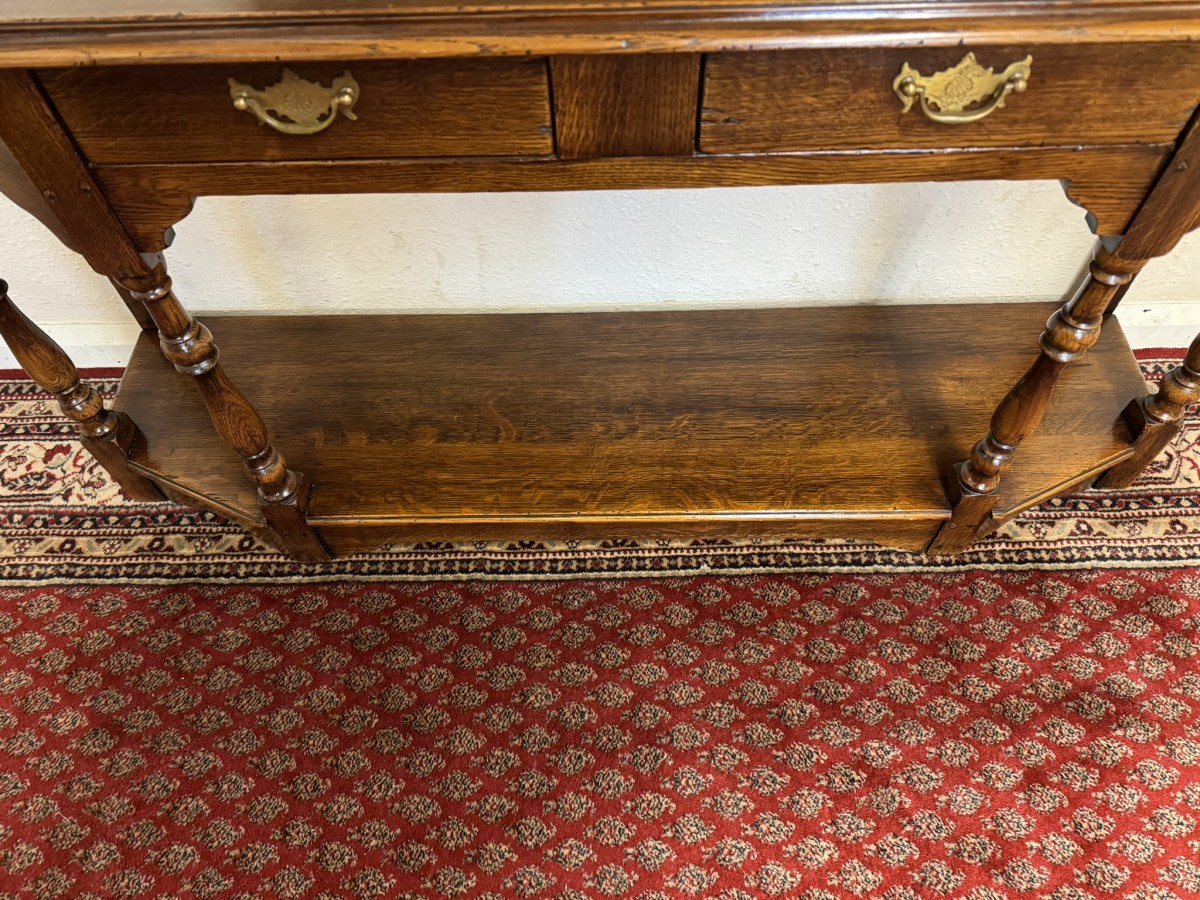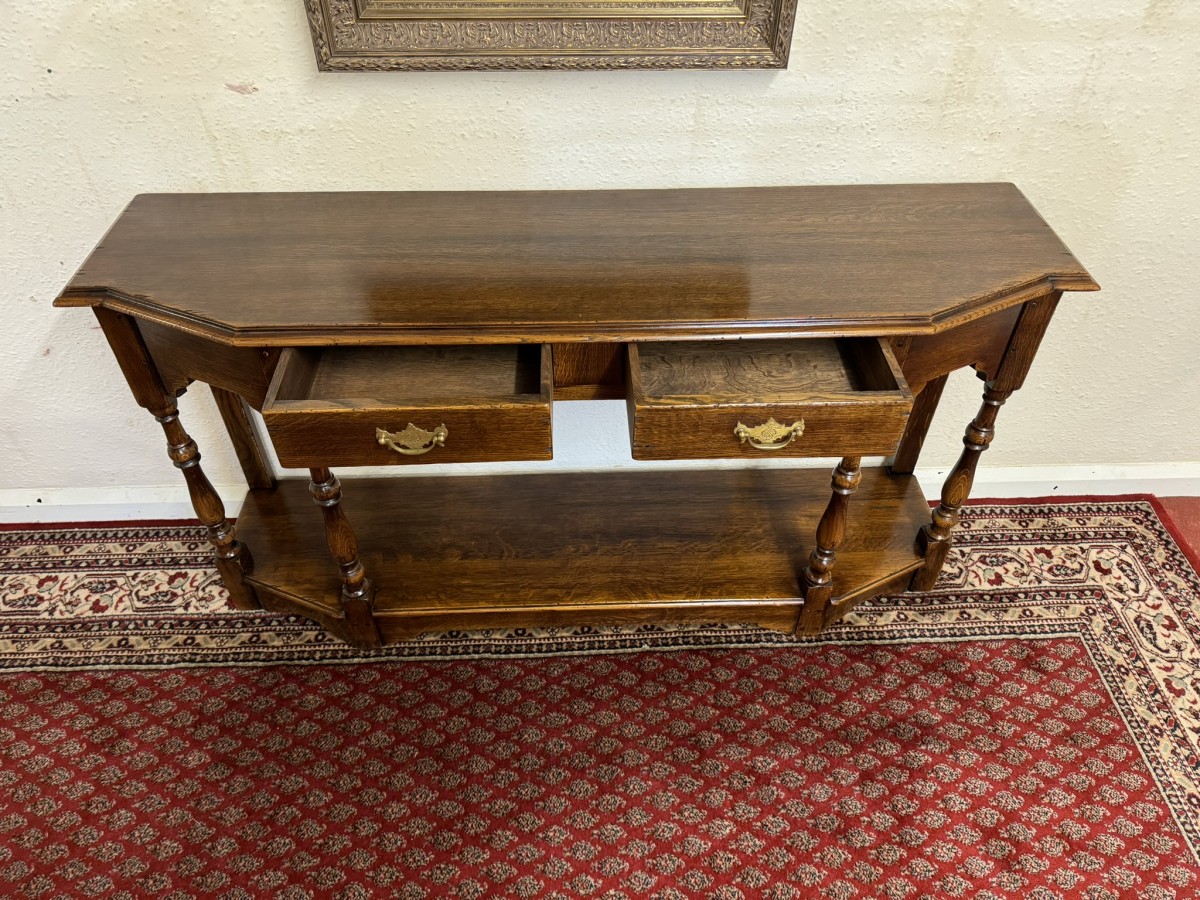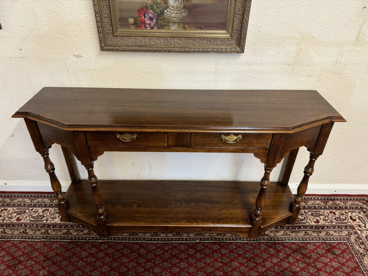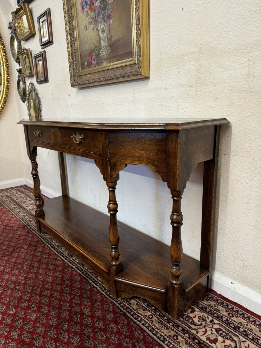 The console table made entirely in solid oak and is in excellent condition. The shaped top sits above two drawers with a shelf below, four elegant turned legs to the front and stands on traditional block feet.
