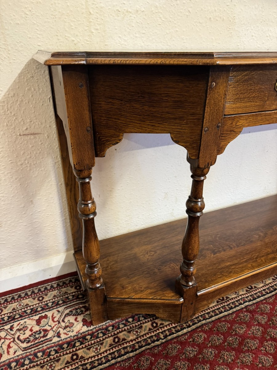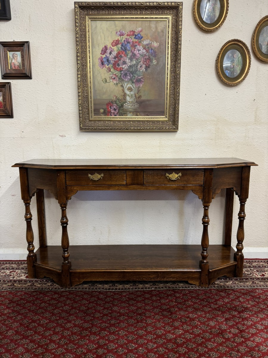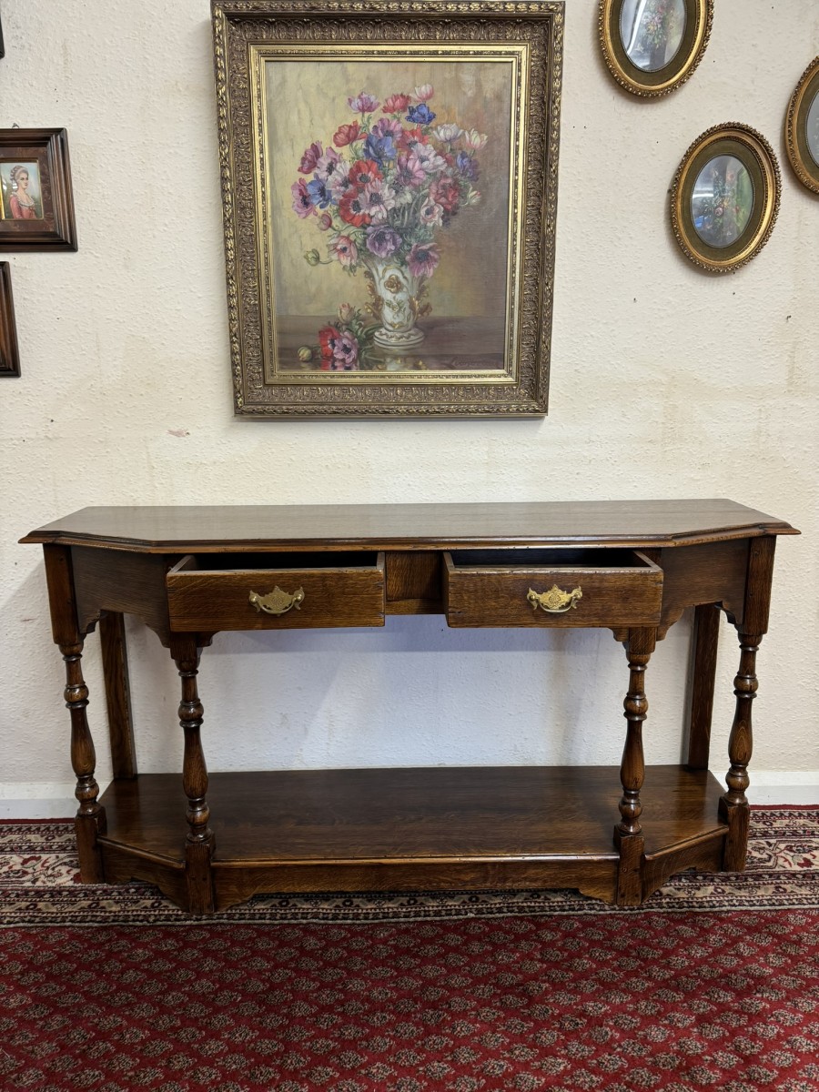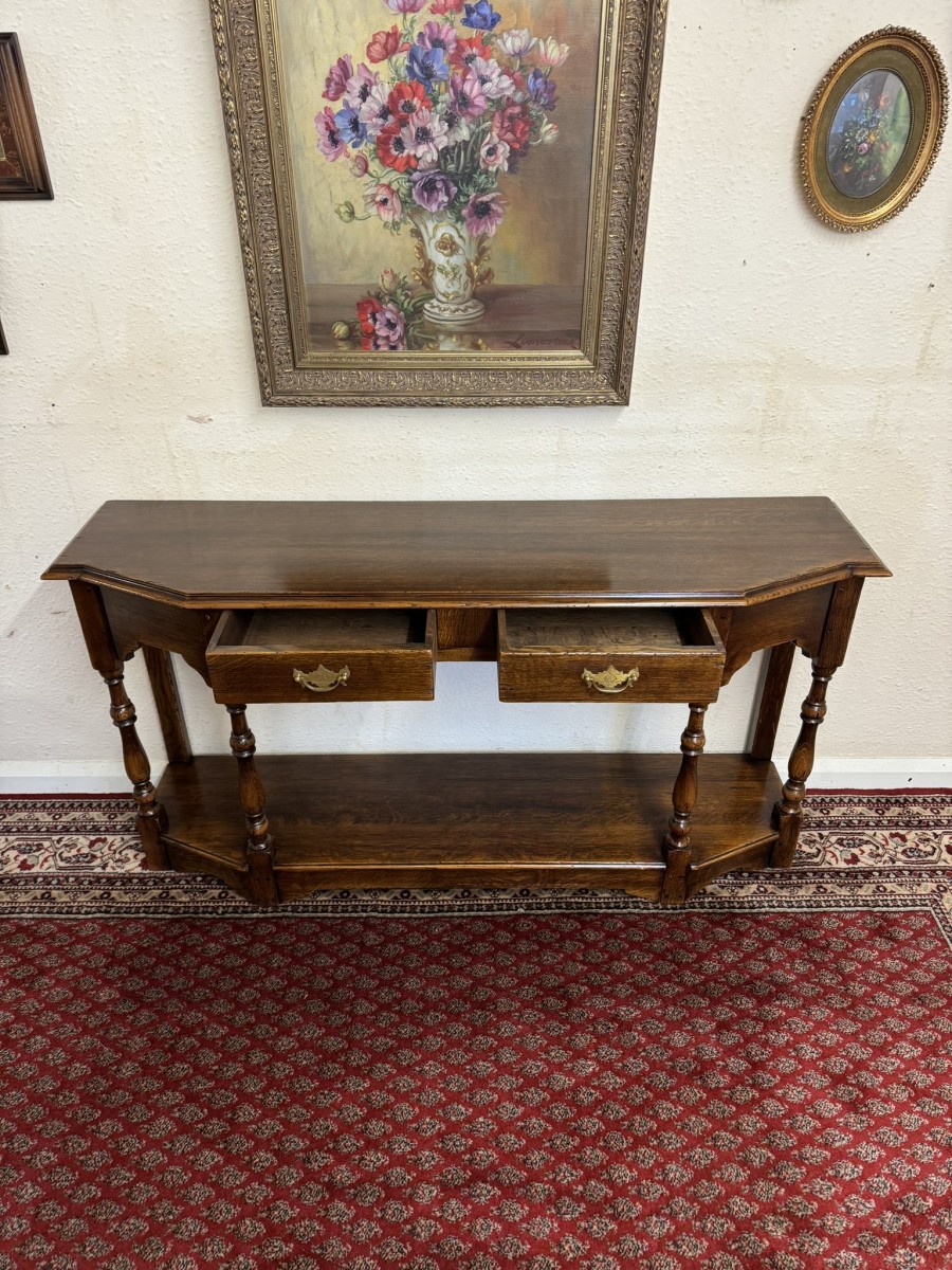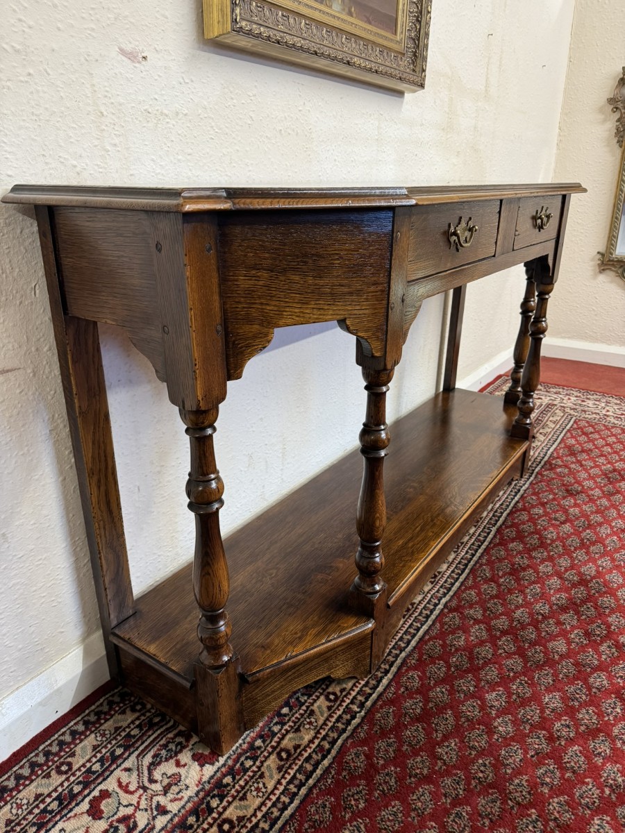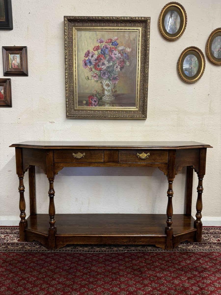 The console table made entirely in solid oak and is in excellent condition. The shaped top sits above two drawers with a shelf below, four elegant turned legs to the front and stands on traditional block feet.