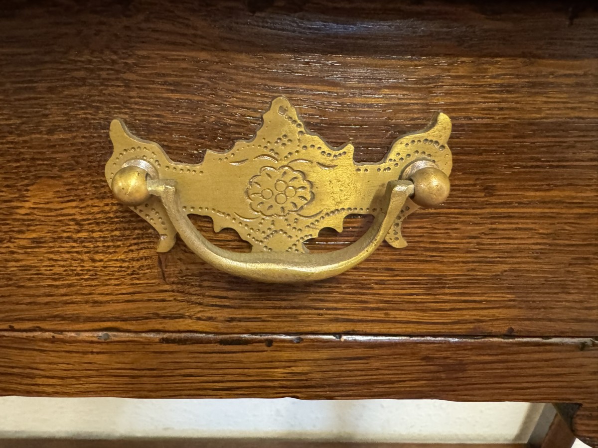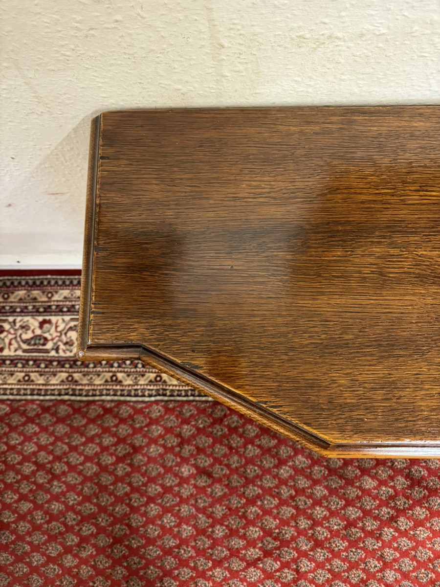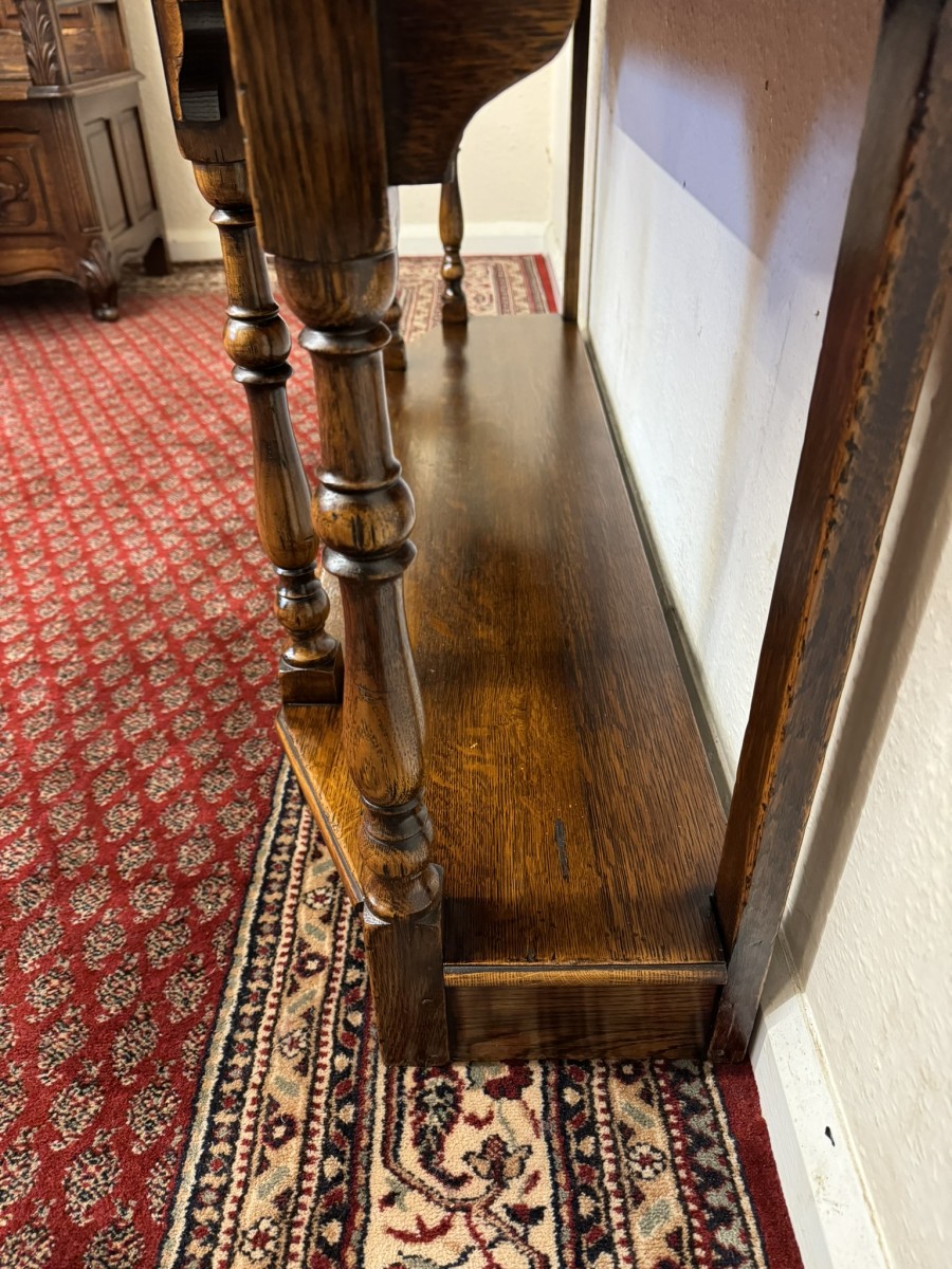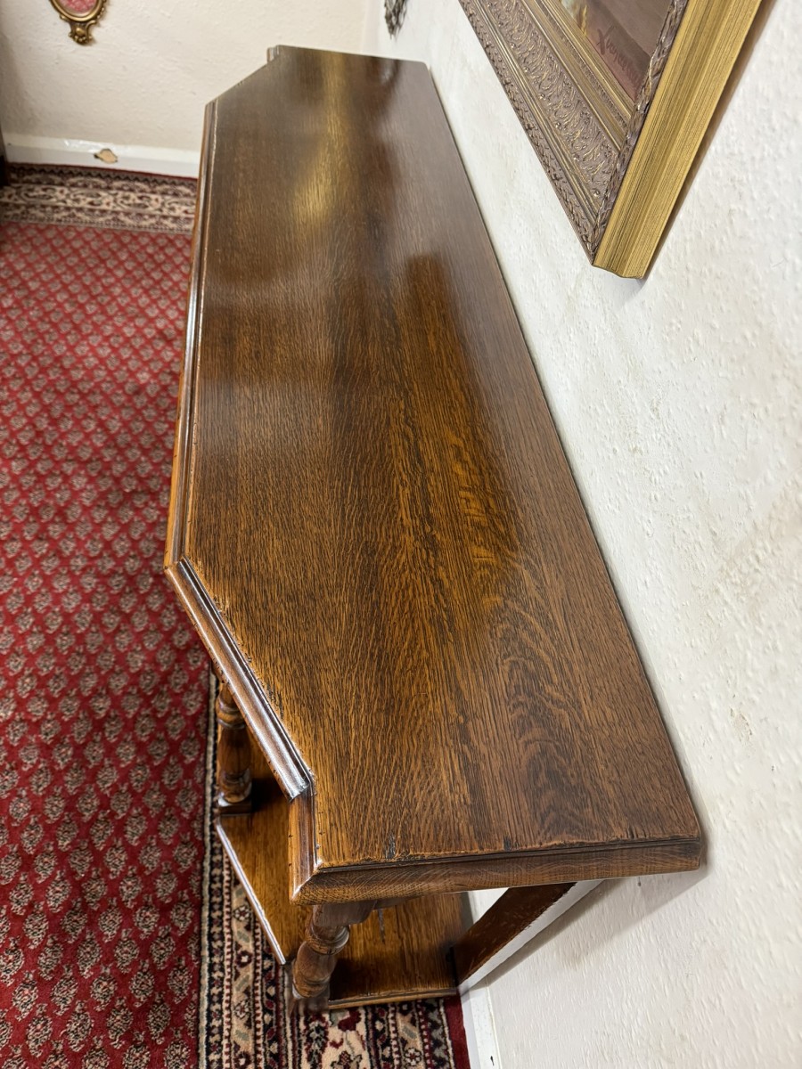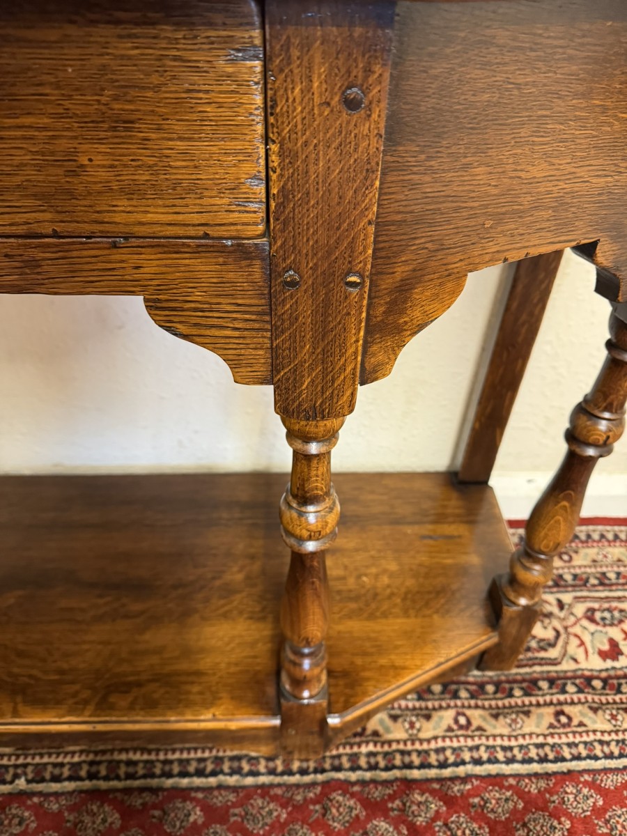 The console table made entirely in solid oak and is in excellent condition. The shaped top sits above two drawers with a shelf below, four elegant turned legs to the front and stands on traditional block feet.