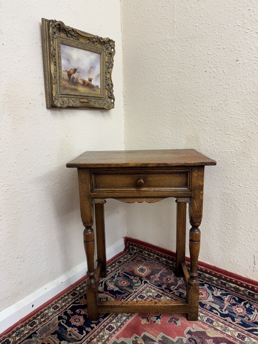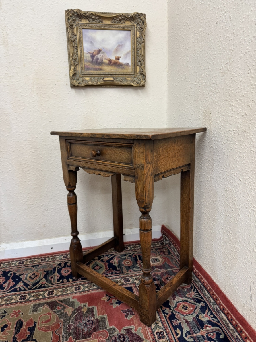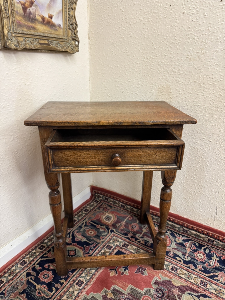 This neat sized table made entirely in solid oak and in excellent condition. The grained oak top sits above a single drawer, the drawer has a turned knob handle. Turned legs to the front, stretcher supports and standing on traditional block feet.