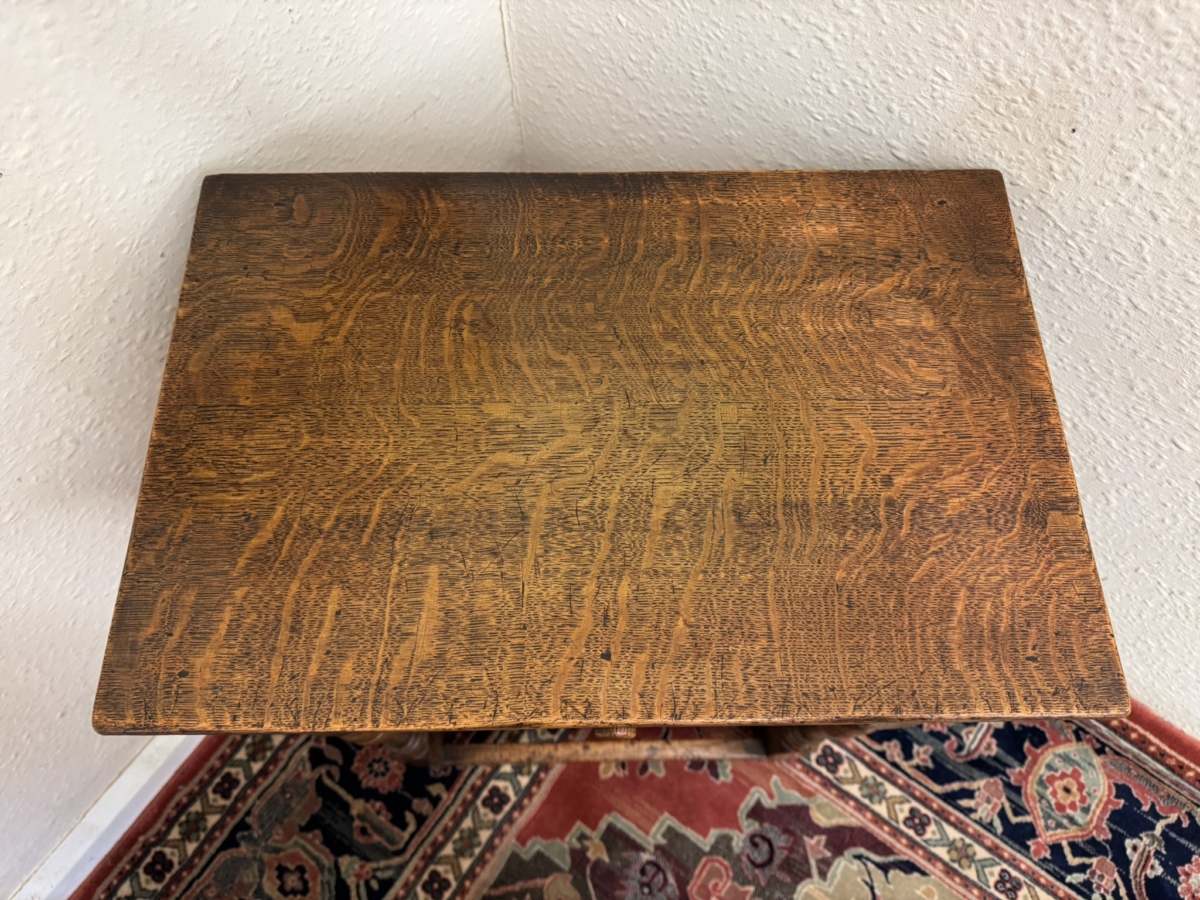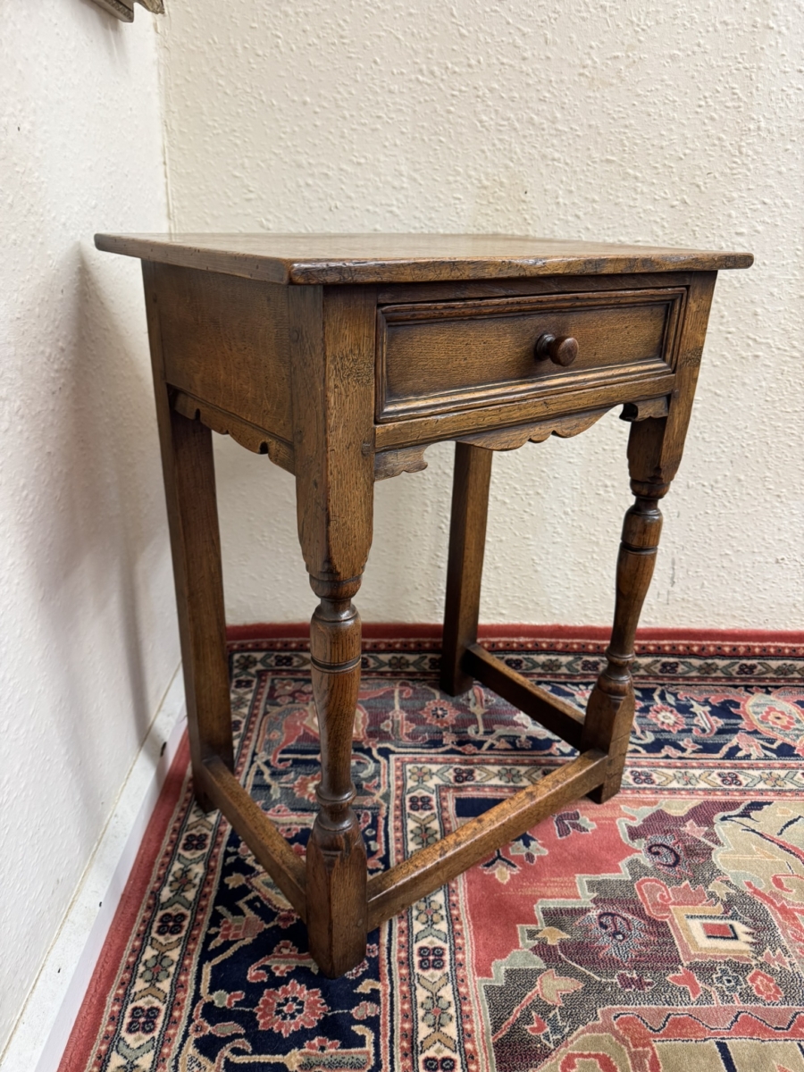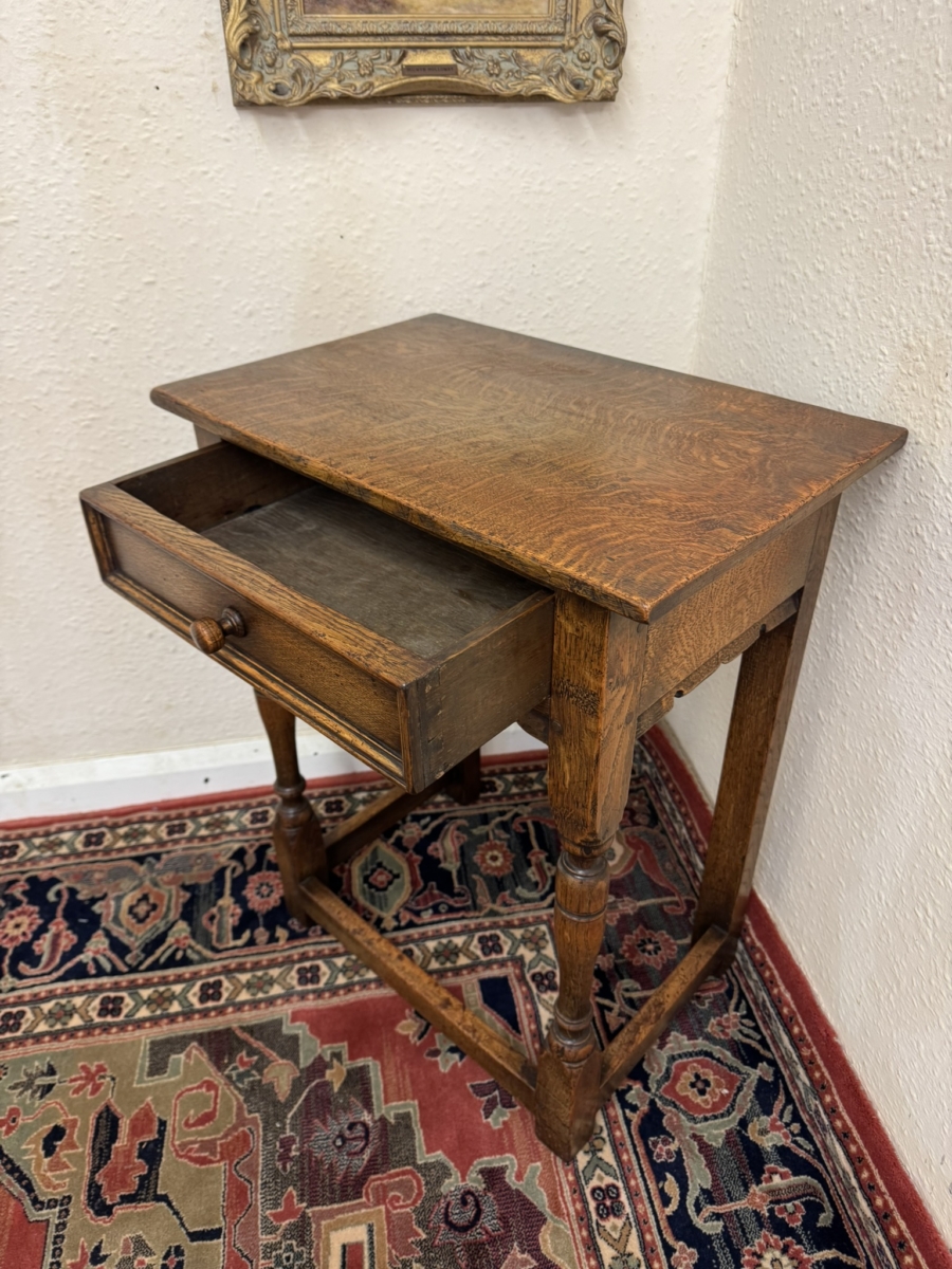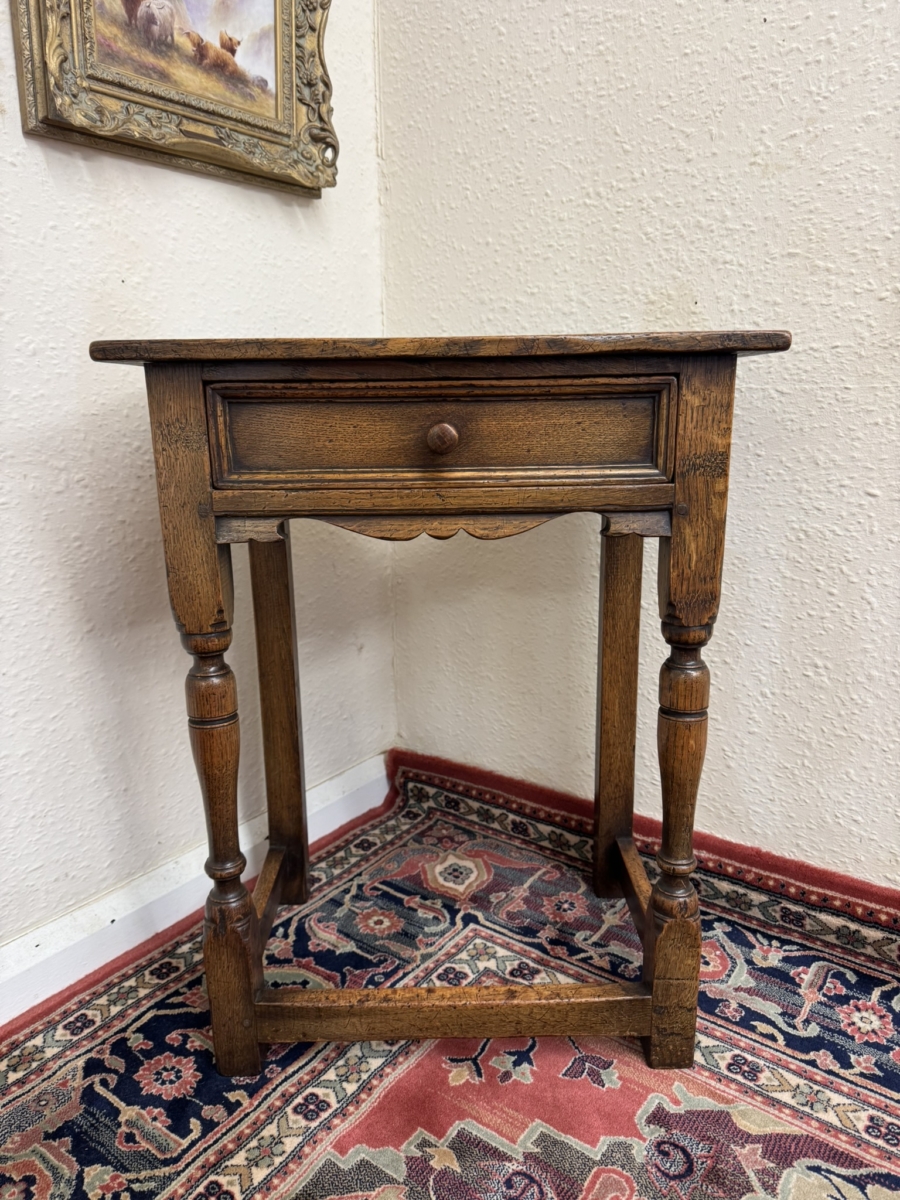 This neat sized table made entirely in solid oak and in excellent condition. The grained oak top sits above a single drawer, the drawer has a turned knob handle. Turned legs to the front, stretcher supports and standing on traditional block feet.