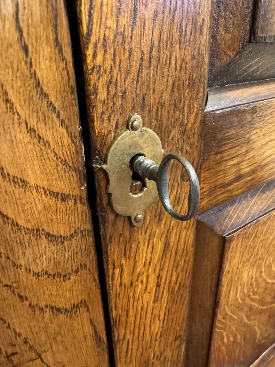 In excellent condition made by the renowned Titchmarsh and Goodwin furniture makers. This corner cupboard has an open top with a boarded back and pair of shaped shelves, below is a recessed panelled lockable door, the door having original brass H hinges, brass escutcheon and key. The corner cupboard stands on bracket feet.
