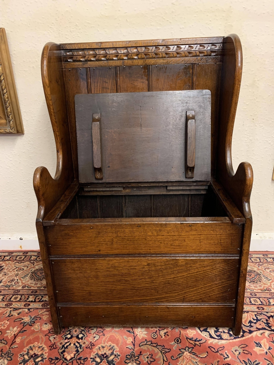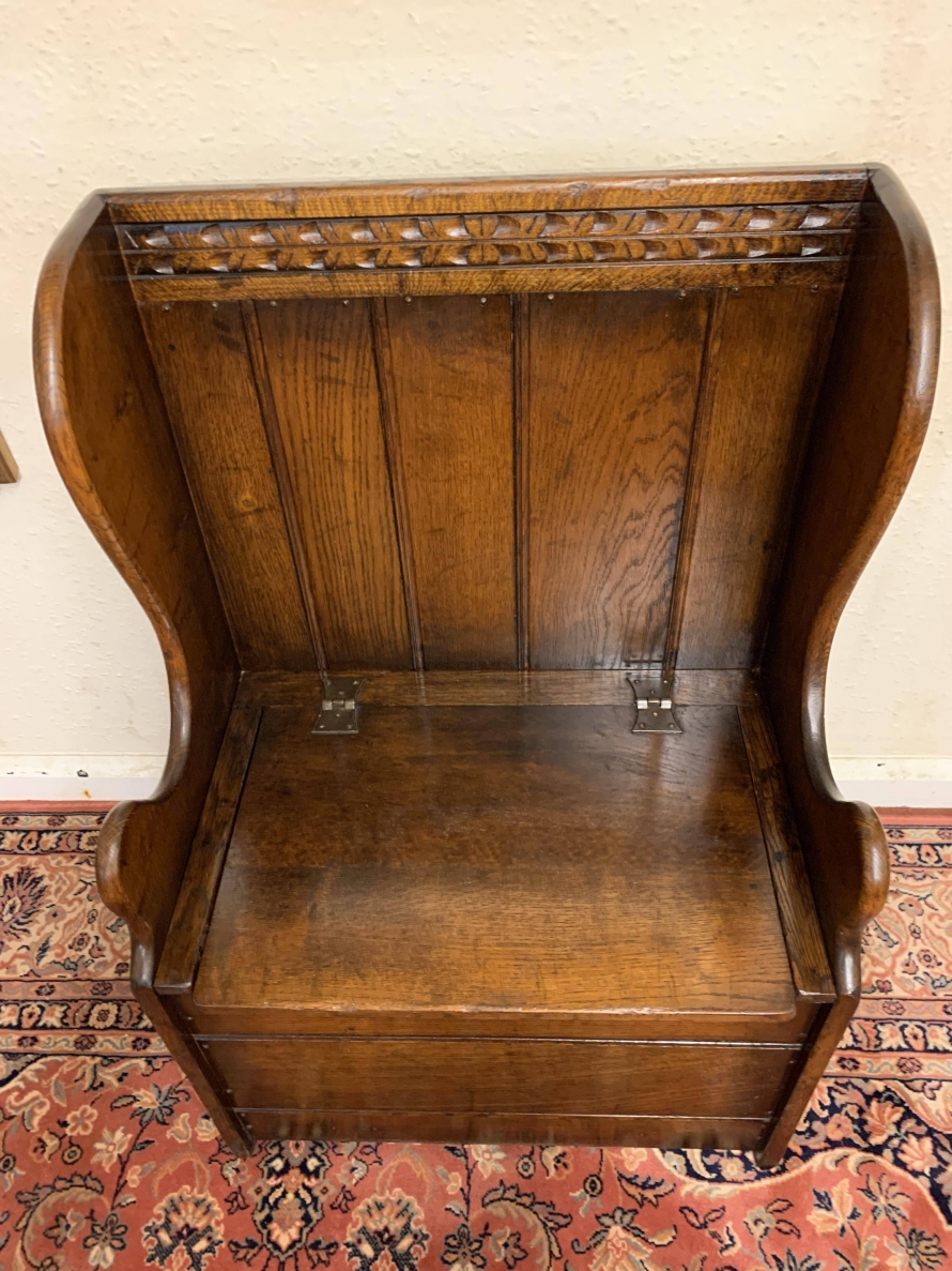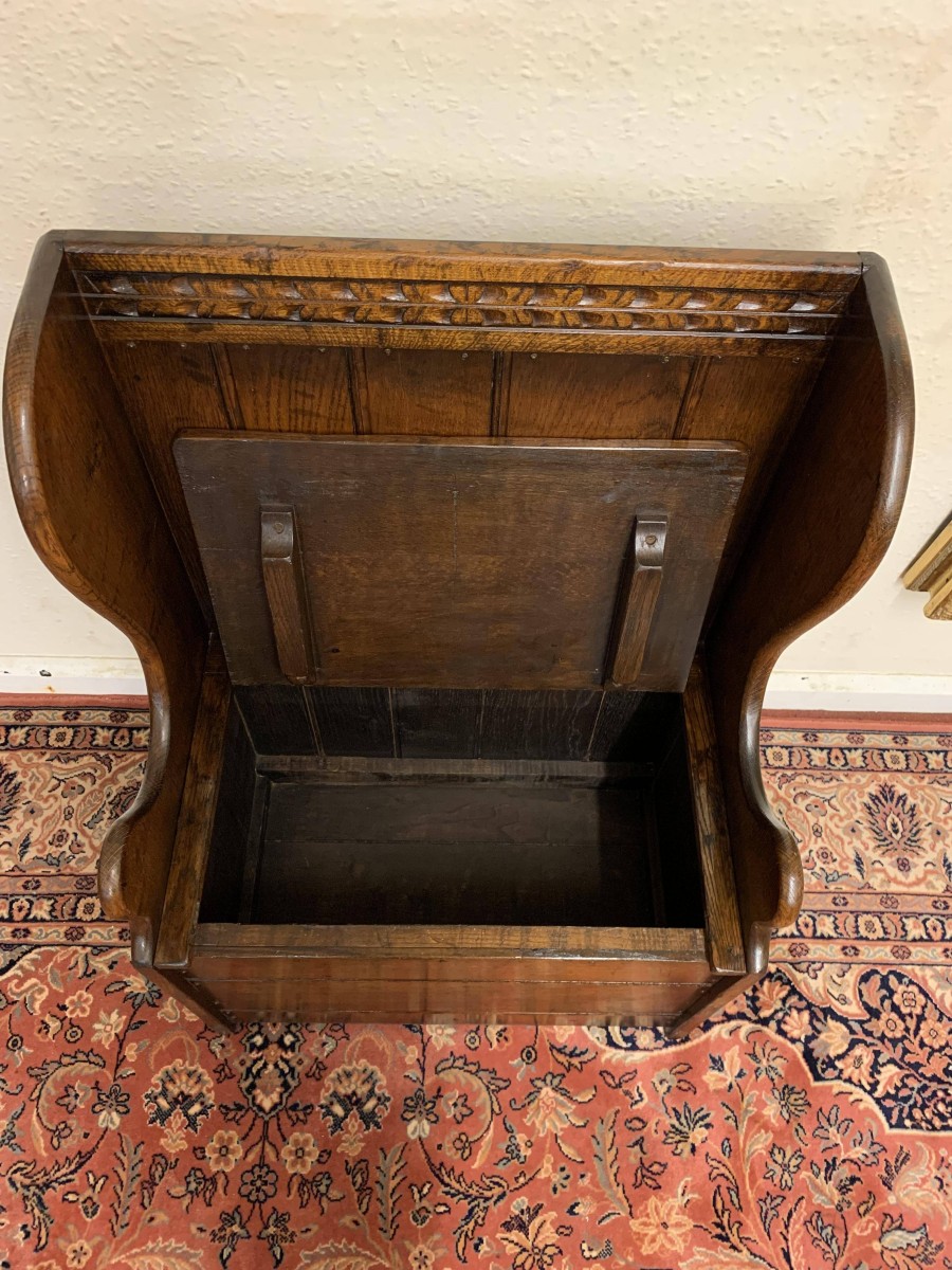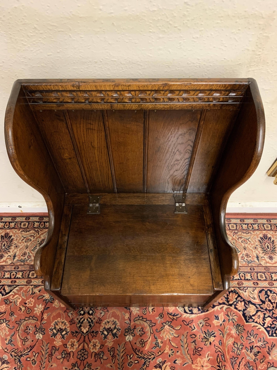 Made entirely in glorious solid oak and produced by the renowned Titchmarsh and Goodwin furniture manufacturer. The panelled back has decorative carving to the top, sweeping arms, lift up lid seat, and a panel front.