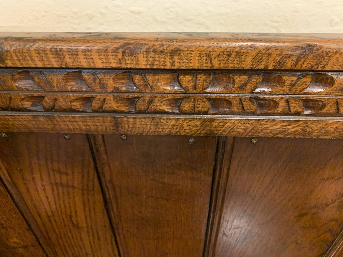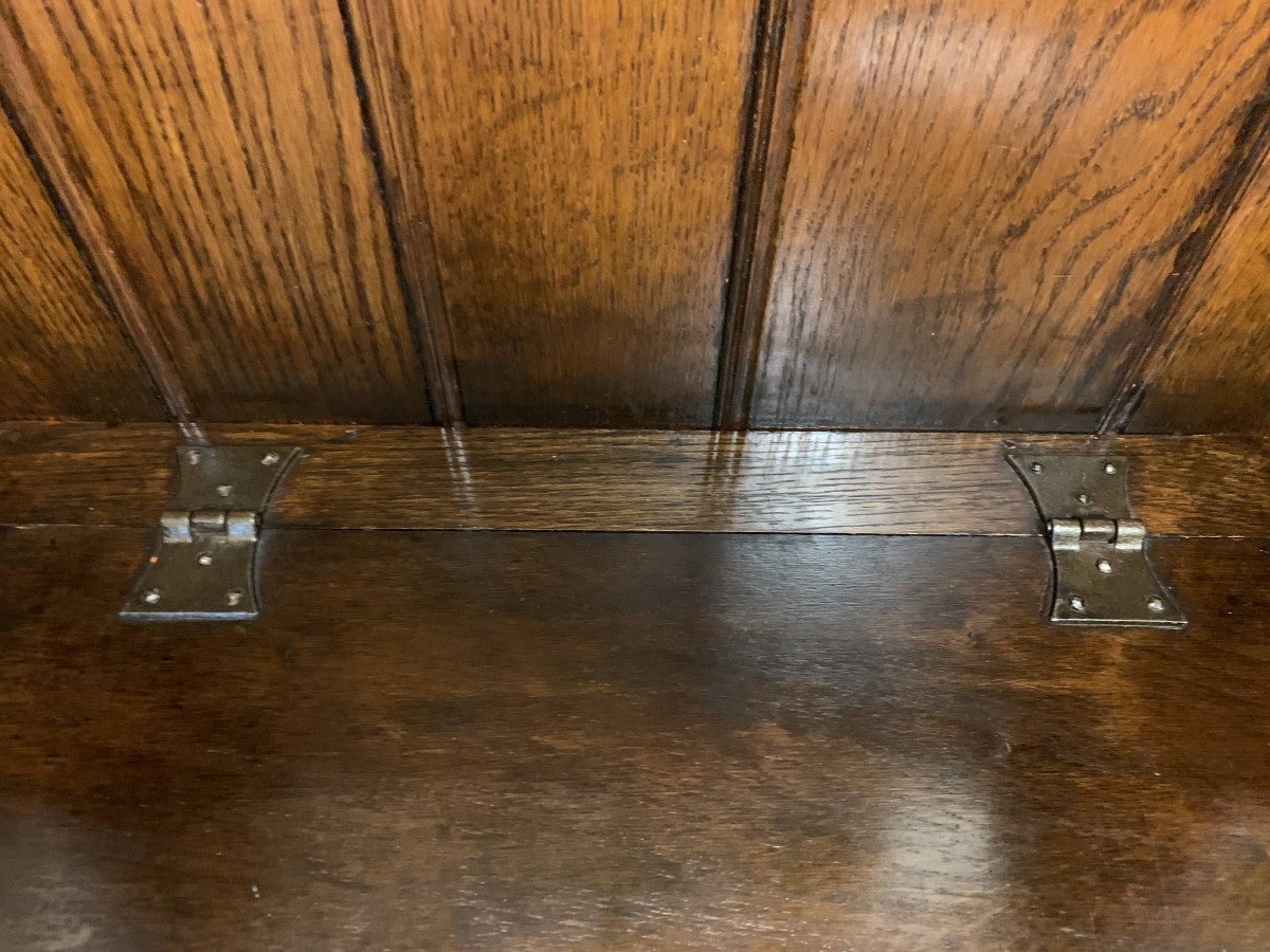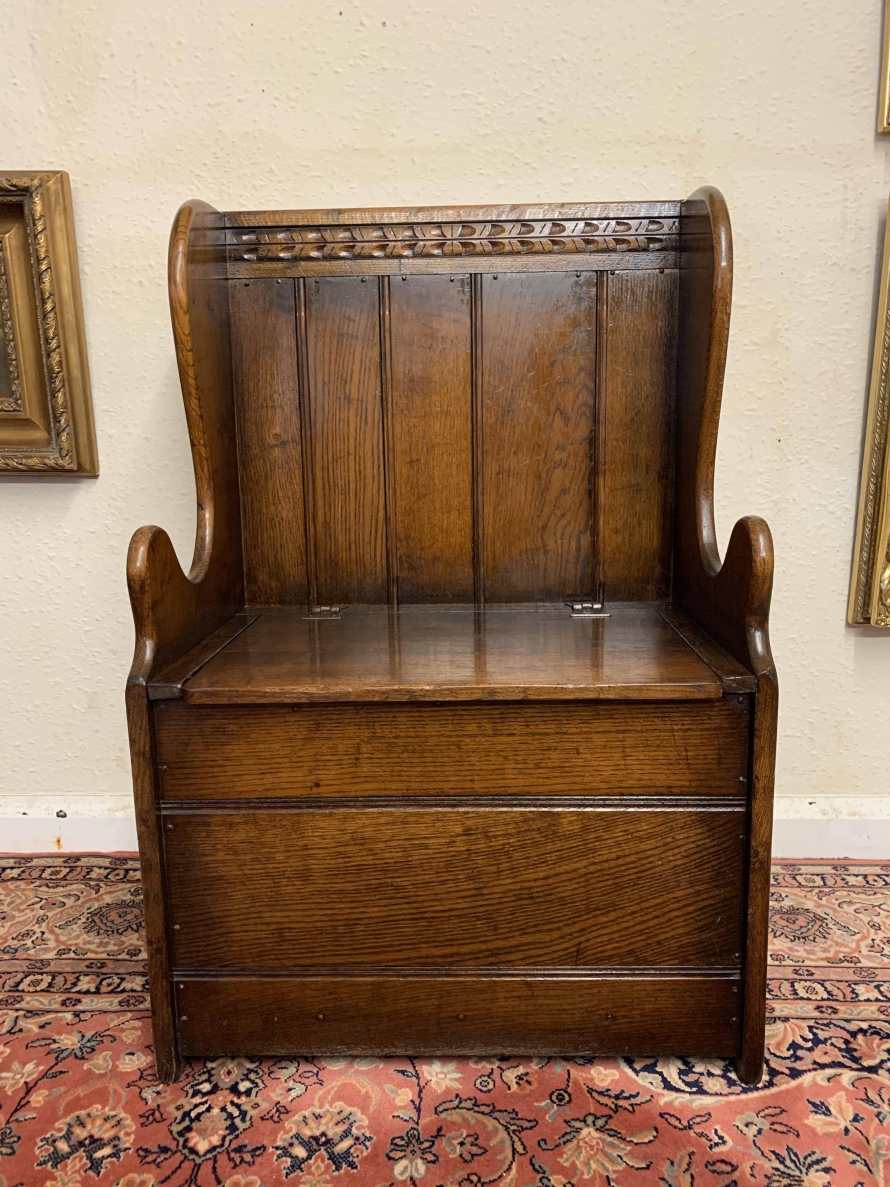 Made entirely in glorious solid oak and produced by the renowned Titchmarsh and Goodwin furniture manufacturer. The panelled back has decorative carving to the top, sweeping arms, lift up lid seat, and a panel front.