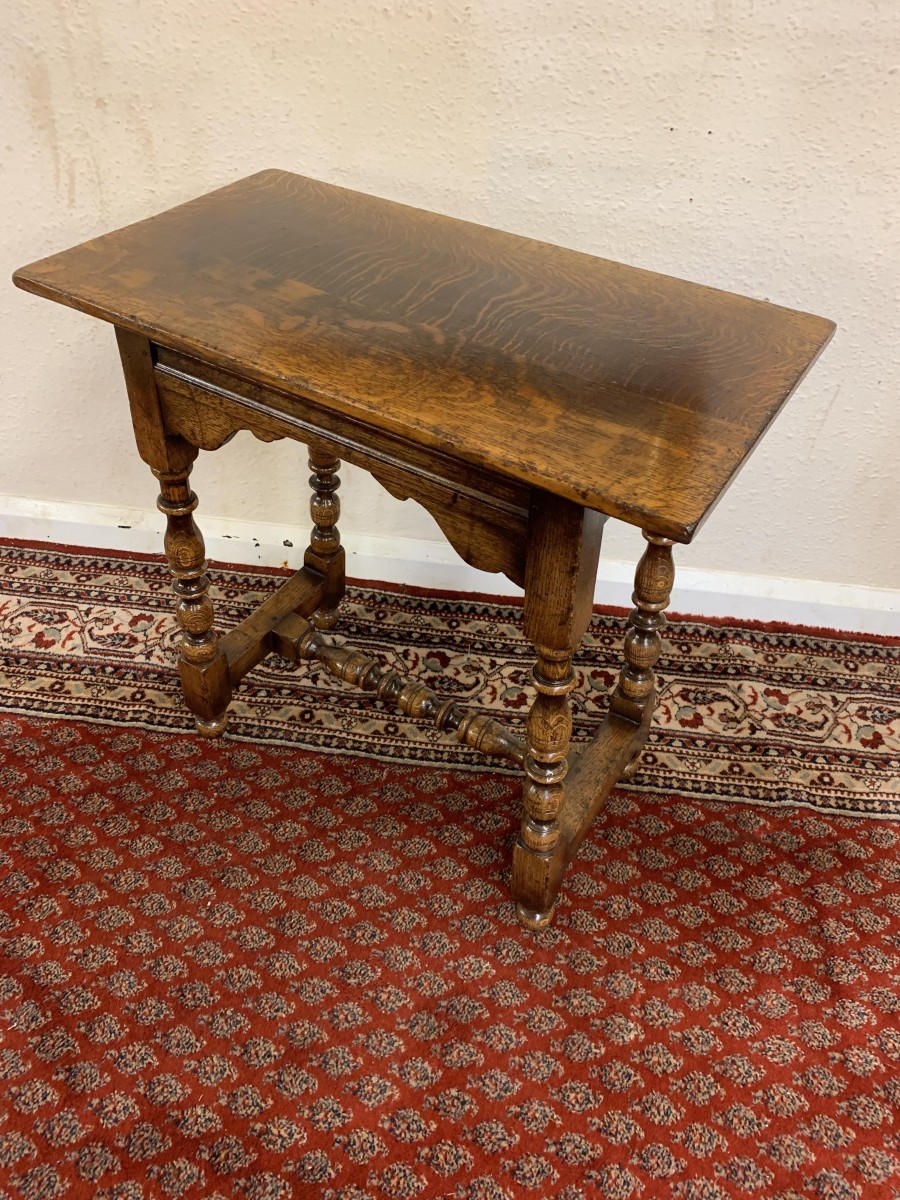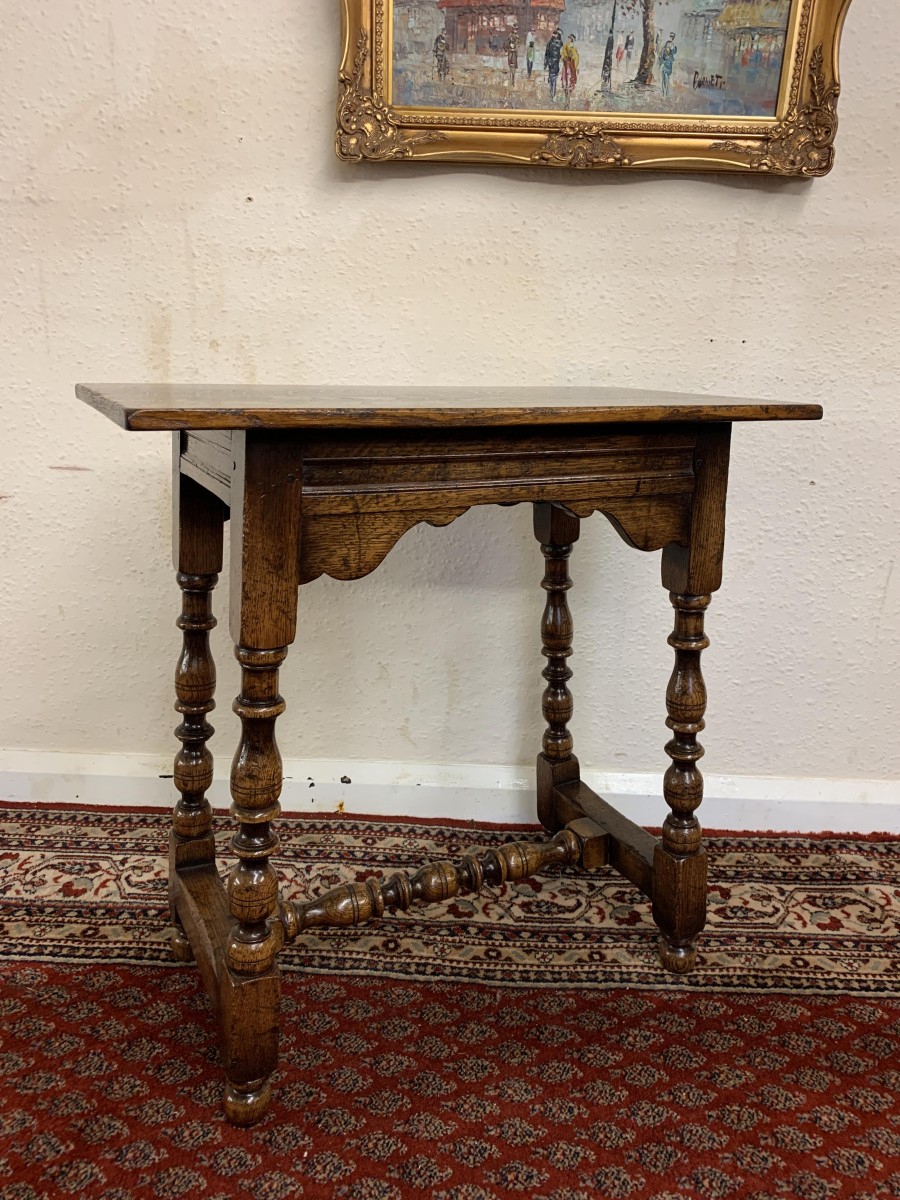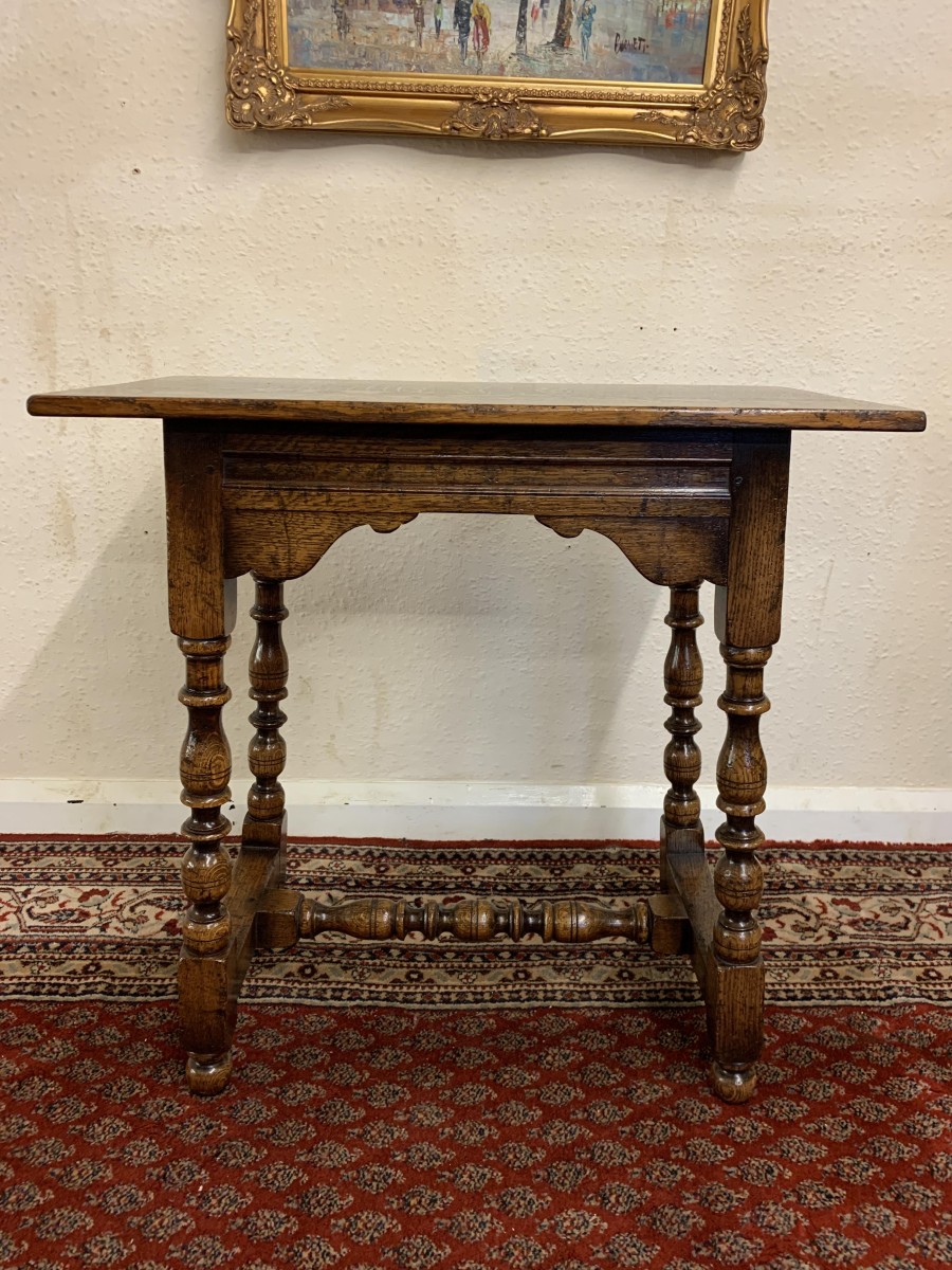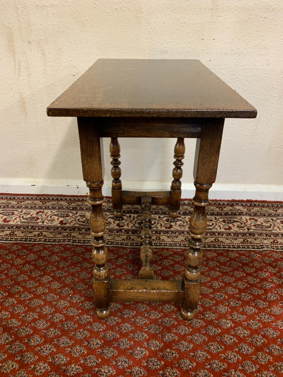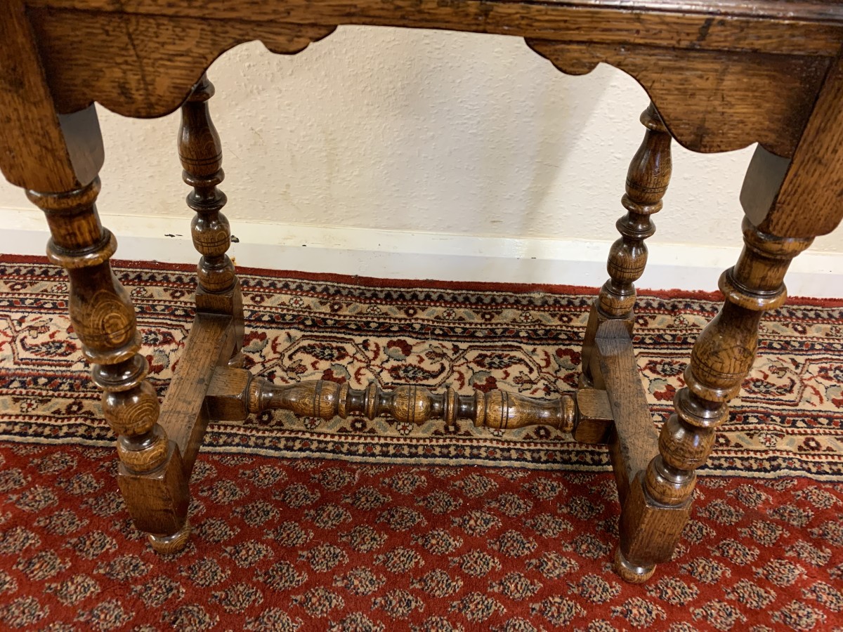 Made in glorious solid oak by the renowned Titchmarsh & Goodwin furniture makers. The oversailing top sits above four elegant turned legs: turned stretcher and standing on four turned feet. Please note this side table is in excellent condition.